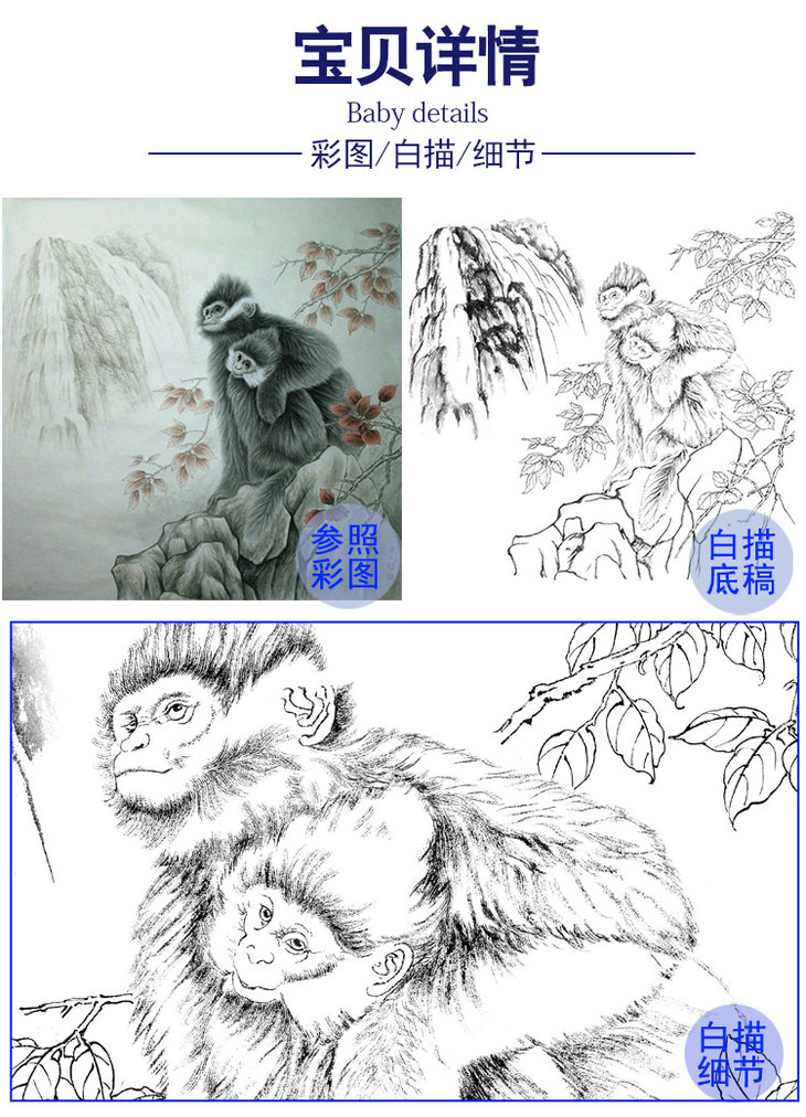 工笔动物白描底稿-李保山-猴《企望》-斗方小品册页-多种白描尺寸可选-EL27