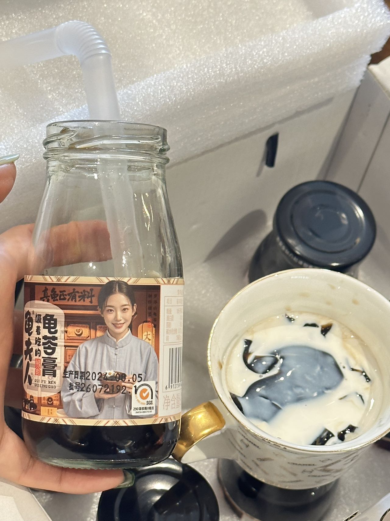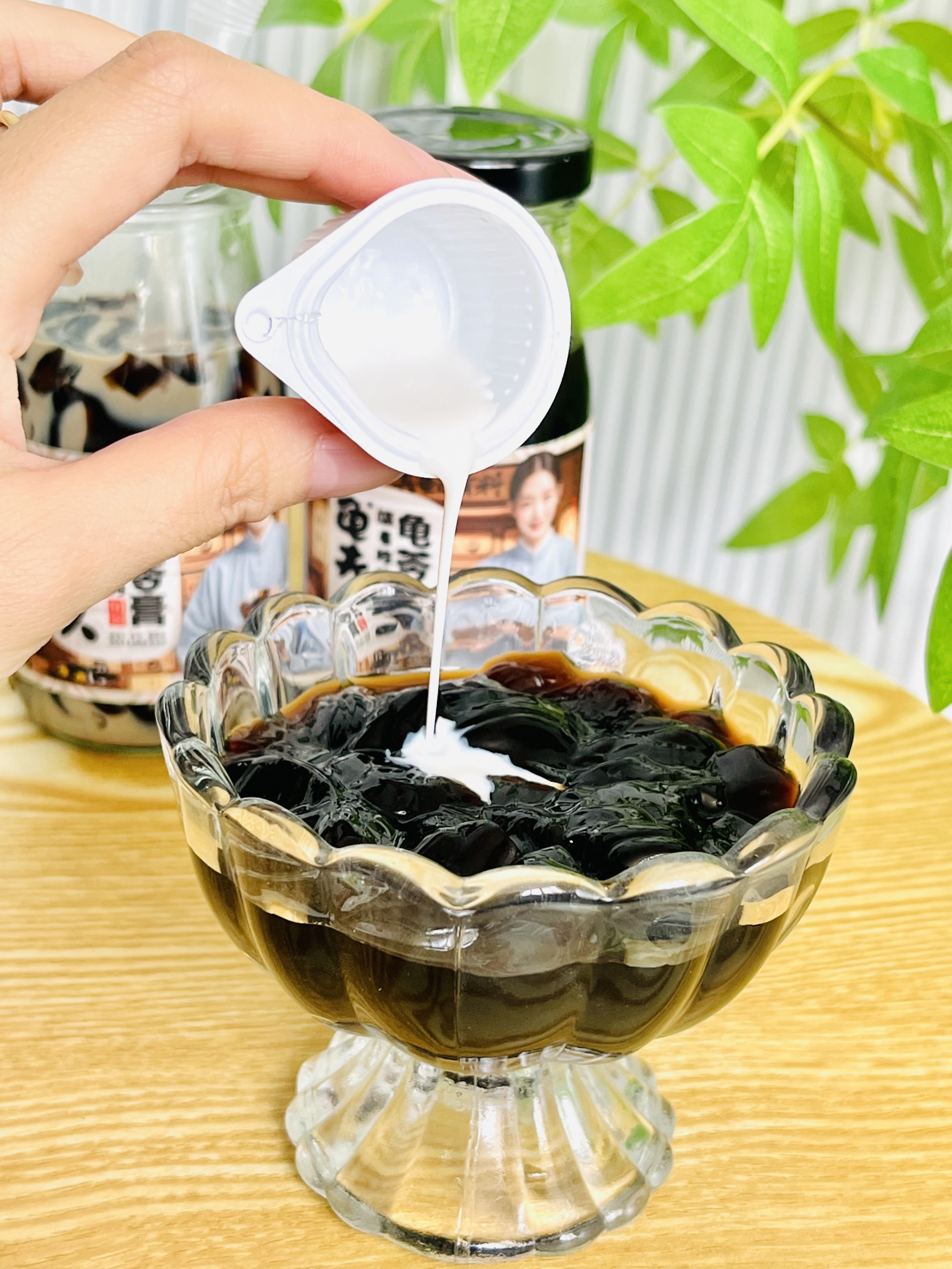这款非遗龟苓膏还可以吸着吃!(配有吸管!)把奶油球一倒,就可以像喝奶茶一样咕咕喝着吃了!入口浓浓奶香搭配清凉的草本味,绝!