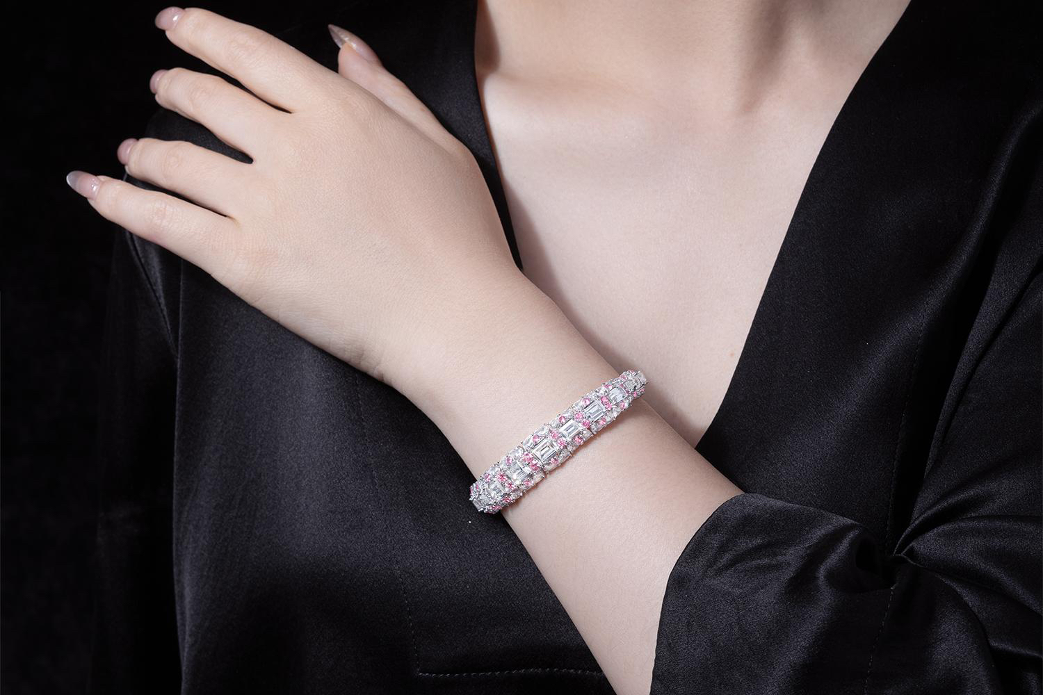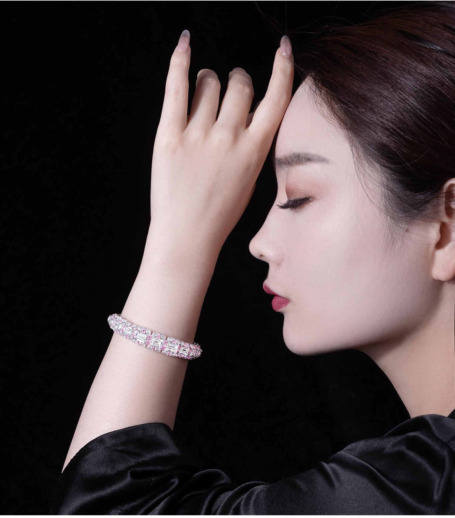 GAONAS 925银合成锆石手镯 时尚设计重磅豪镶粉白开口手镯10496SP