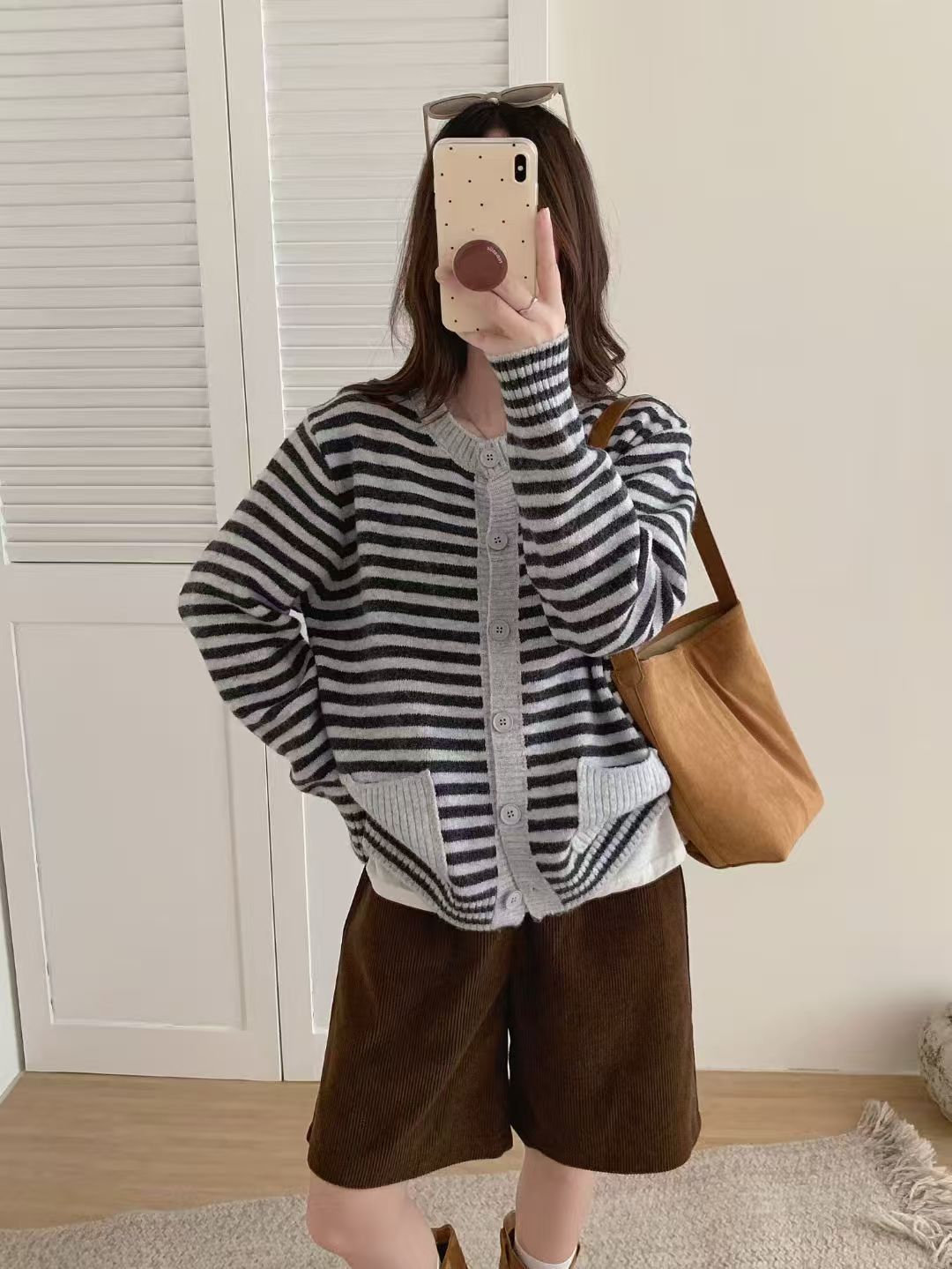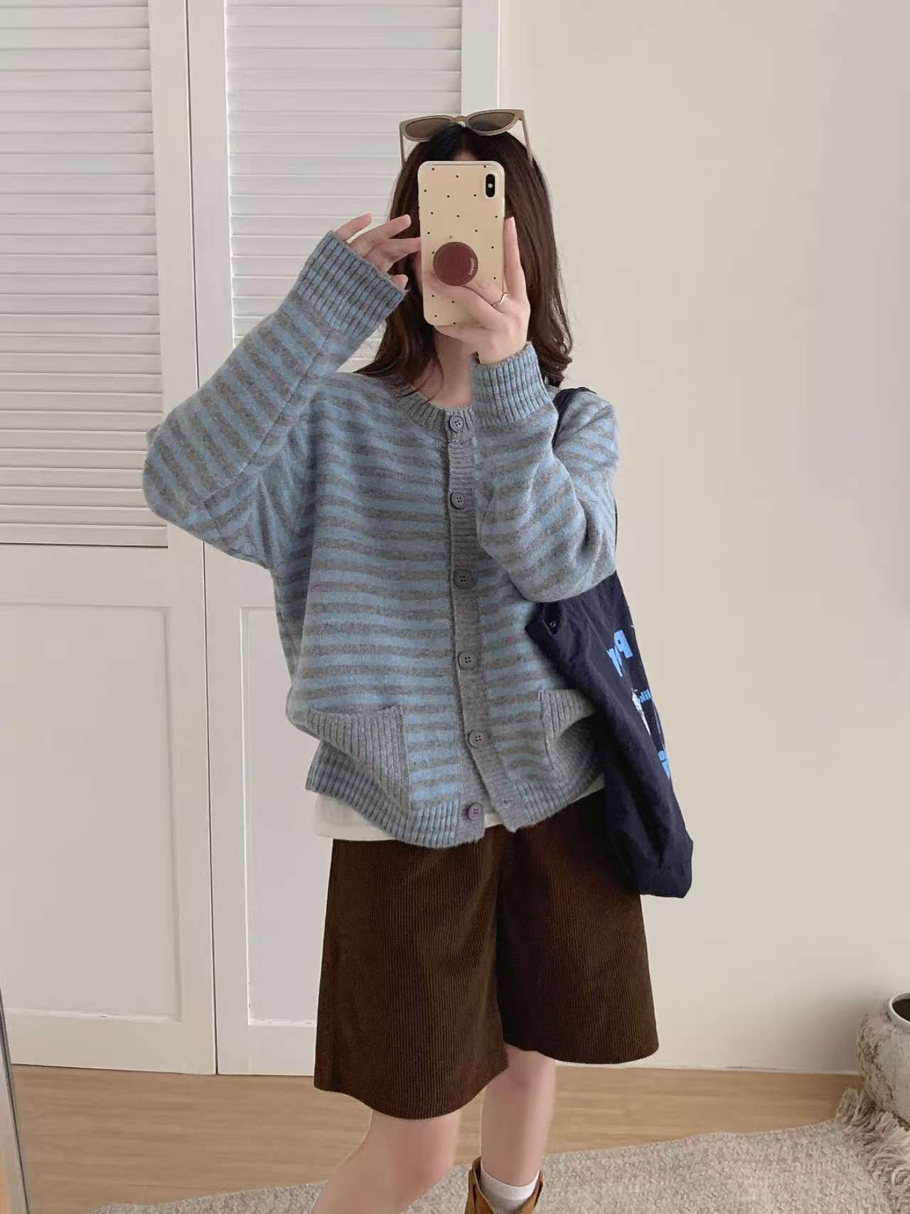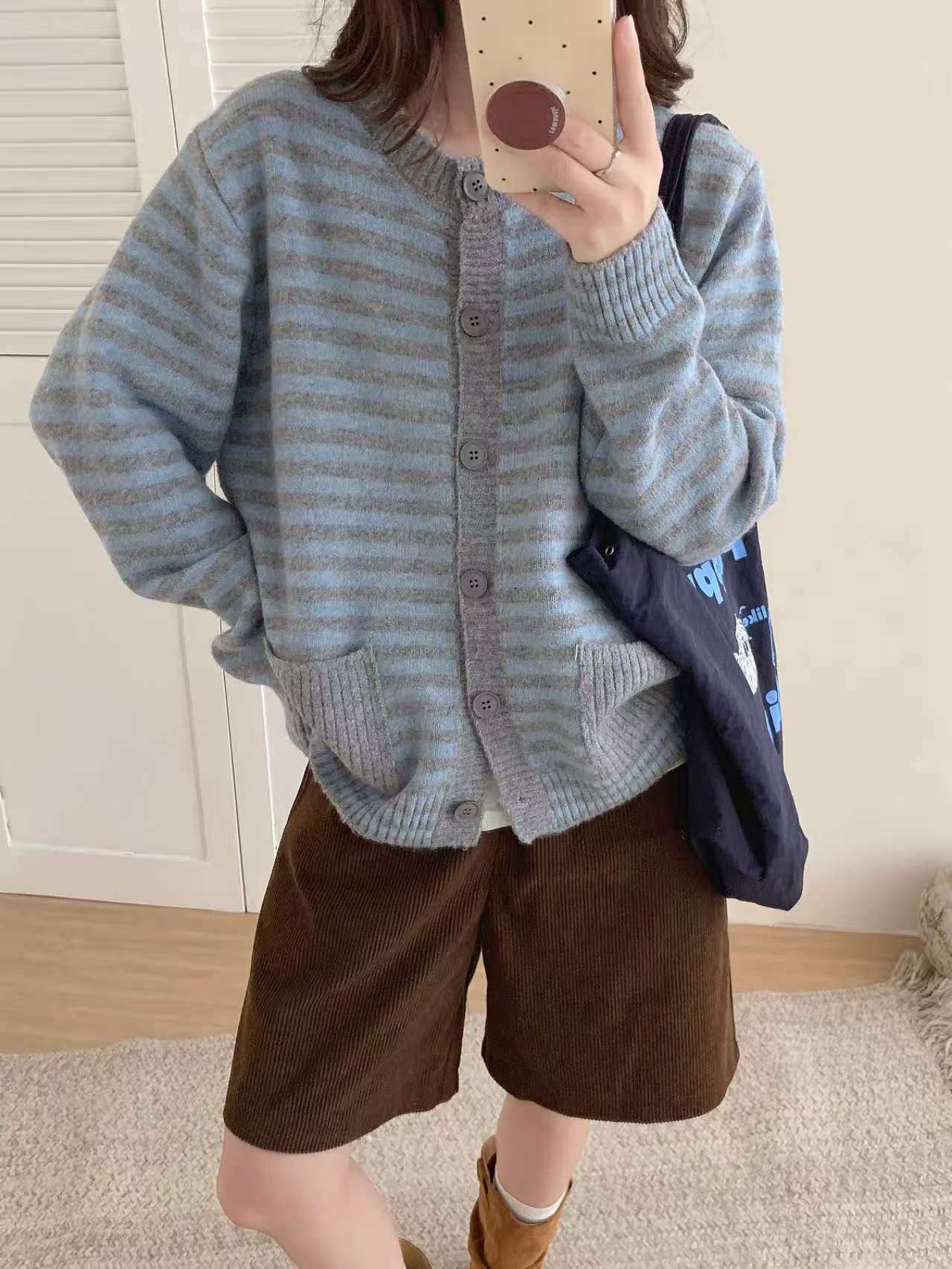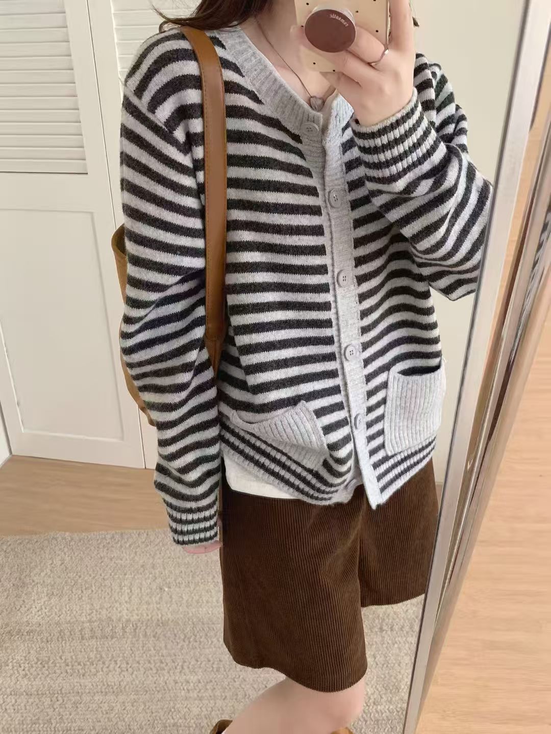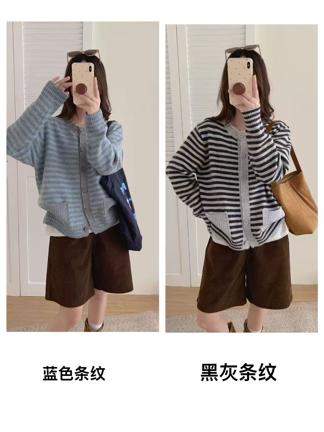 【自营】跨年福利-【超美毛衣】开衫-Z090韩系慵懒风宽松条纹撞色毛衣-喜出