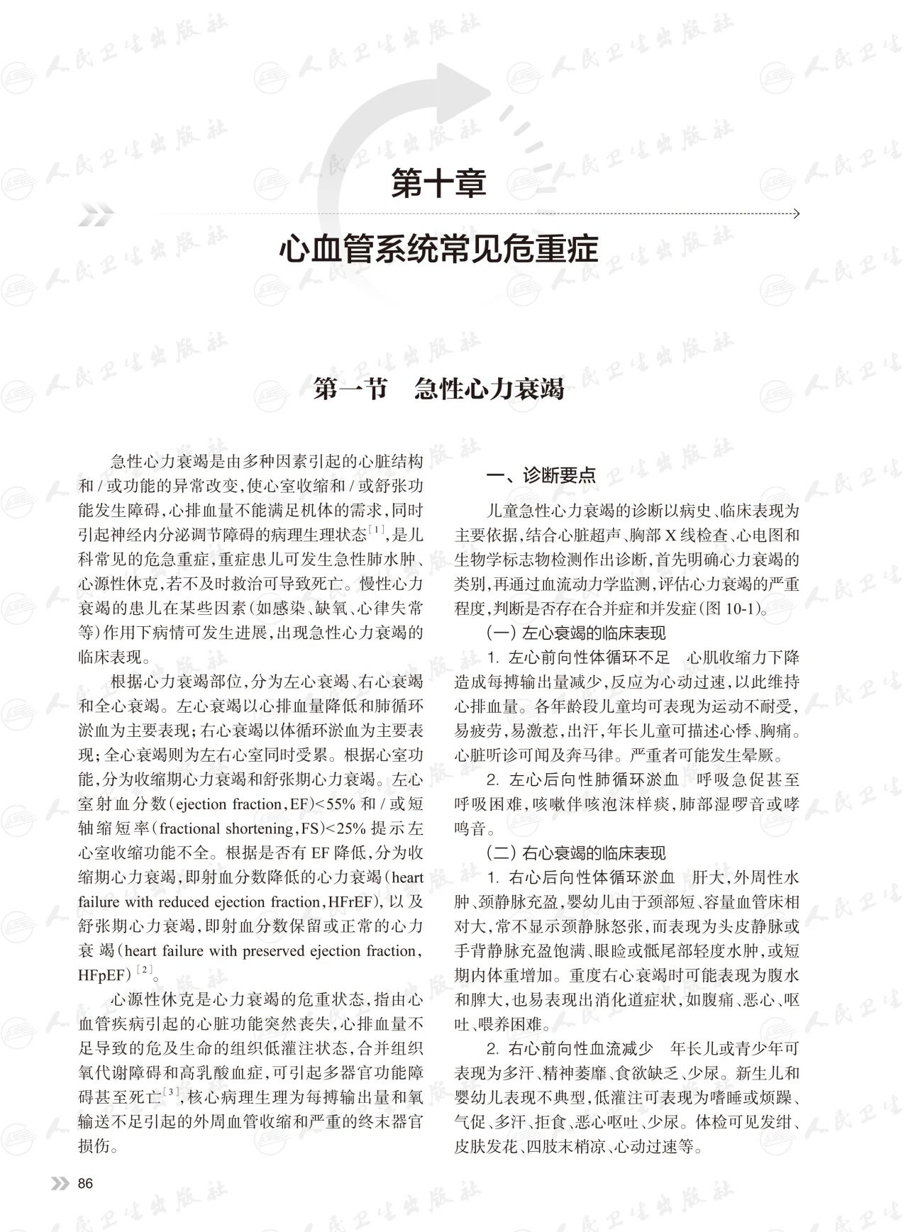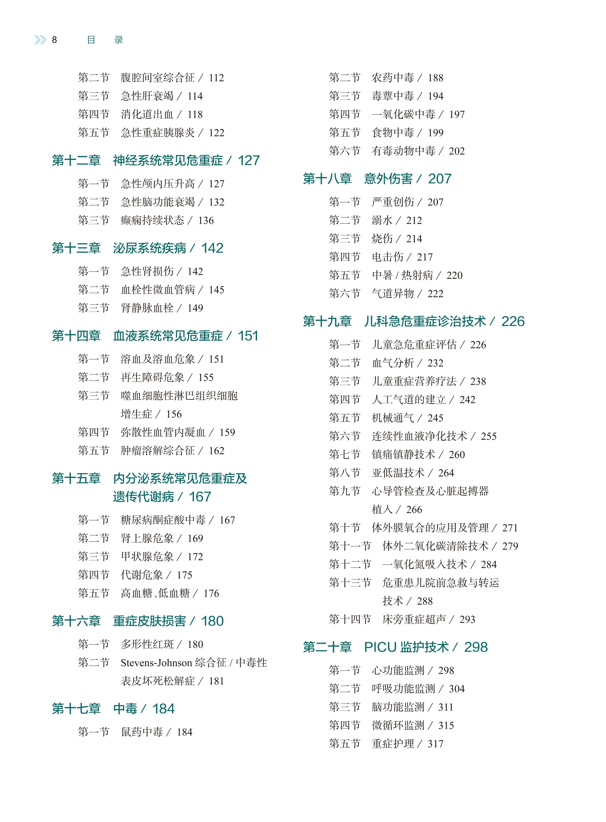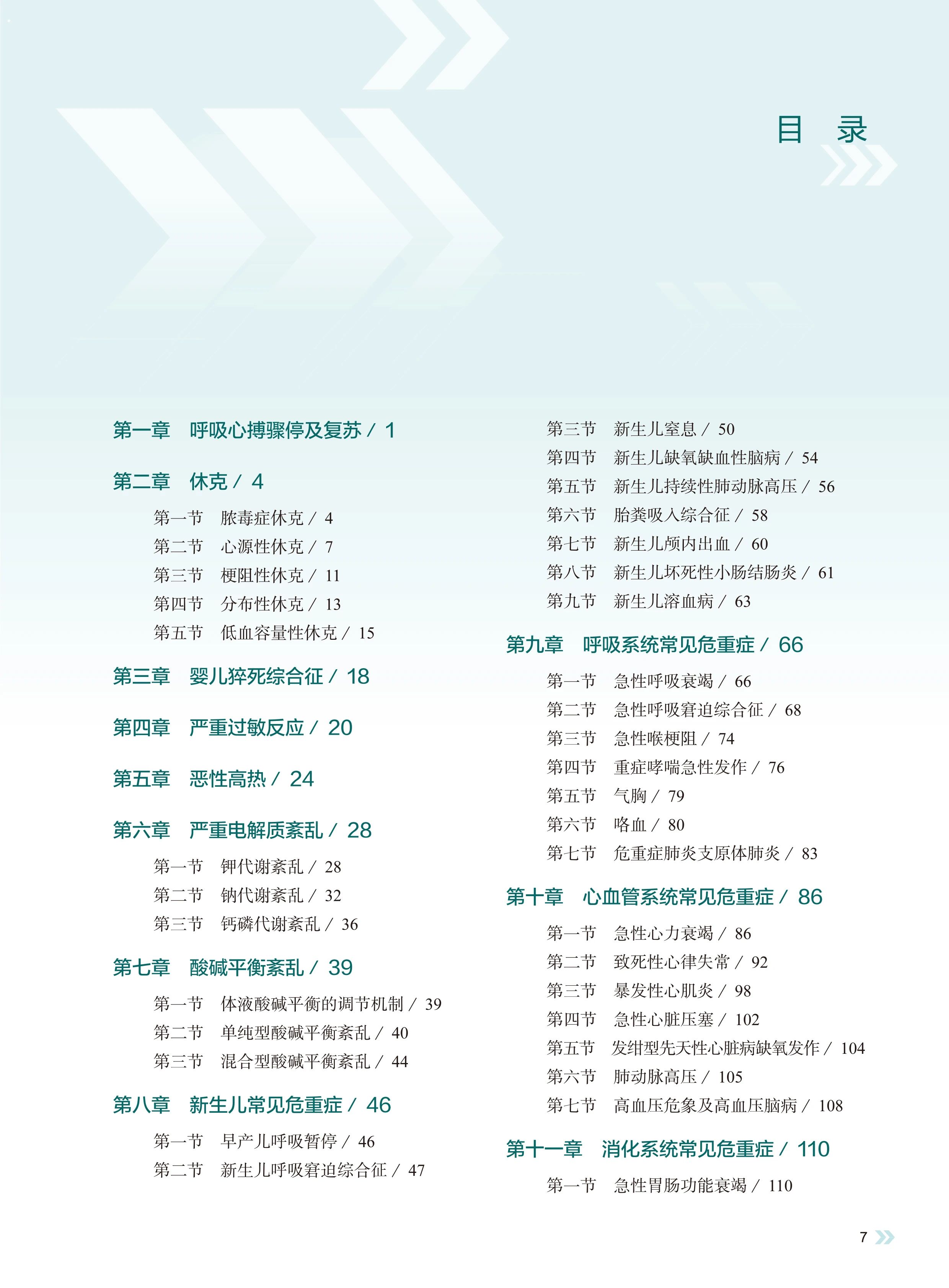 2.系统阐述各类急危重症的诊断要点和治疗要点,重点讲解规范化救治流程、关键操作技巧、并发症处理。并设置独立章节介绍儿科急危重症关键诊治技术,如危重症评估、机械通气、血液净化、院前转运等。