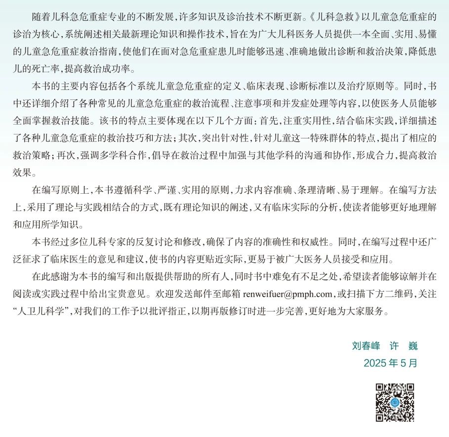 1.本书由刘春峰教授、许巍教授领衔,联合三十余位儿科急危重症领域的资深专家共同编写,确保书中内容源于实践、指导实践,具有极强的实用性和可操作性。