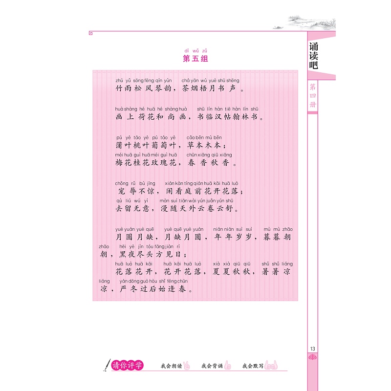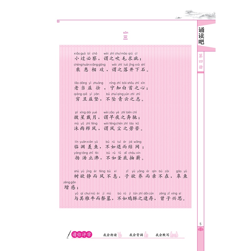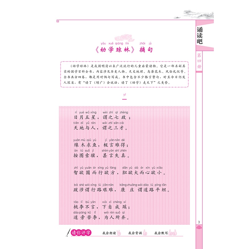本书根据学生的年龄特点和认知水平,按照由浅入深、循序渐进的原则,精选古今中外优秀经典文学作品,分编为六册,分六年读完,内容涉及《三字经》、《弟子规》等蒙学经典、对韵歌、古对联、四书五经名句、经史子集选段、古诗词曲、小古文及现代童诗等等。其中蒙学2部,对韵歌30则、对联80句,经史子集涵盖四书、大学、礼记、庄子、老子、易经、黄帝内经等经典名句,古诗300首、词90篇、曲60篇、民国课文及小古文100篇,现代诗歌180篇等。本书采用必读和选读的方式供学生自主选择。其中诗词曲为本书的重点内容,与课程标准规定的必背内容接轨,与浙江教育厅规定的必备古诗词接轨。在编排形式上,凡古代部分一律注音,并以“帮你理解” “助你欣赏”等板块设计,便于学生诵读。基于对教育的本质思考与追求,着眼于语文素养的提升和健全人格形成,期望通过不同形式的活动和评价,持久孩子们的诵读兴趣。