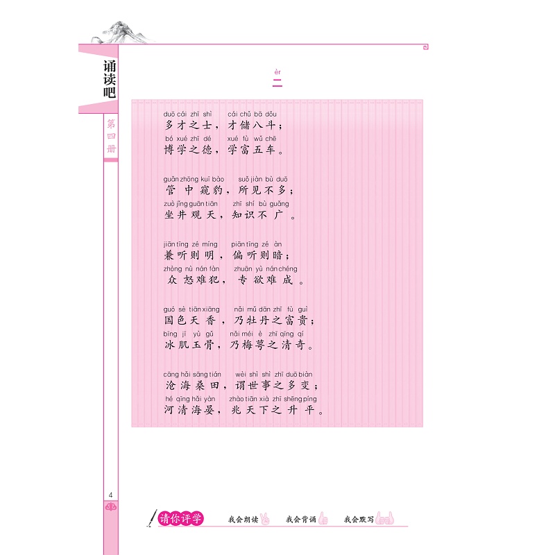 小学生经典诵读课程是一门关注孩子的注意力、记忆力、想象力、文化底蕴、人格修养等,提升可持性发展的潜力的课程。它能丰富人内涵、开阔人胸襟、净化人灵魂,启迪人智慧。基于此思考,编者开发了这套校本教材《诵读吧》。