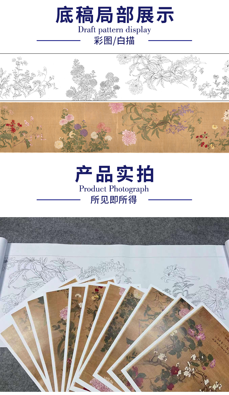 【长卷】工笔花鸟画白描底稿古画长卷恽寿平《百花图卷》多种白描尺寸可选G040