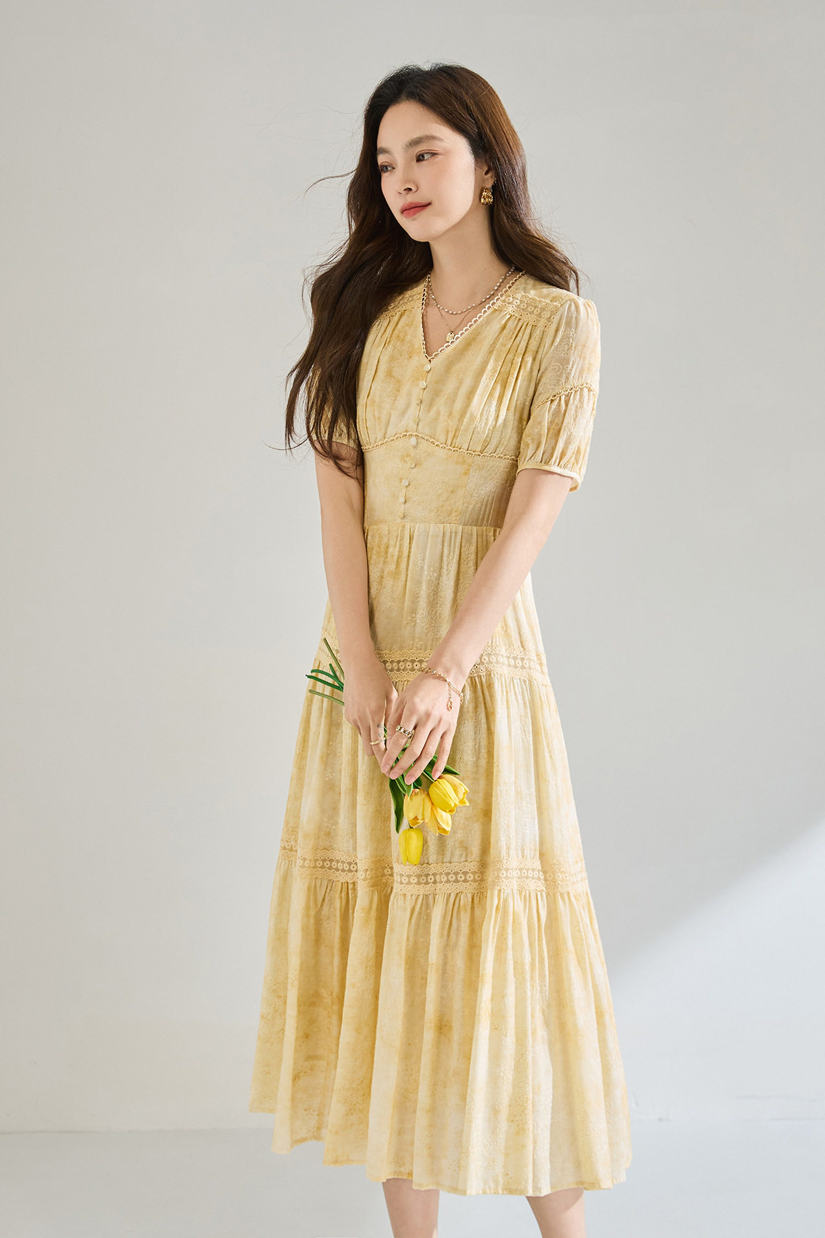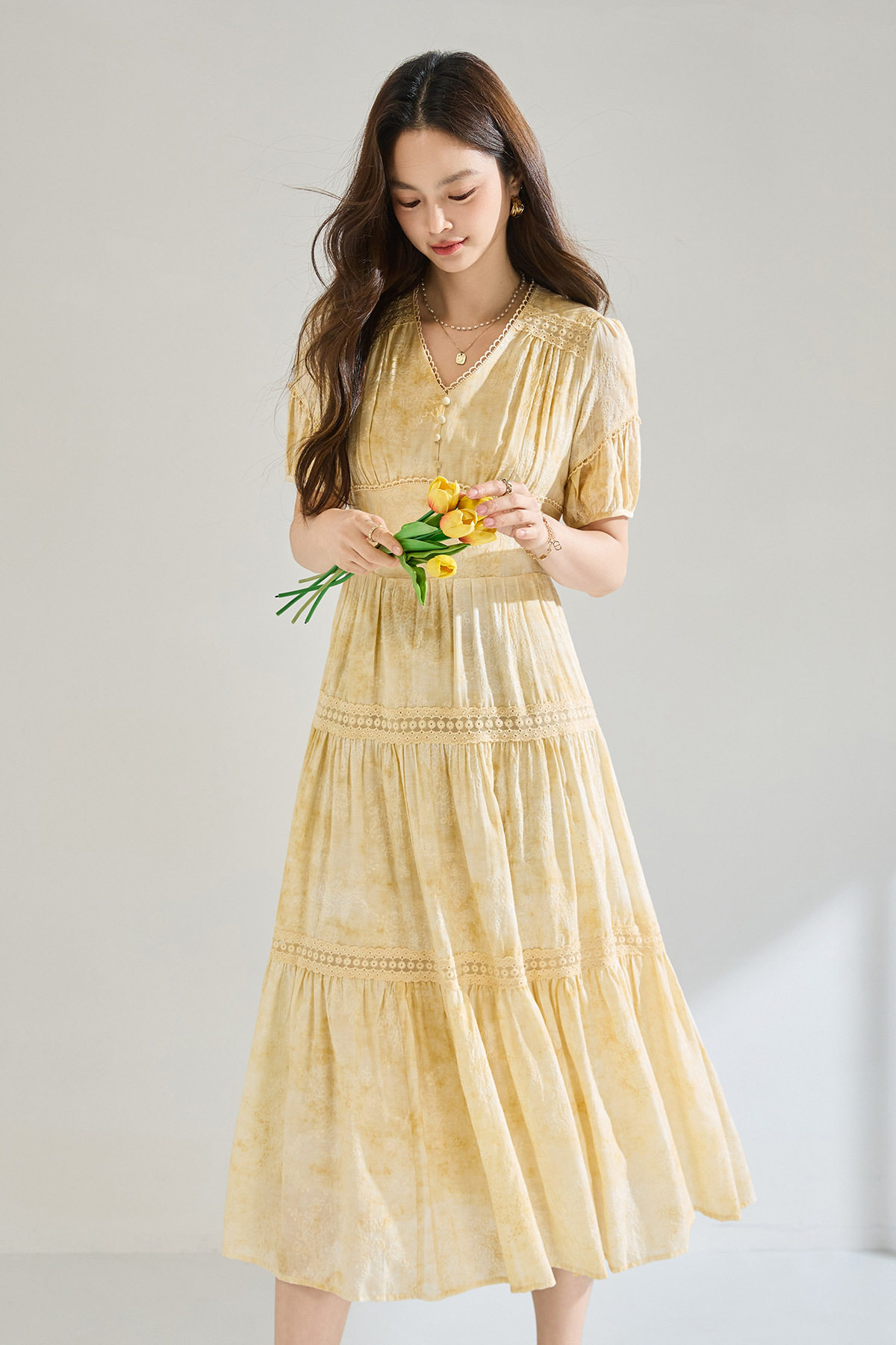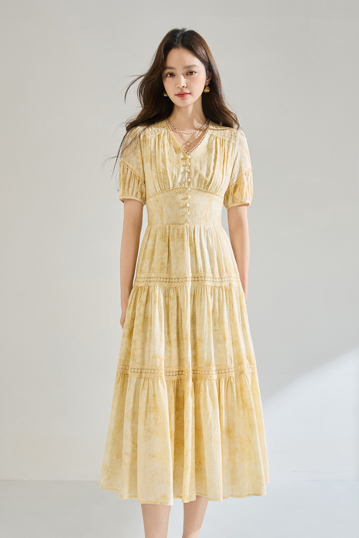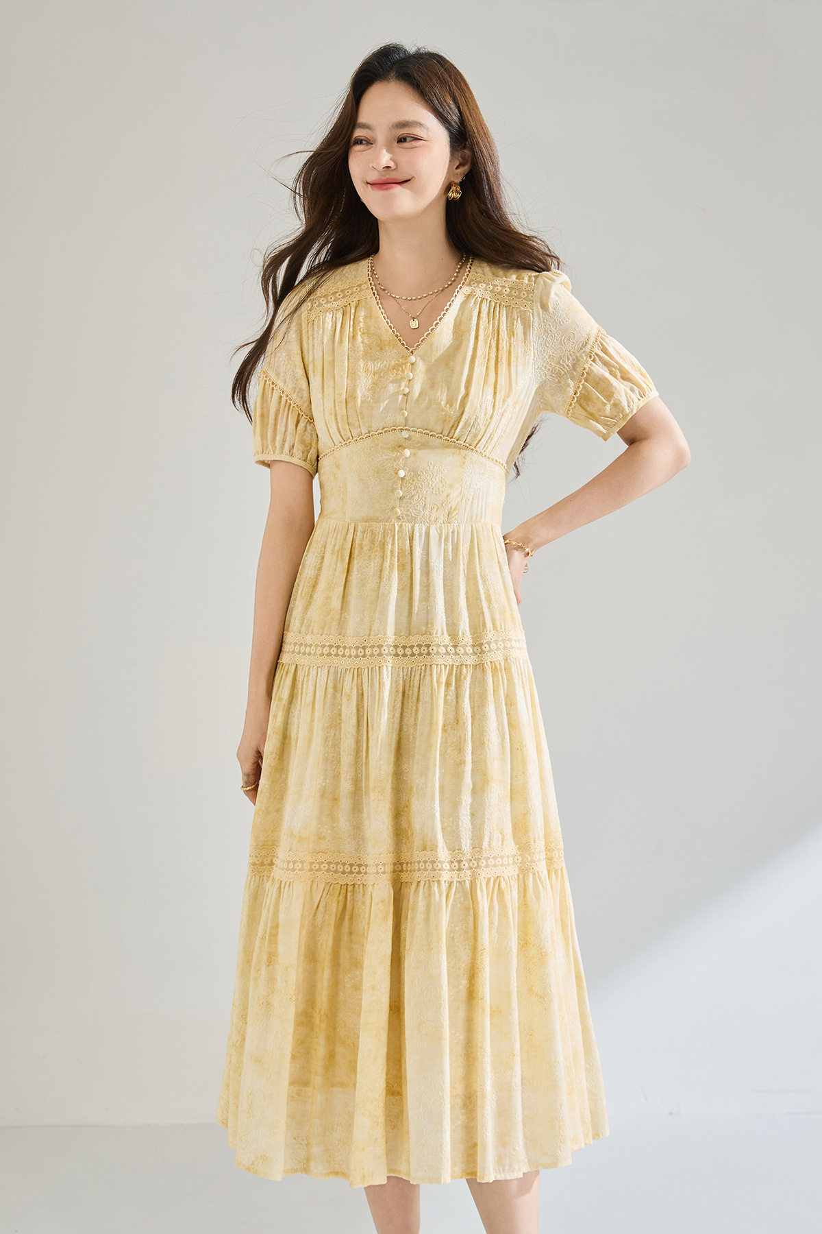 「高货sh」全新升级【铂金会员330/天猫449/差价119】(12958)洛诗琳莱赛尔天丝刺绣连衣裙2026炒色工艺V领蕾丝拼接裙