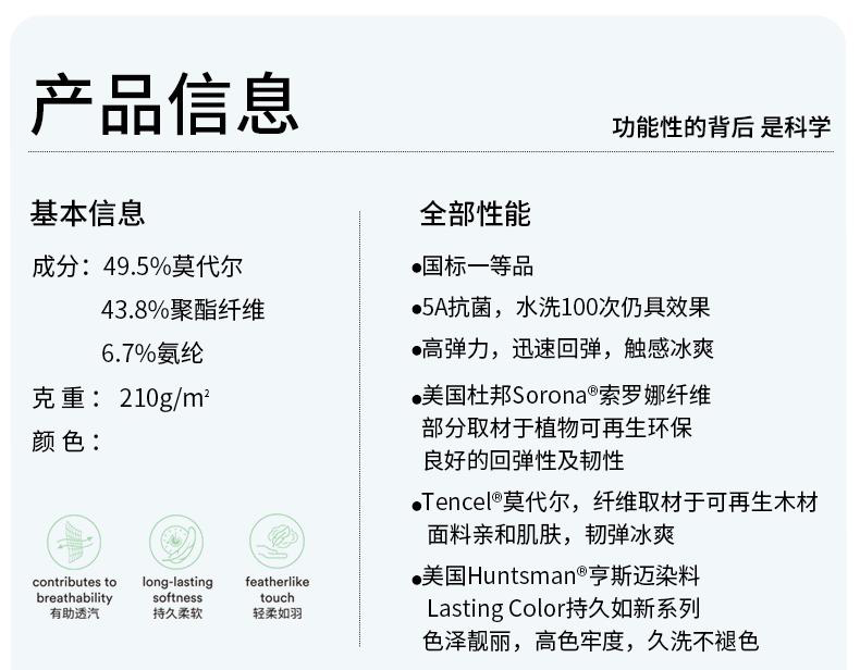 面料:49.5%莫代尔 43.8%聚酯纤维 6.7%氨纶