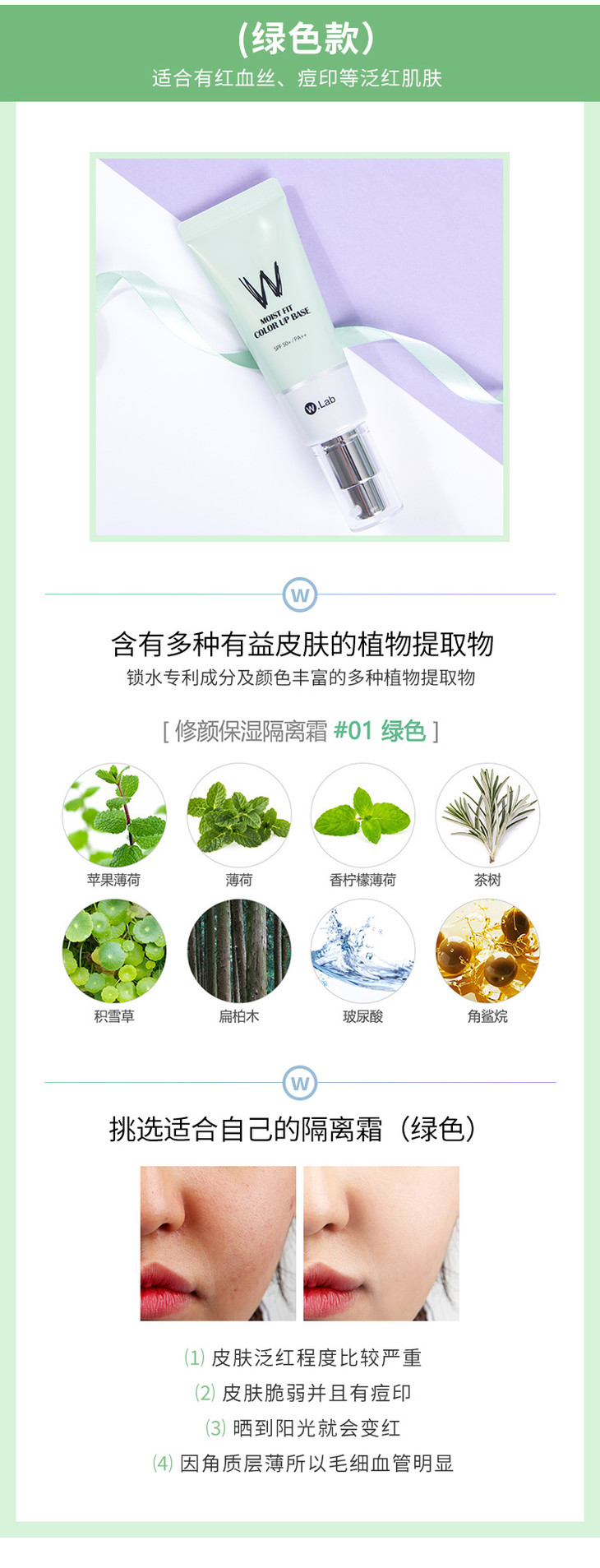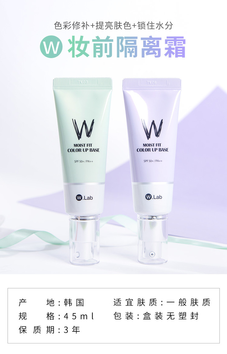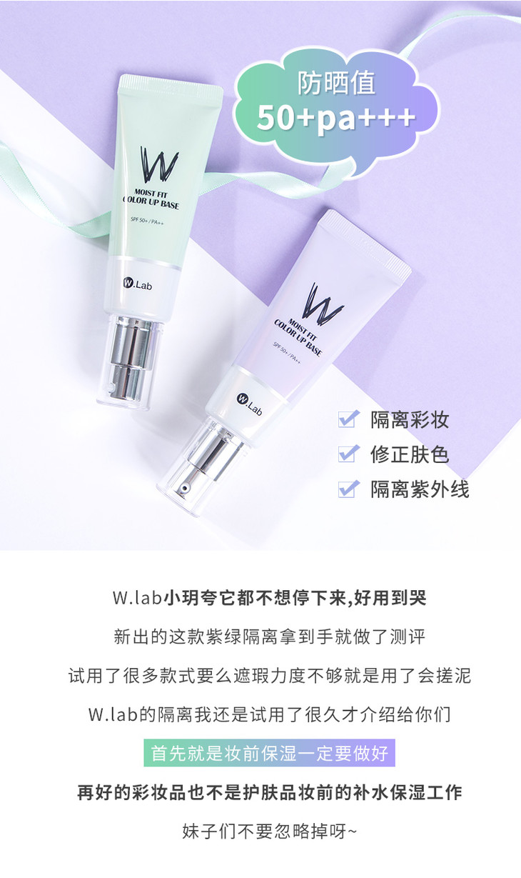 W.Lab紫色防晒隔离霜 45ml◆紫色:适合黄皮或者皮肤暗沉的宝宝Pony大神推薦🔥🔥它的质地是属于💦水润款的,春夏秋冬都适合,均匀的涂抹在脸上,👌🏻上脸后也不会粘腻,脸上不会有油膩膩黏住的感觉,很清爽🌿☀️自带SPF50+的防晒指数,即使不爱化妆的妹子也可以当做防晒功能的素颜霜使用,上脸涂抹均匀就是清透比较轻薄的底妆效果💗