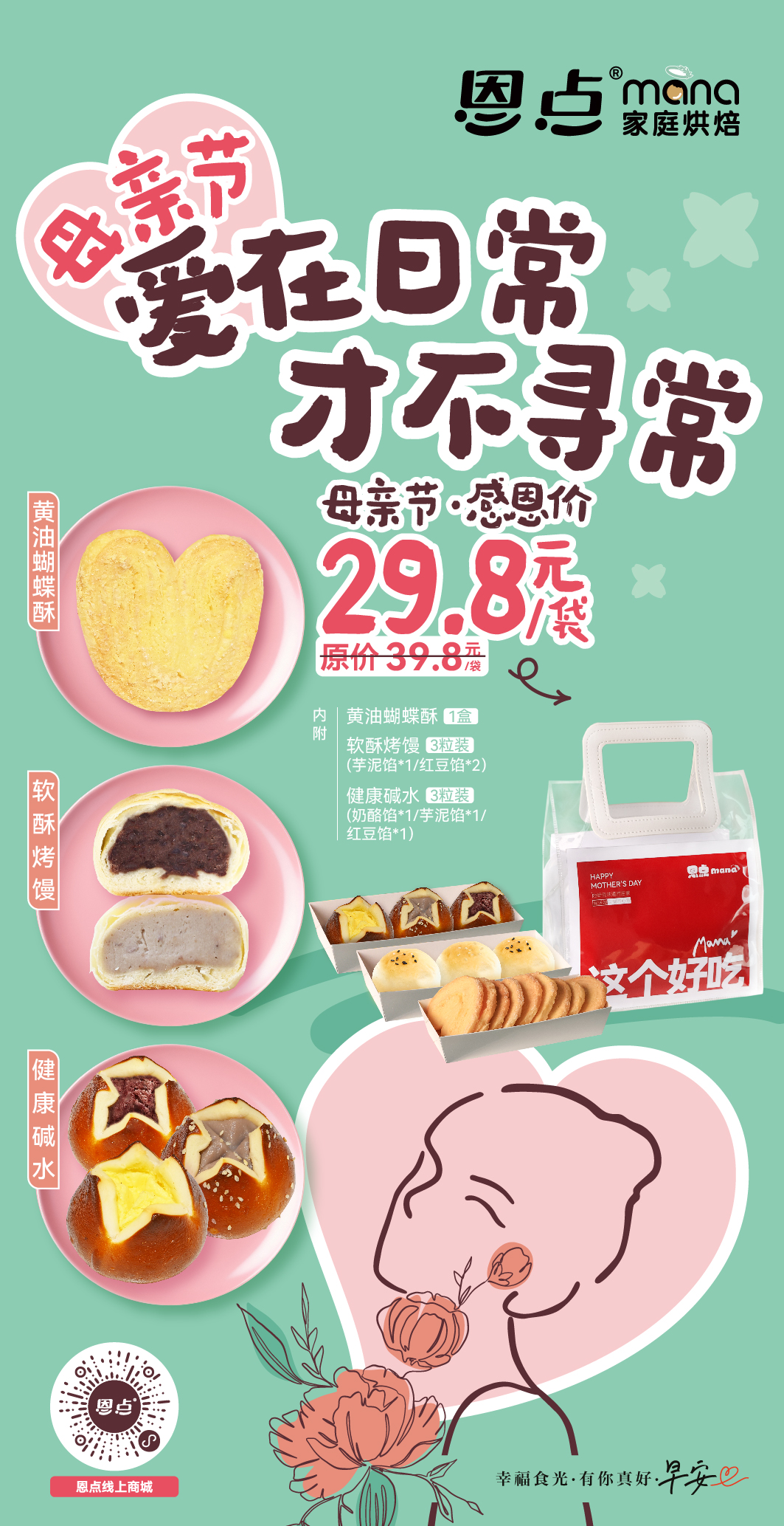 【恩点】母亲节甜点专属礼袋 | 黄油蝴蝶酥1盒&软酥烤馒1盒&健康碱水包1盒 | 爱在日常,才不寻常 【自提】