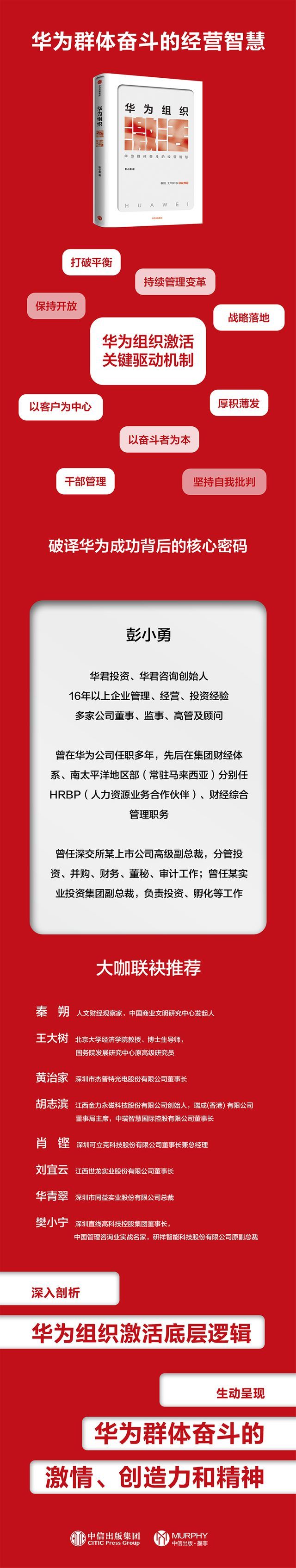 (1)企业管理新指南。揭示华为持续激发组织活力、增强组织能力、提升组织绩效的关键驱动机制,破译华为成功背后的核心密码。