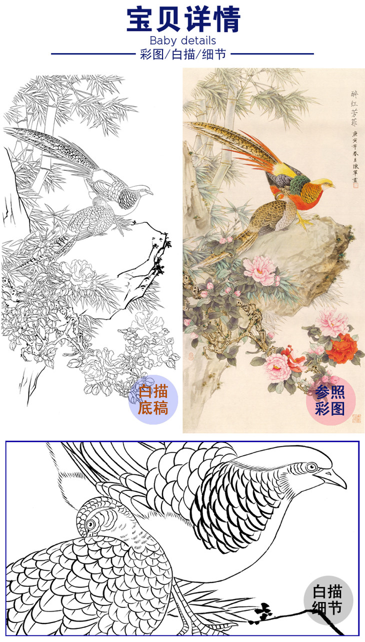 【有步骤、大彩图】李晓明工笔画白描底稿《长寿永昌》牡丹寿带鸟初学者临摹花鸟线稿KD24