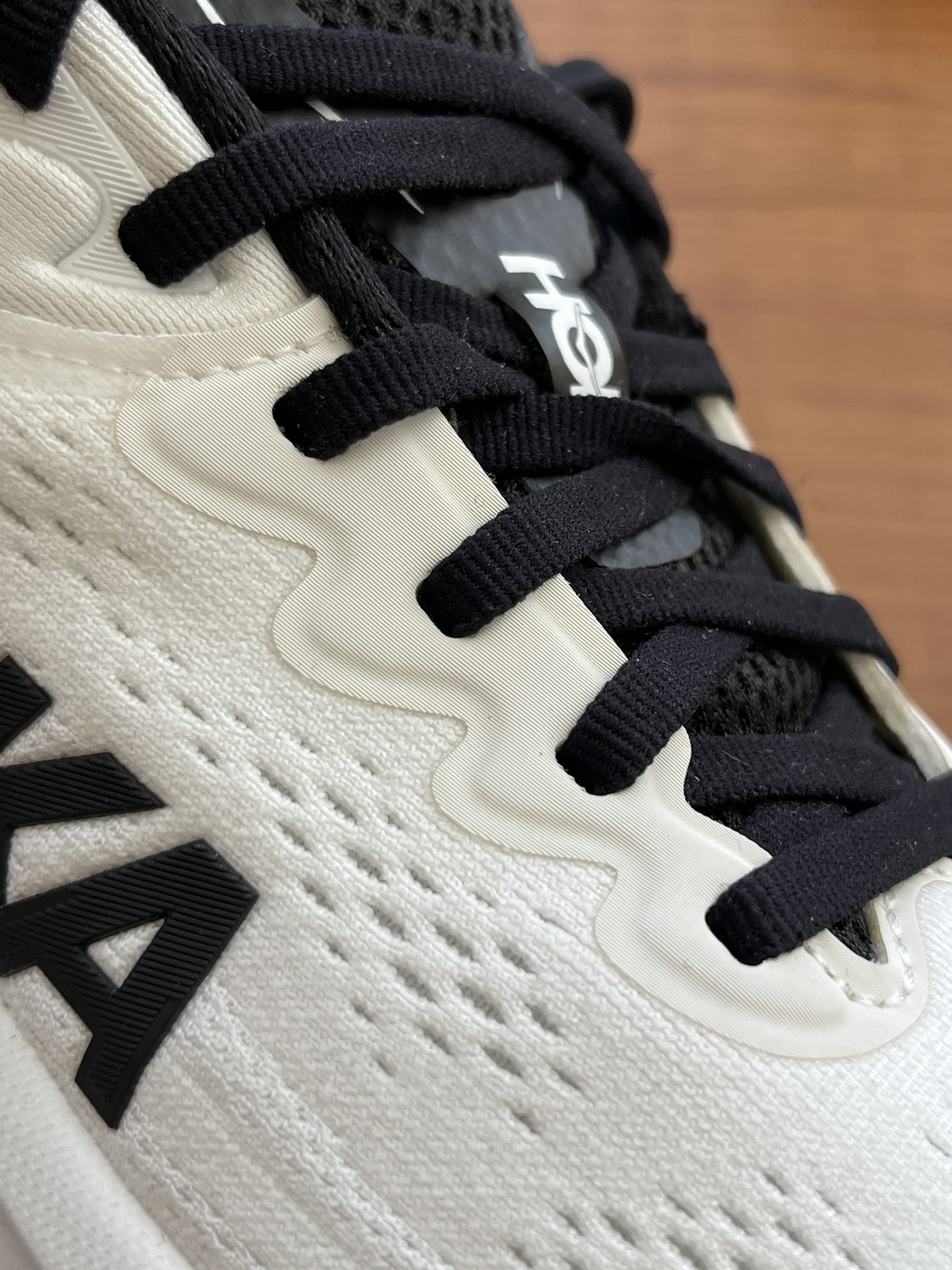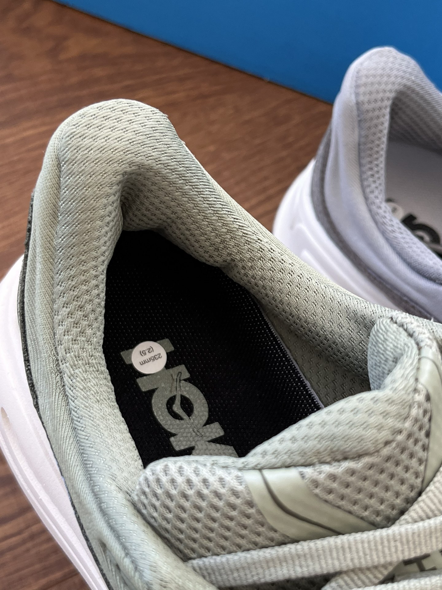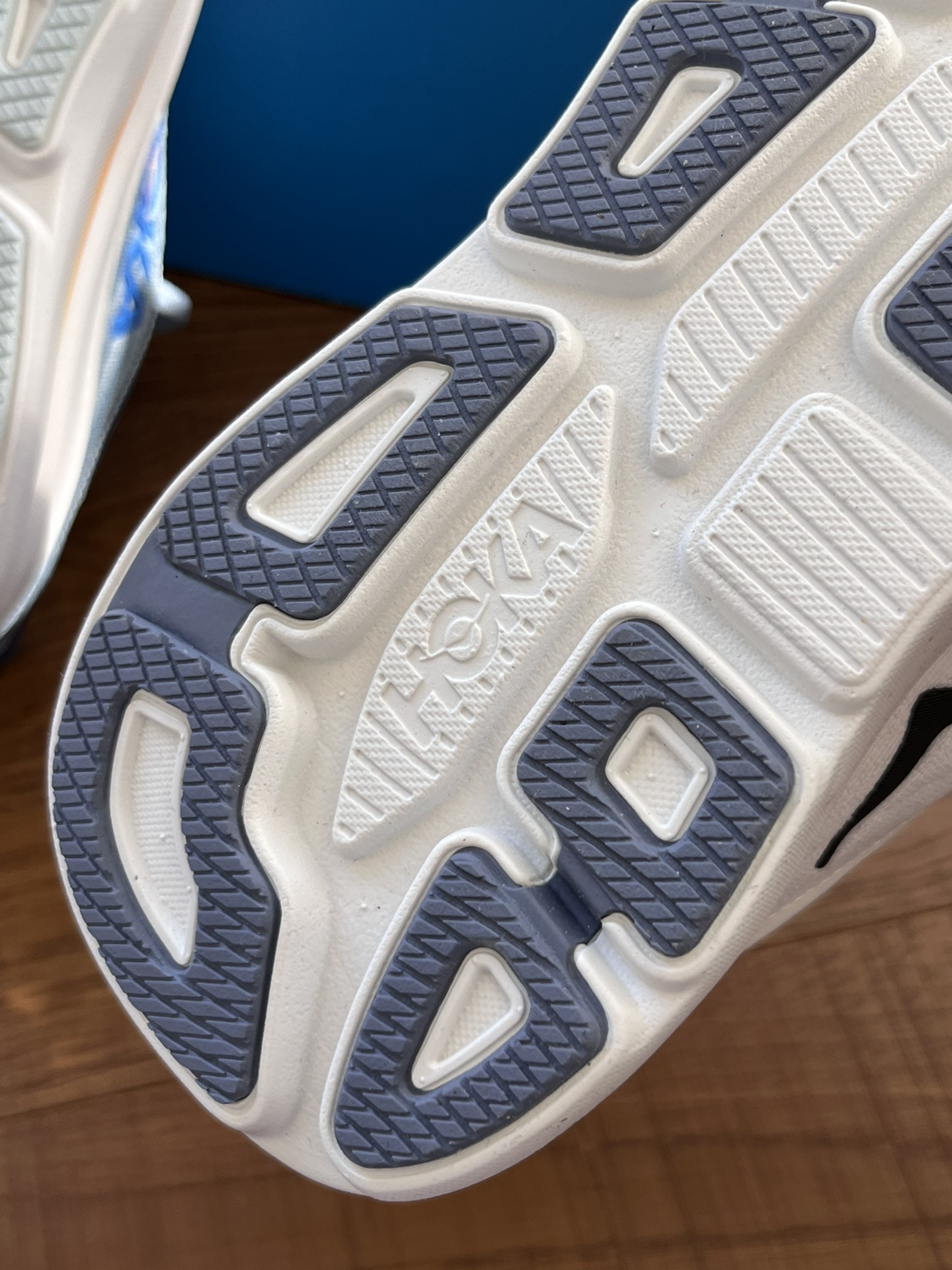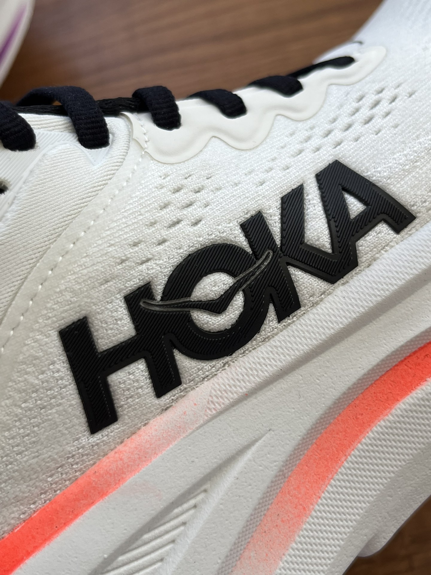鞋舌上的固定带上有贴标logo,鞋身侧面“HOKA”立体硅胶字母,鞋底也有品牌logo