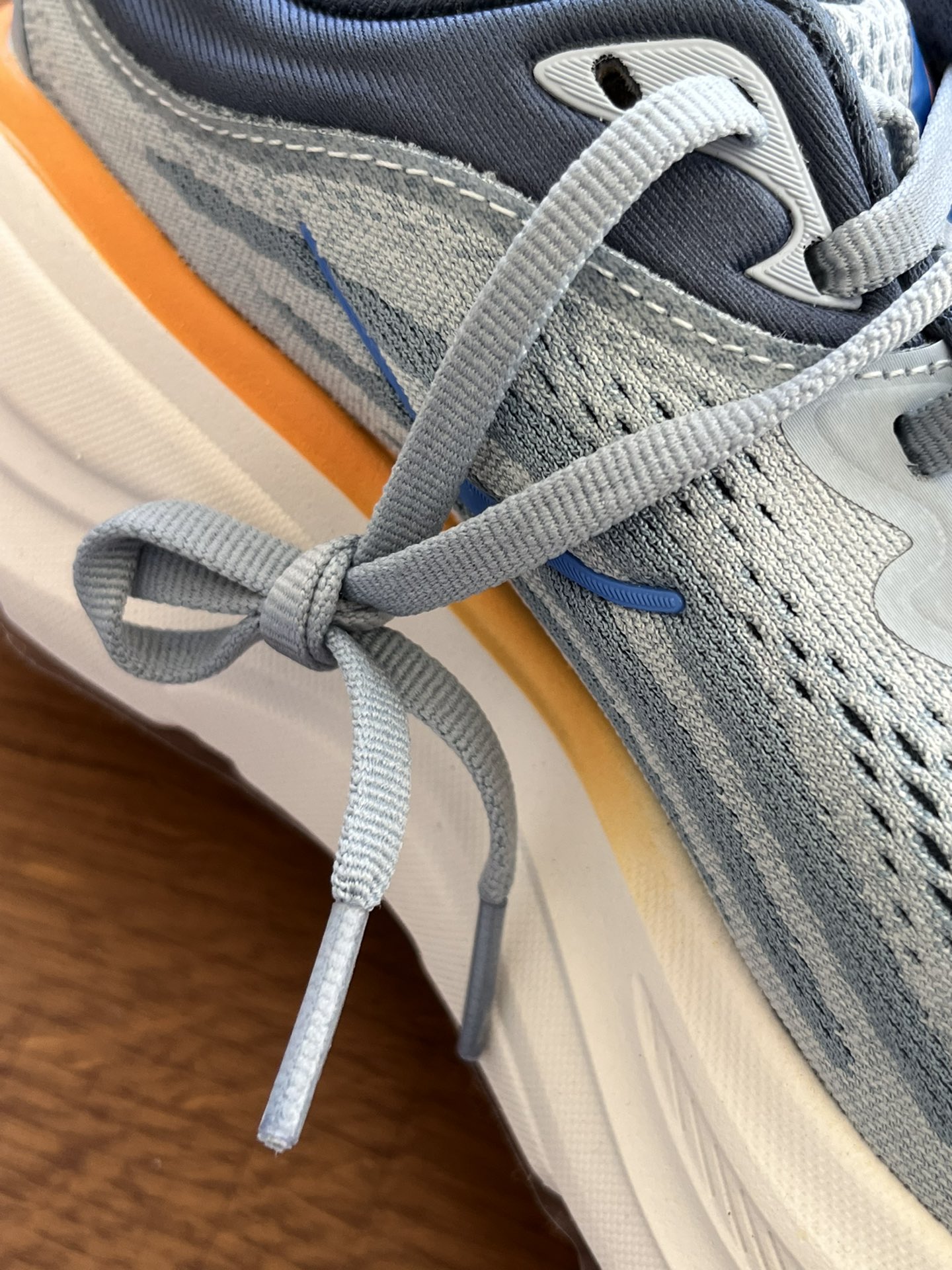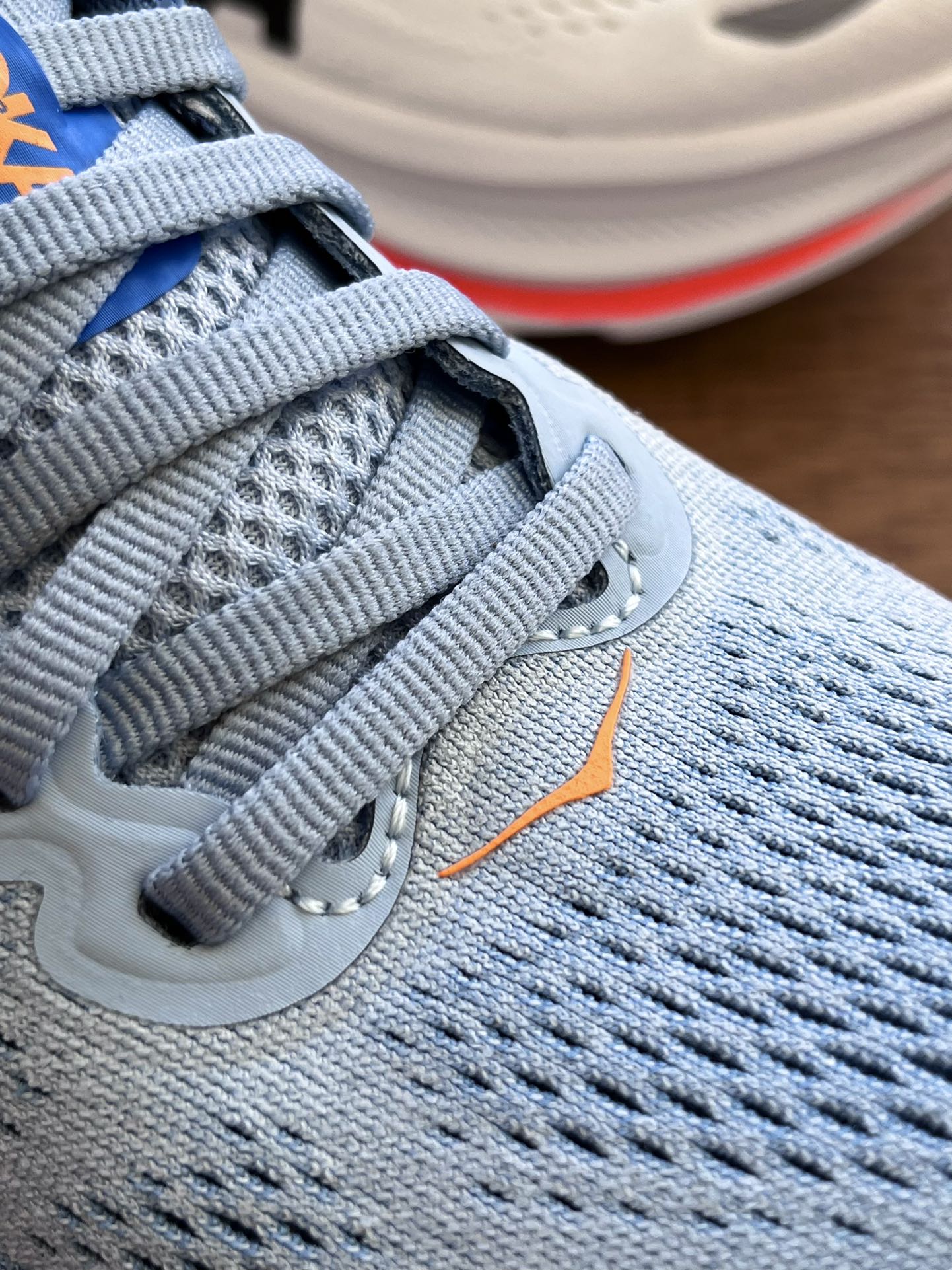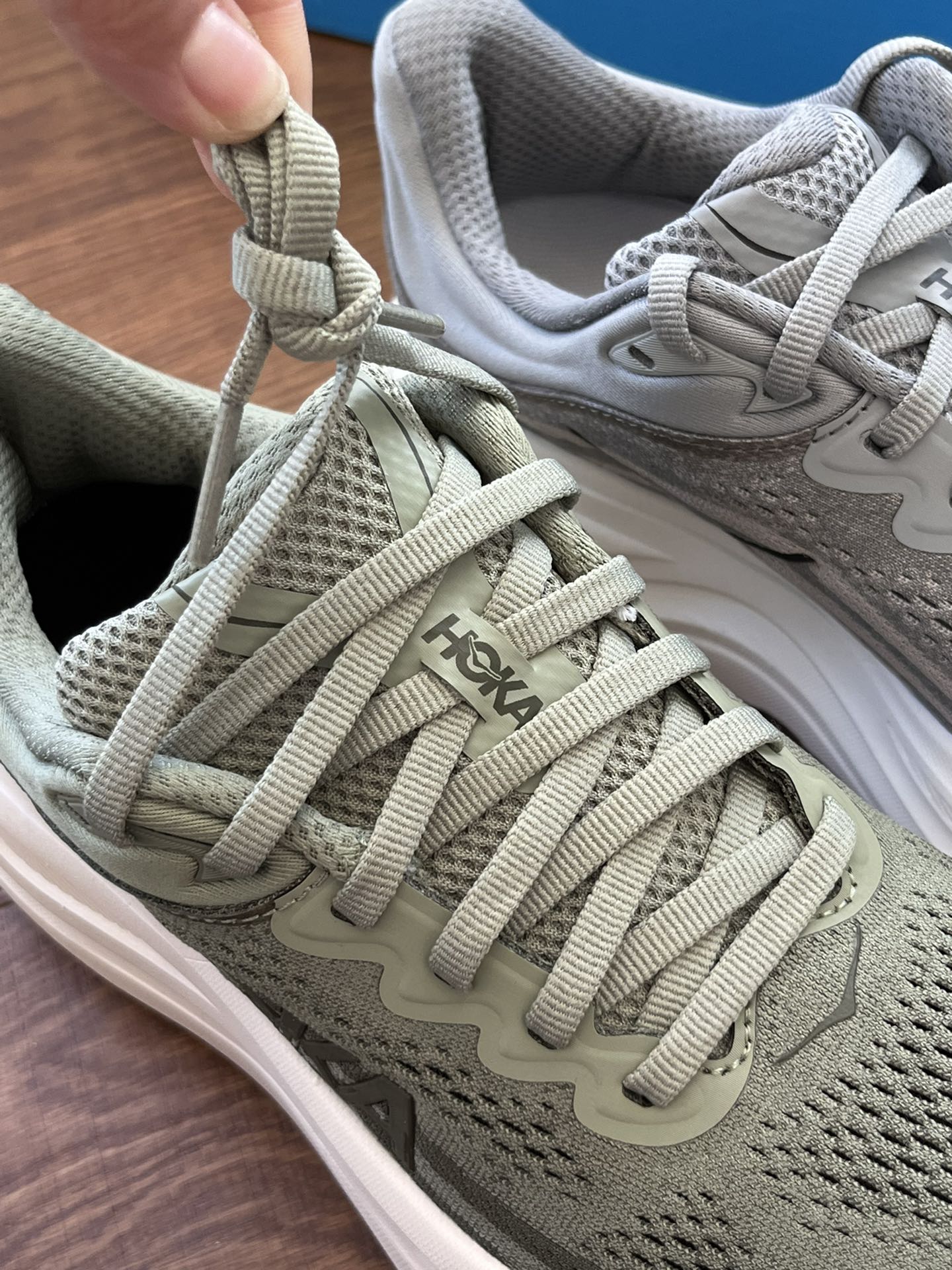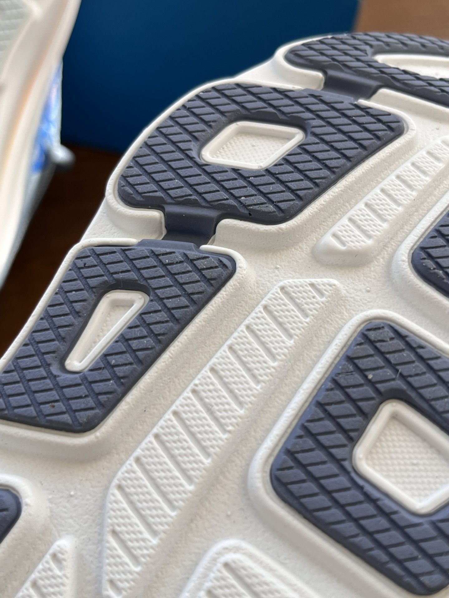 鞋舌上的固定带上有贴标logo,鞋身侧面“HOKA”立体硅胶字母,鞋底也有品牌logo