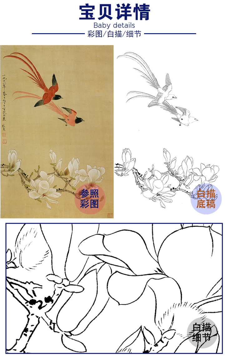 俞致贞竖幅工笔花鸟白描底稿《玉兰绶带》-多种白描尺寸可选-GV02
