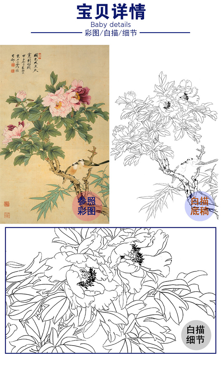 竖幅工笔花鸟白描底稿-牡丹-俞致贞《国色天香》-多种白描尺寸可选-JV01