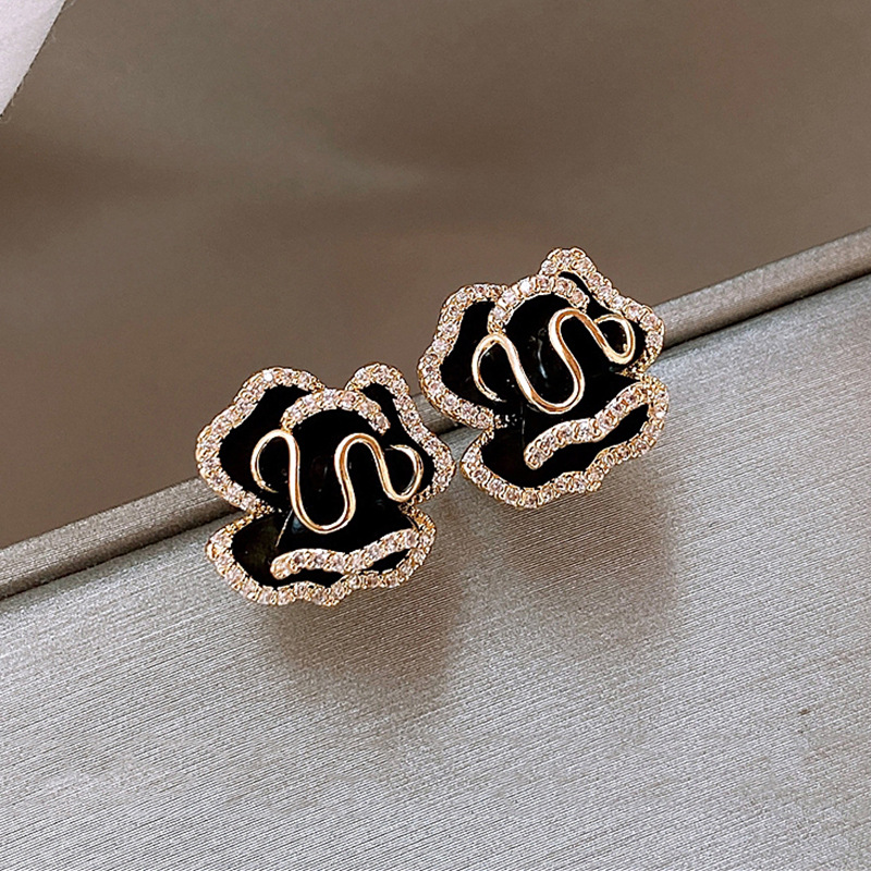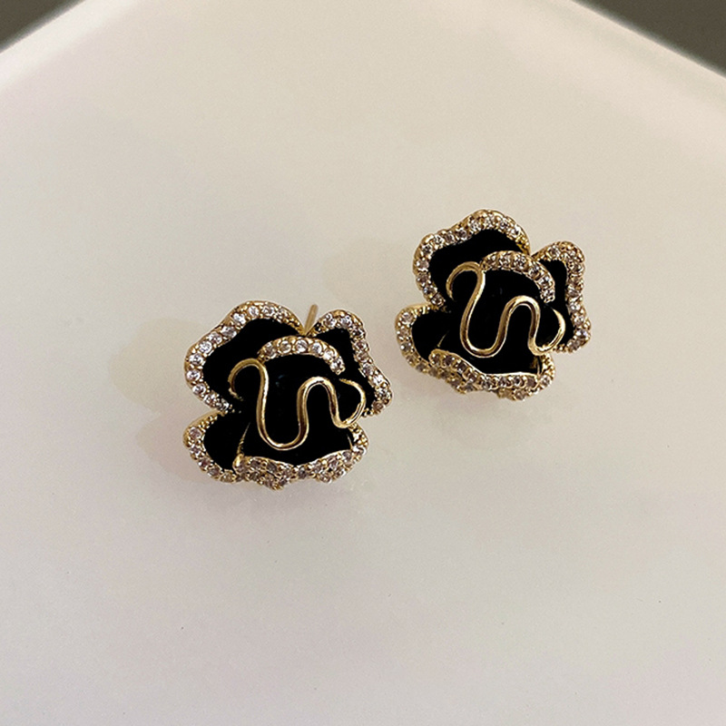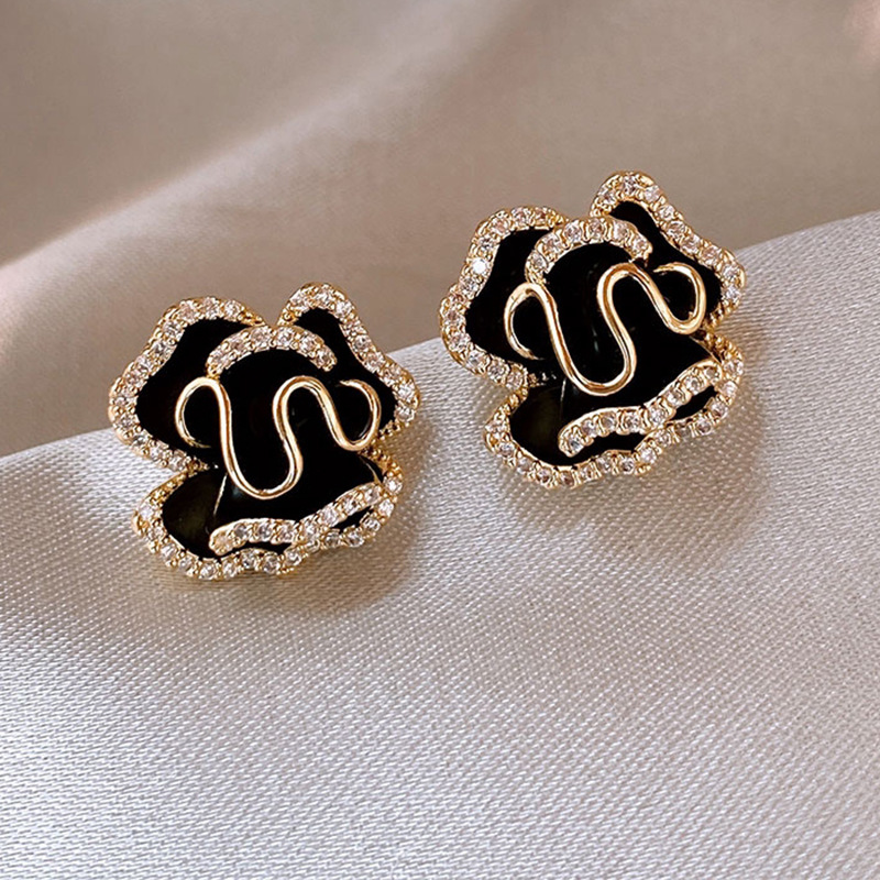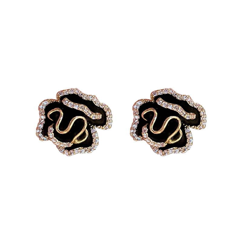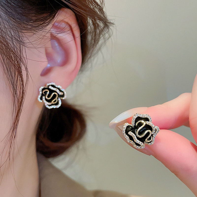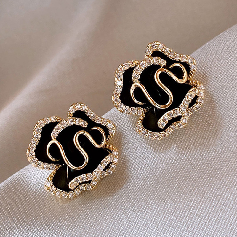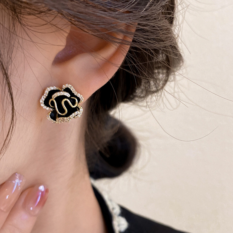JU-AB-31黑色山茶花复古耳环温柔气质感耳钉简约百搭满钻耳坠耳饰