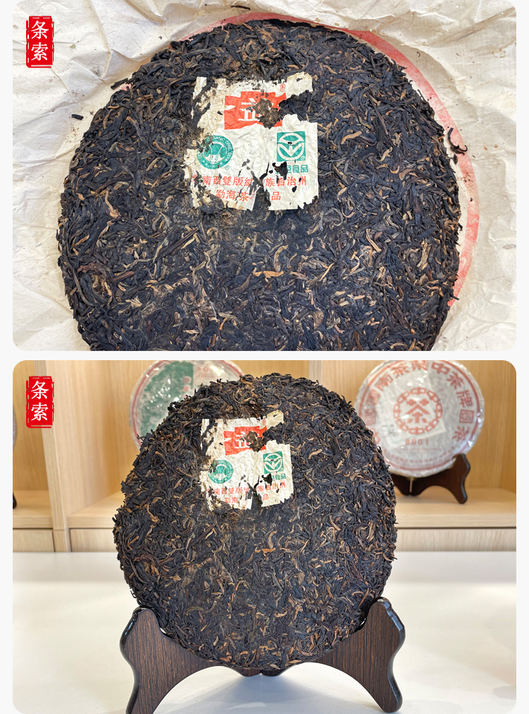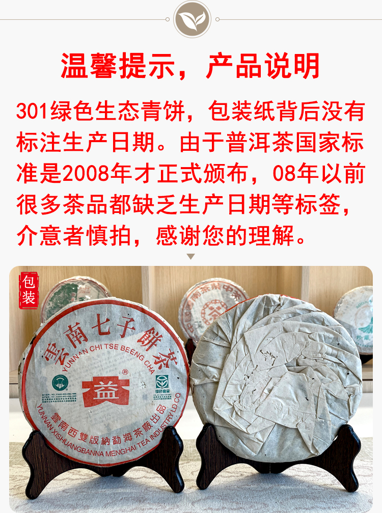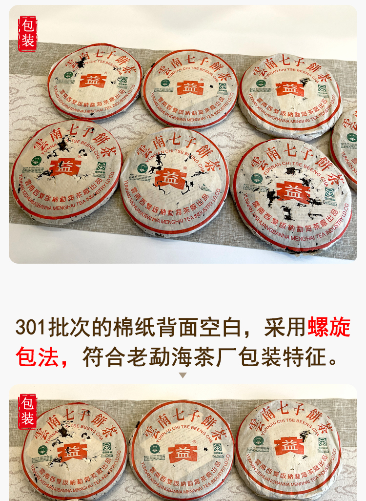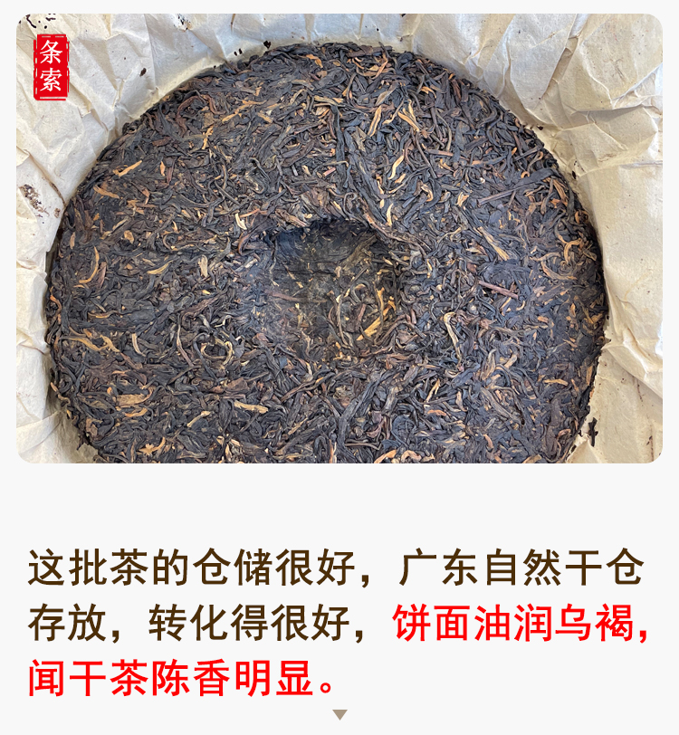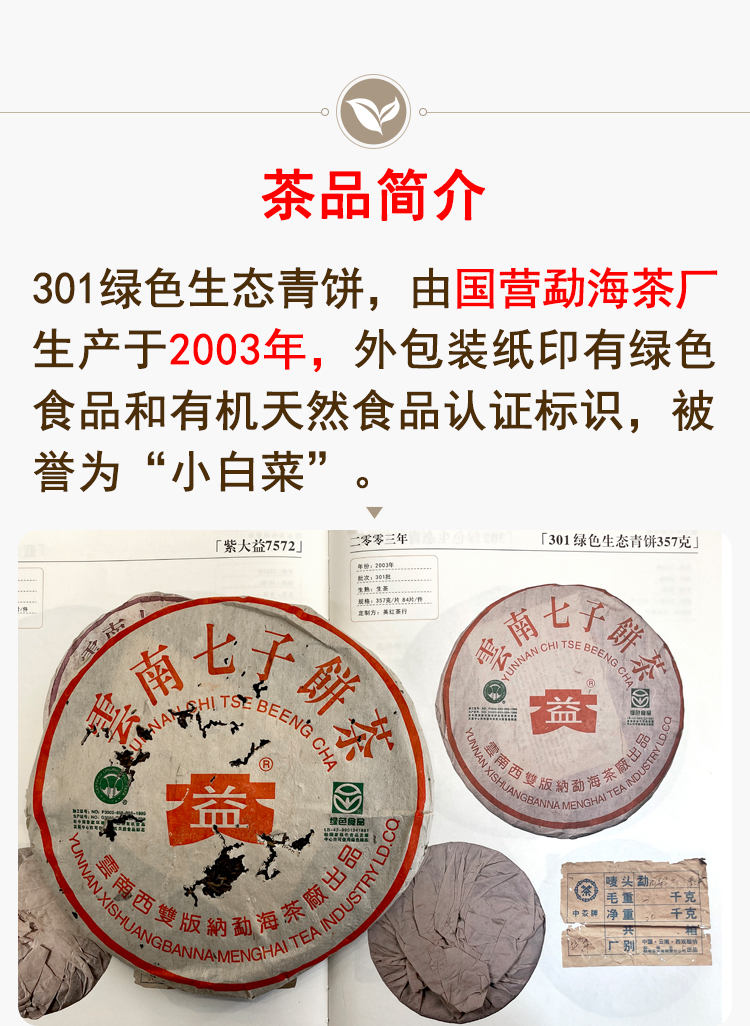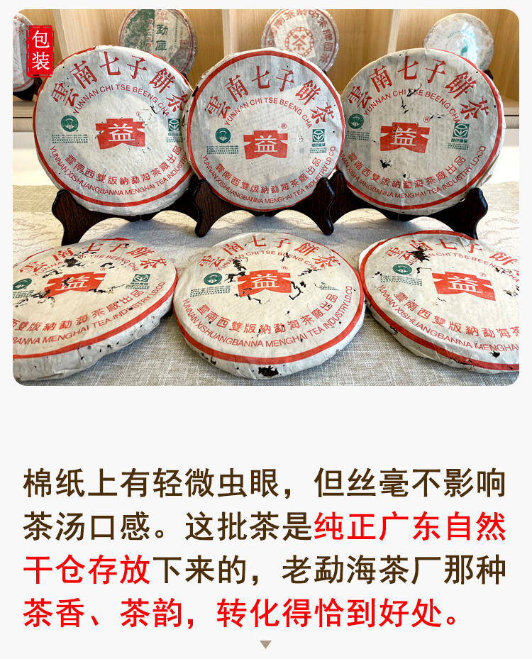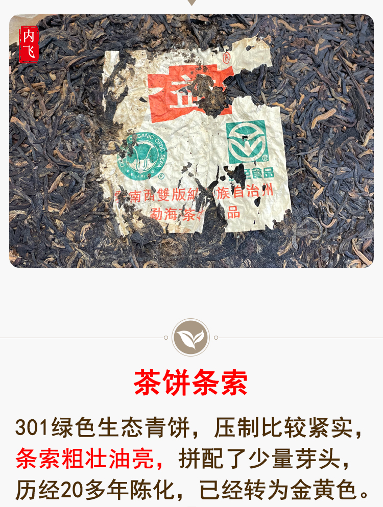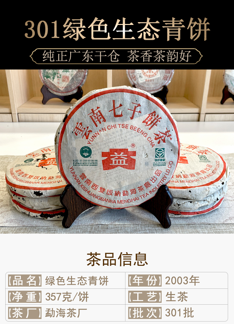 【品质好茶】2003年勐海茶厂301批绿色生态青饼357克普洱老生茶 纯正广东干仓茶香韵好 虽然绵纸表面有破洞不好看 但纯广东干仓转化出来了非常好的味道 标价为一片的价格
