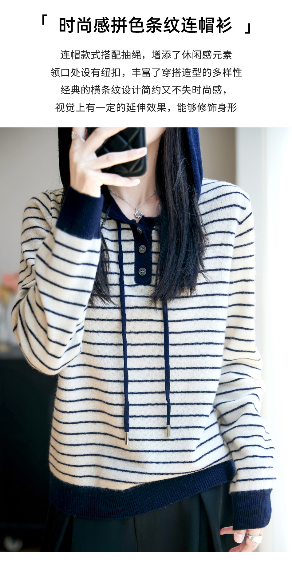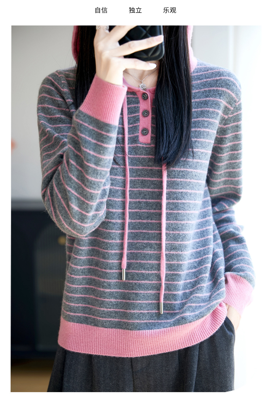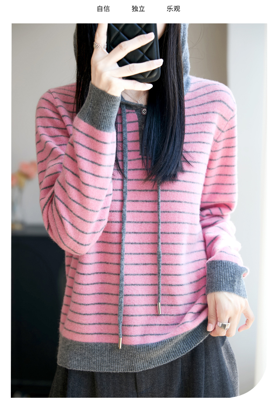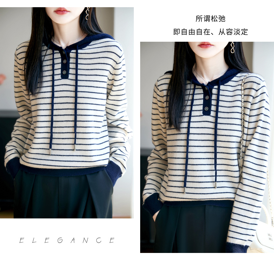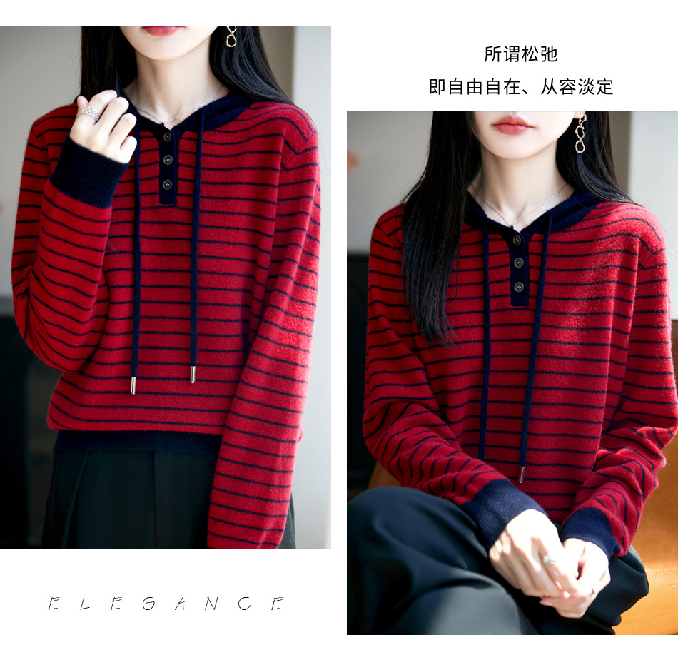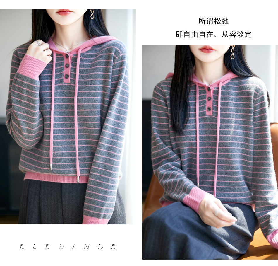 雀说100%纯羊毛衫女连帽卫衣秋冬新款慵懒风宽松上衣外套针织衫帽衫AL467 商品图4