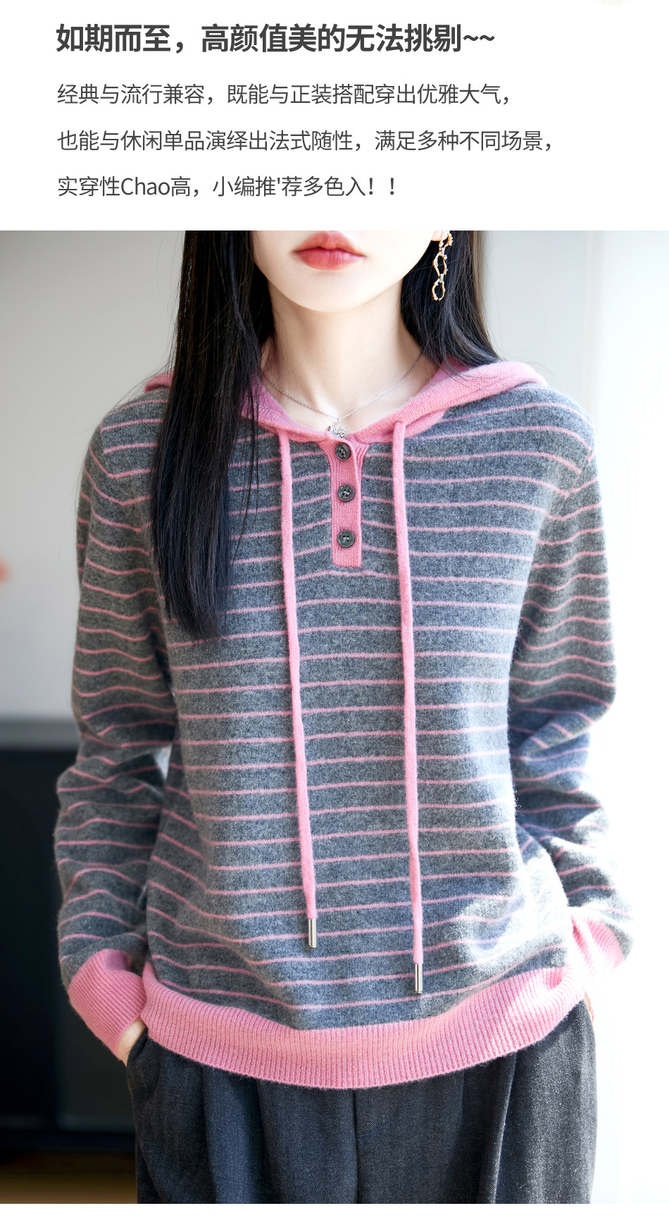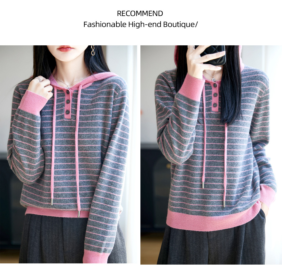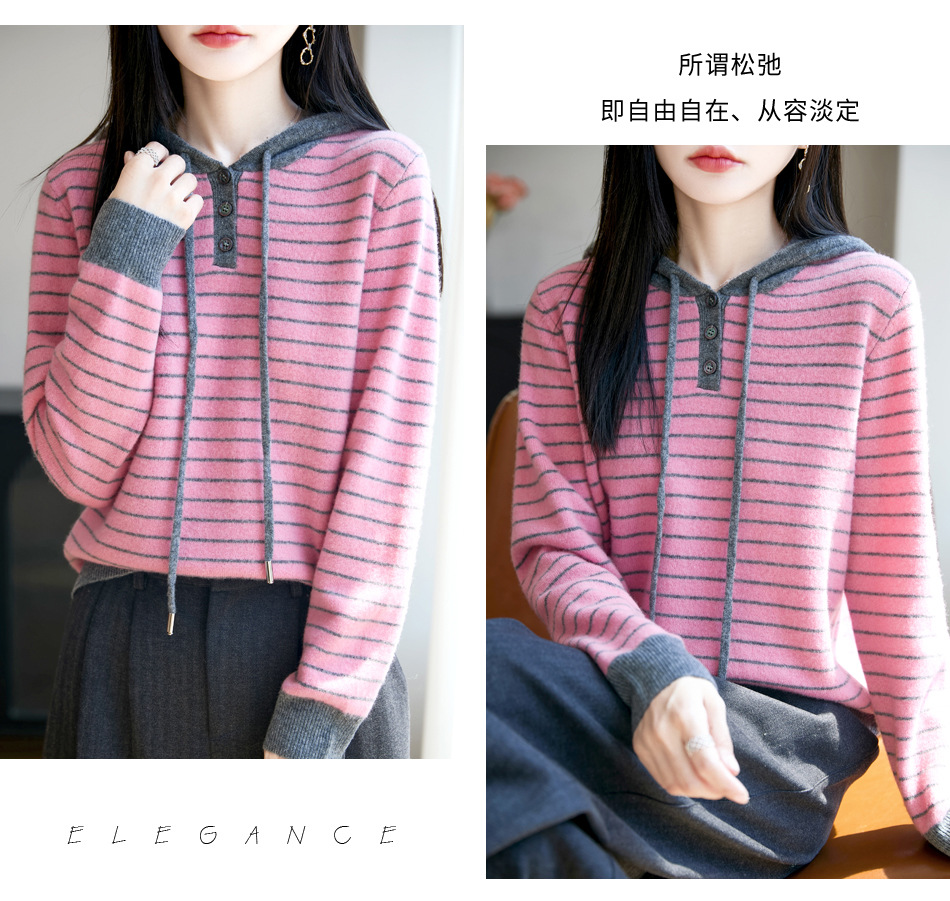 雀说100%纯羊毛衫女连帽卫衣秋冬新款慵懒风宽松上衣外套针织衫帽衫AL467 商品图3