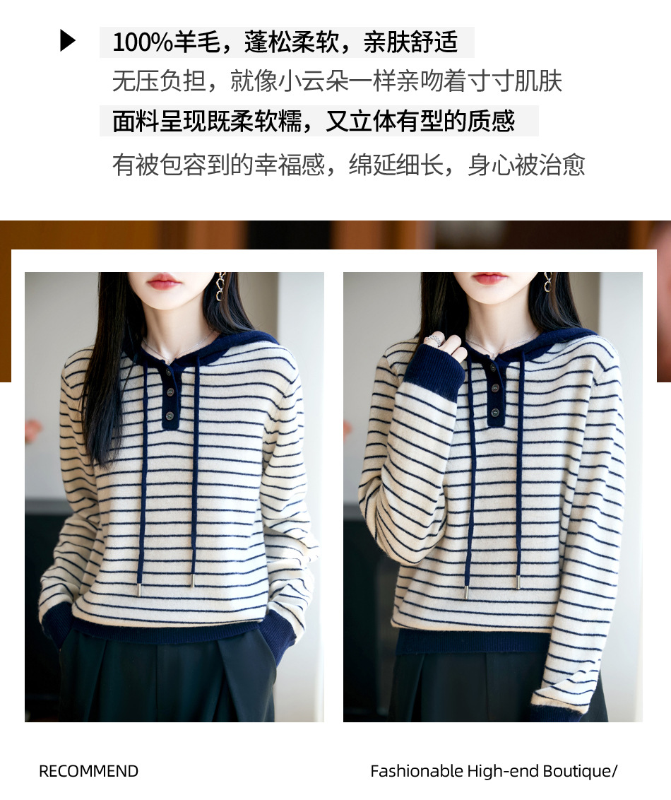 雀说100%纯羊毛衫女连帽卫衣秋冬新款慵懒风宽松上衣外套针织衫帽衫AL467 商品图0