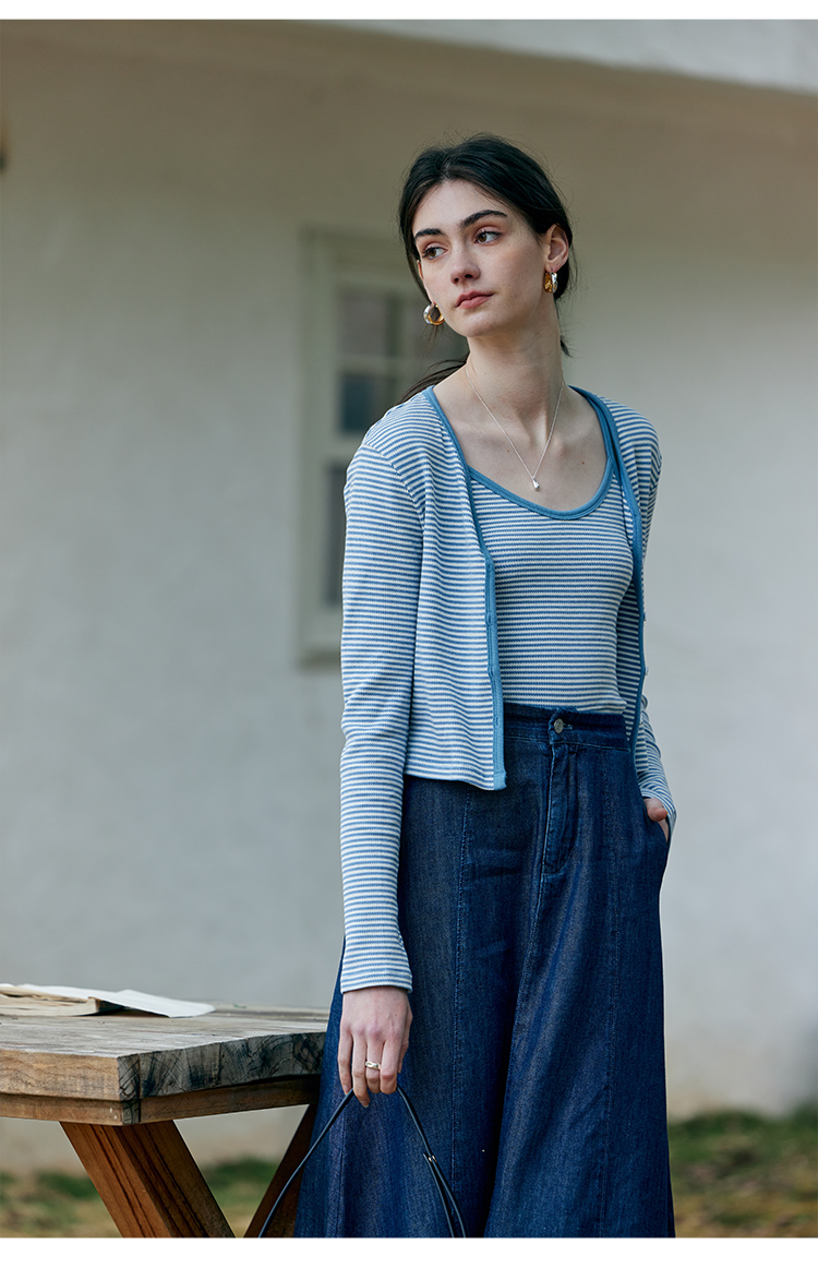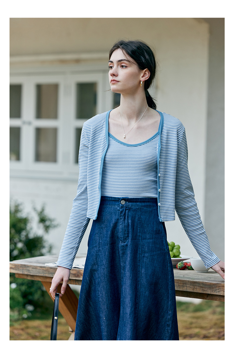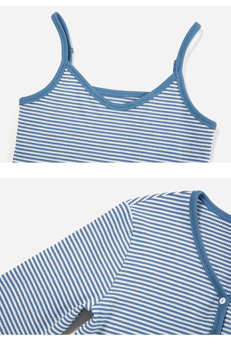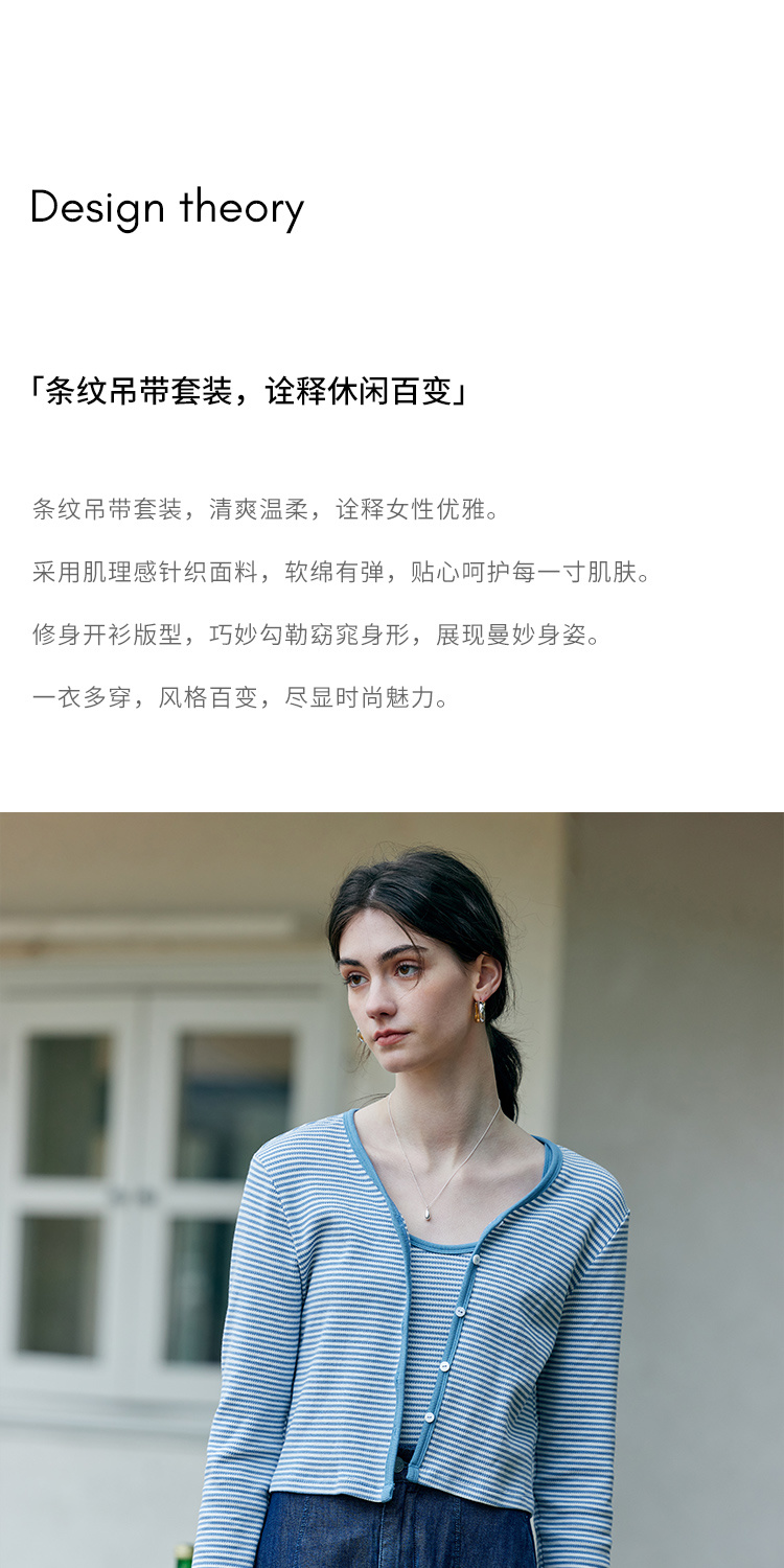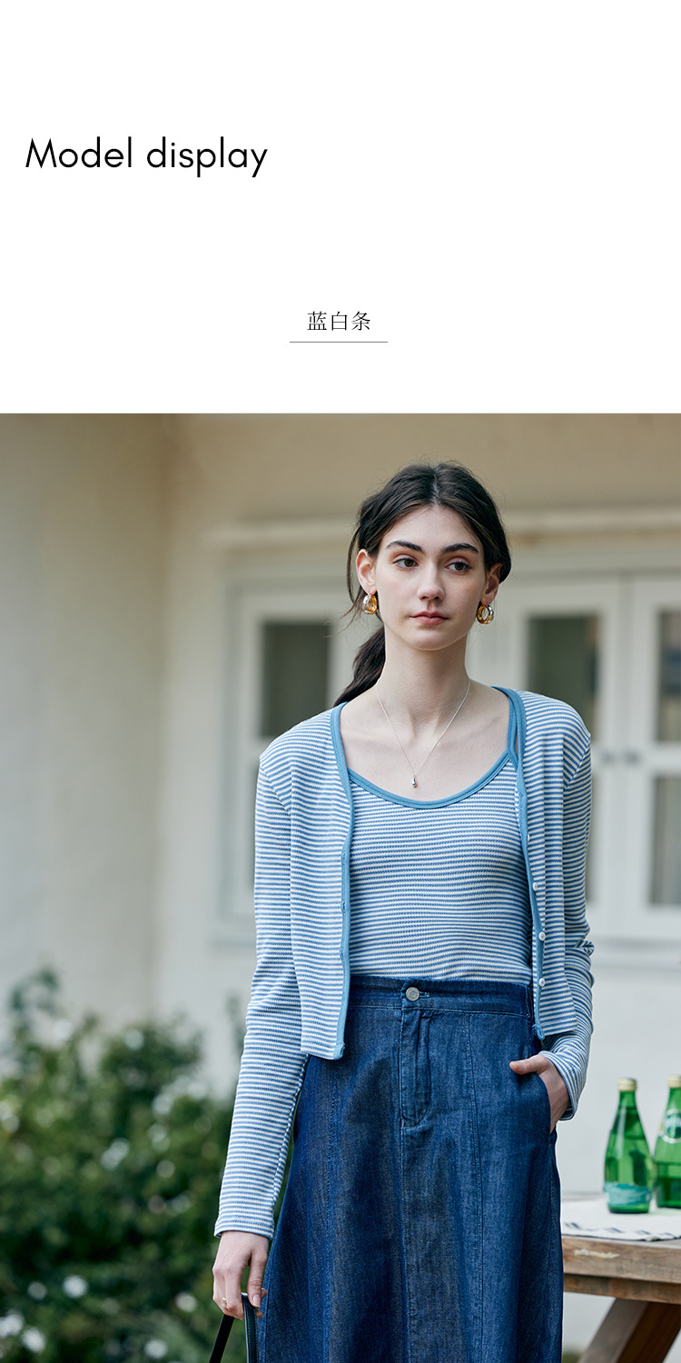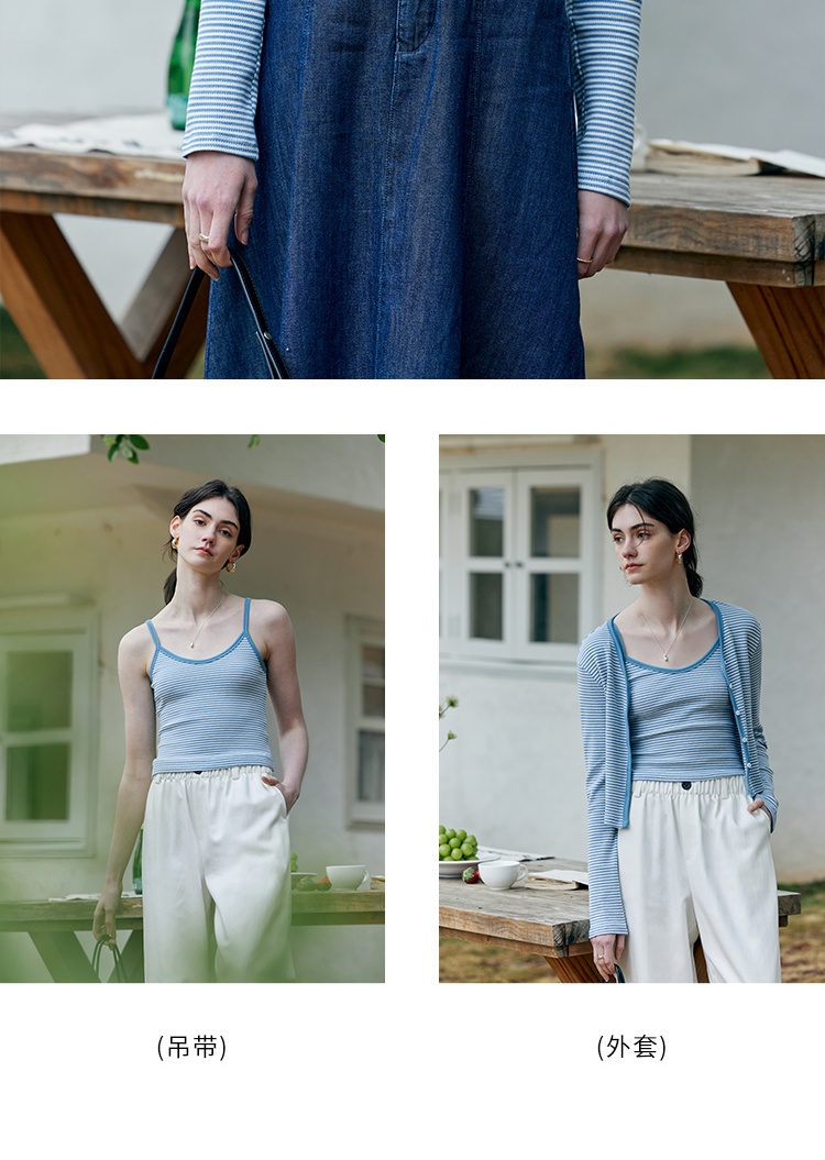 HeyDress蓝色条纹针织开衫女春夏法式撞色设计V领吊带背心两件套