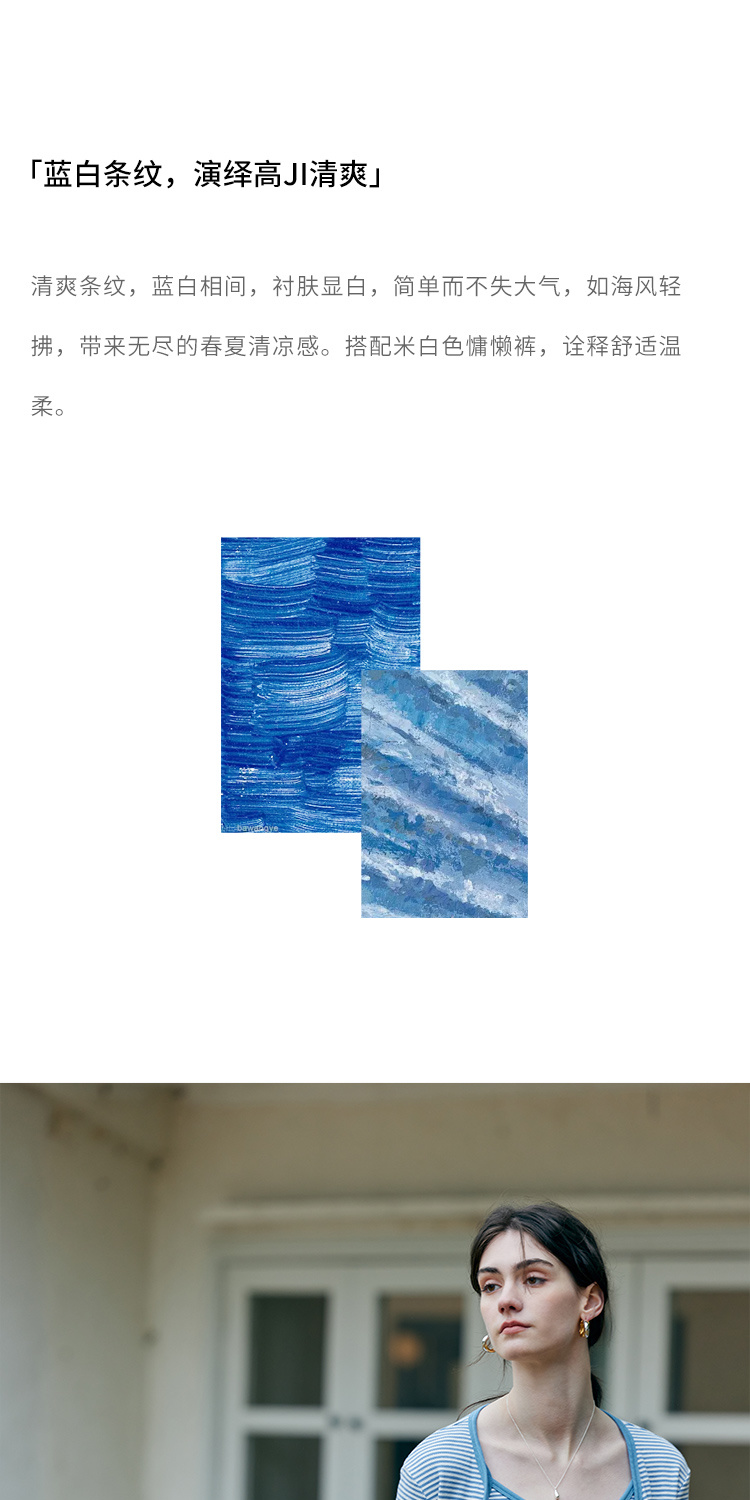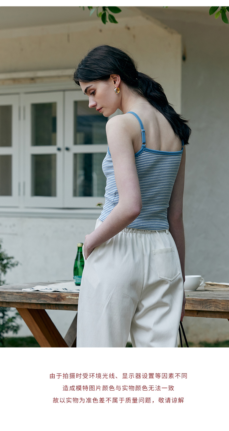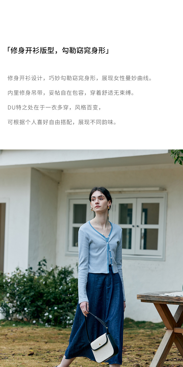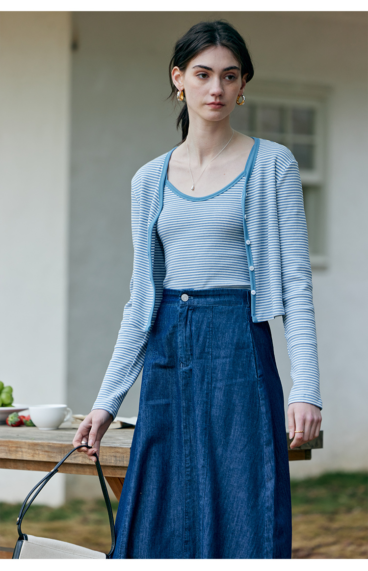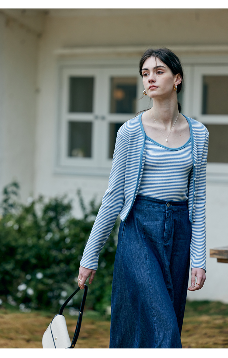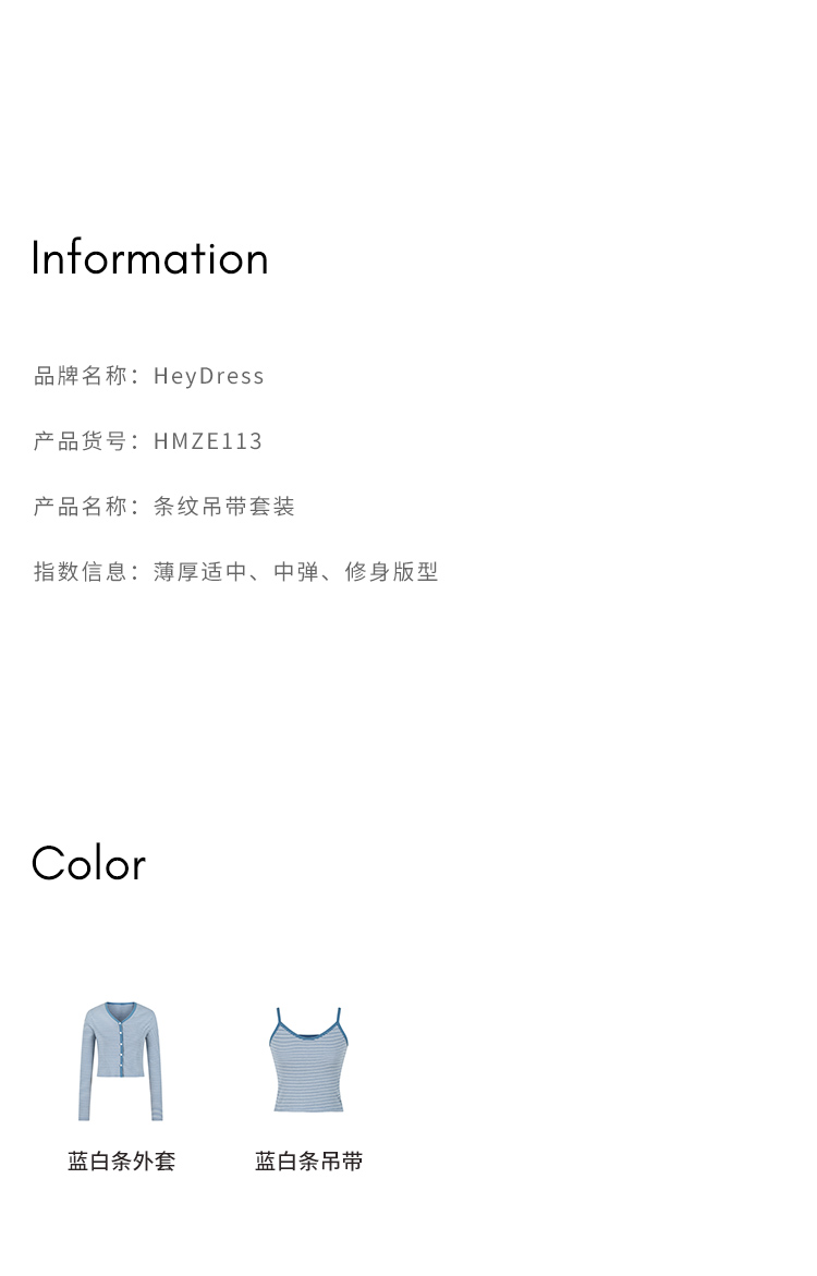 HeyDress蓝色条纹针织开衫女春夏法式撞色设计V领吊带背心两件套