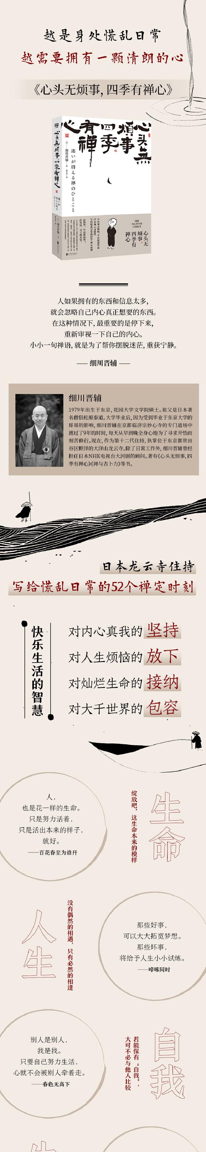这是一本倡导以积极态度去生活的随笔集。作者从广泛的智慧箴言中精心挑选了52个词汇,按照生命会先后经历“青春”“赤夏”“白秋”,后走向“玄冬”岁月的季节来分组,并按照追踪人的一生的方式渐次展开,合编成图文并茂的随笔集,通过文字阅读与大量水墨画技法的优美插图的形式,带领读者扫除心灵尘埃,关注内心、接受自我,让烦恼、焦虑获得释放,收获自在人生。