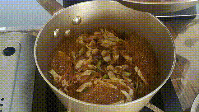 2. 炒洋葱和圆白菜后倒入浇汁;