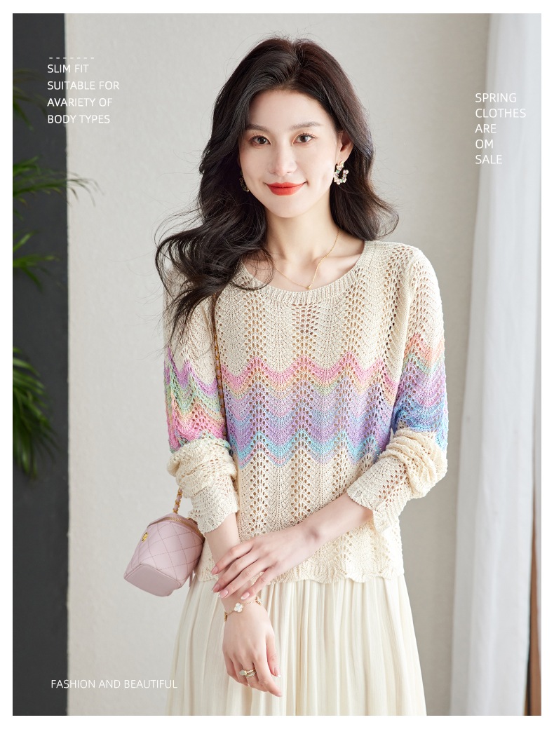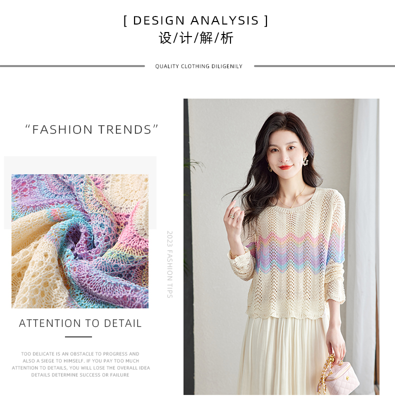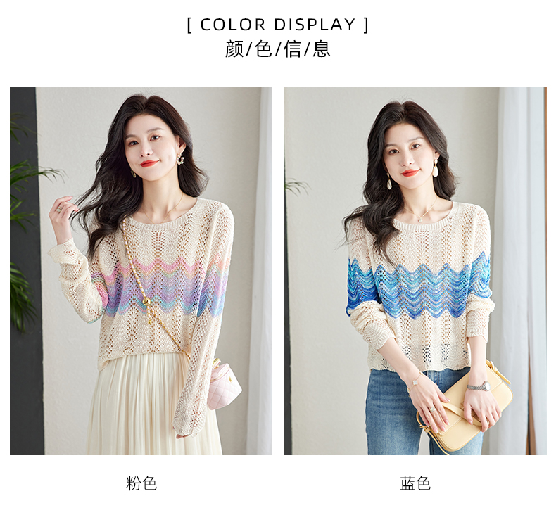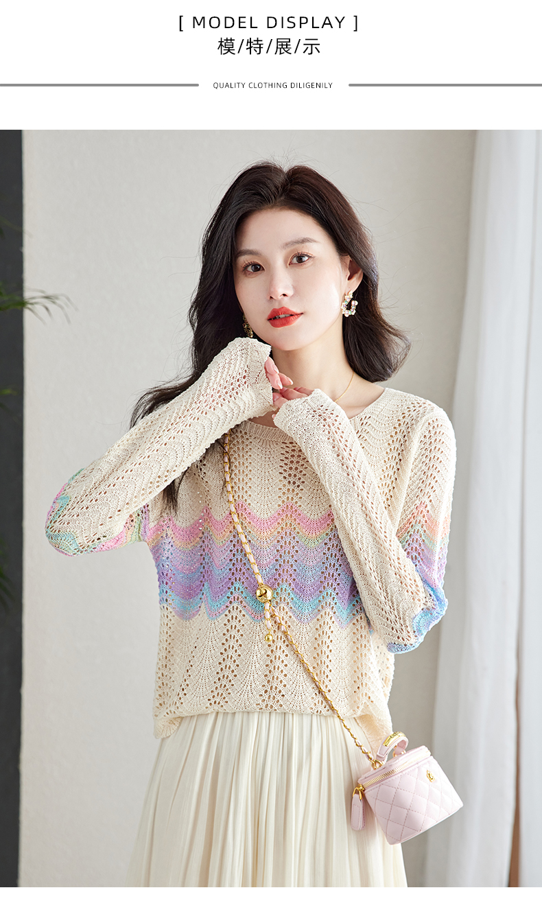 长袖薄款毛衣,防晒彩虹条拼接镂空罩衫上衣HR-MLLJS6692