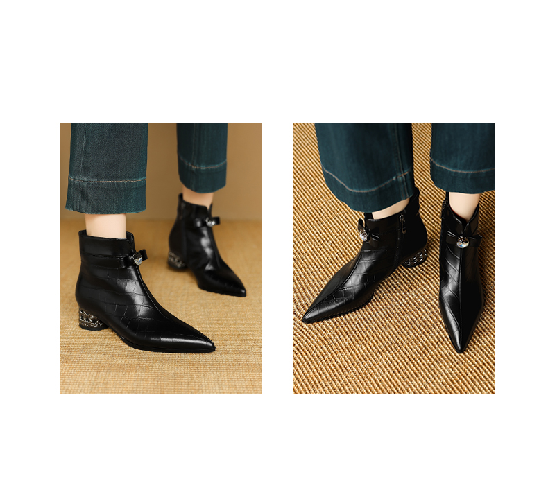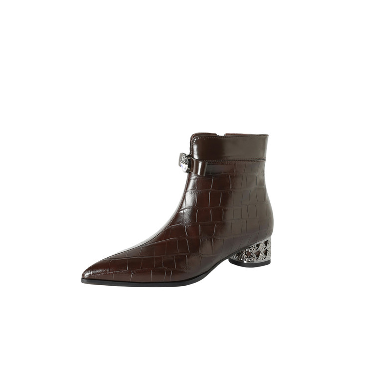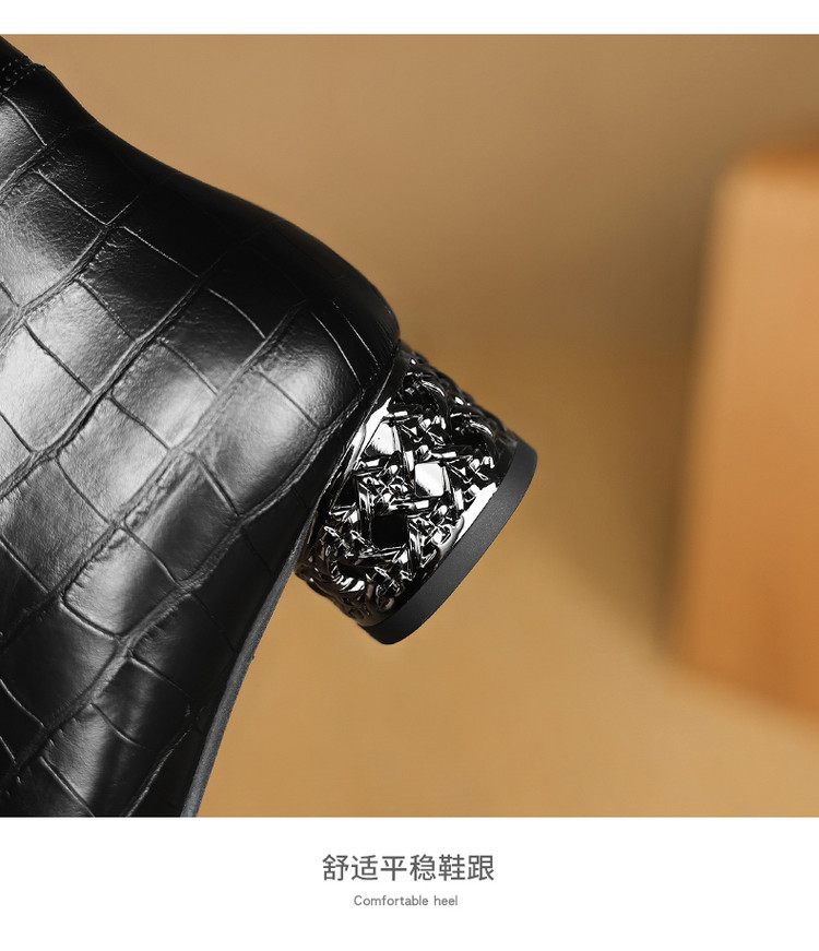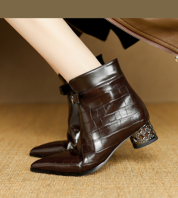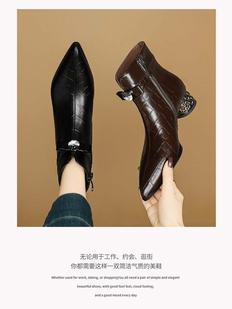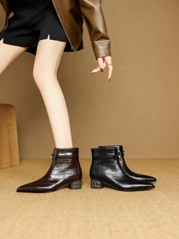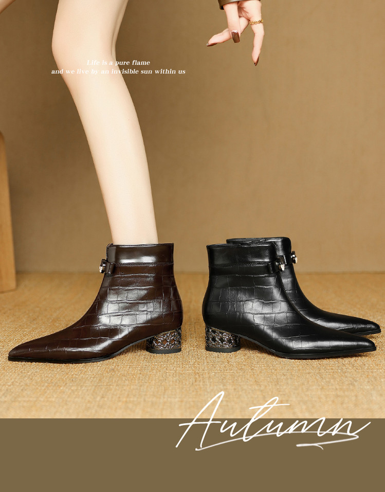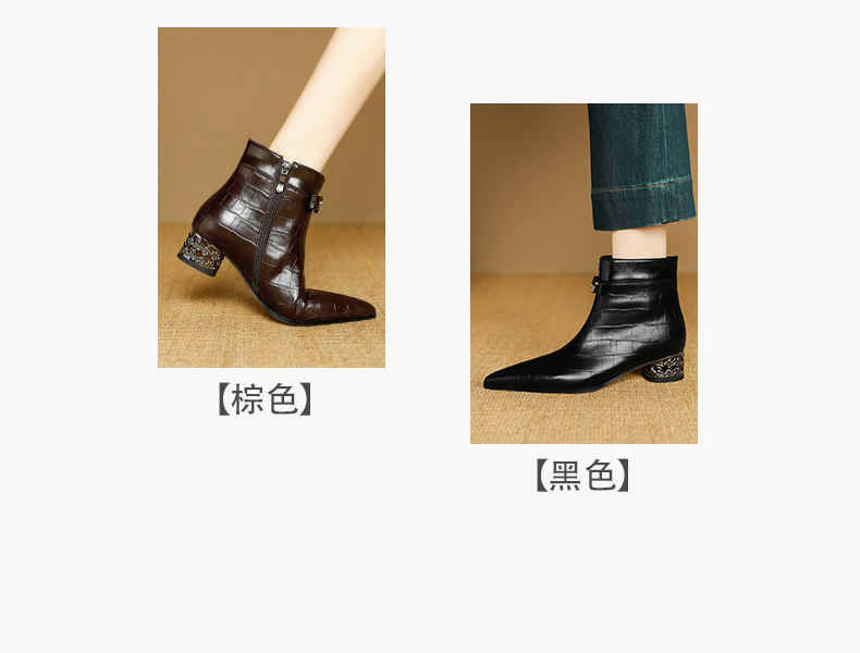 【预售5天】秋冬新款牛皮时尚格纹中粗跟靴子气质通勤时装靴女加绒尖头短靴DB&M6607