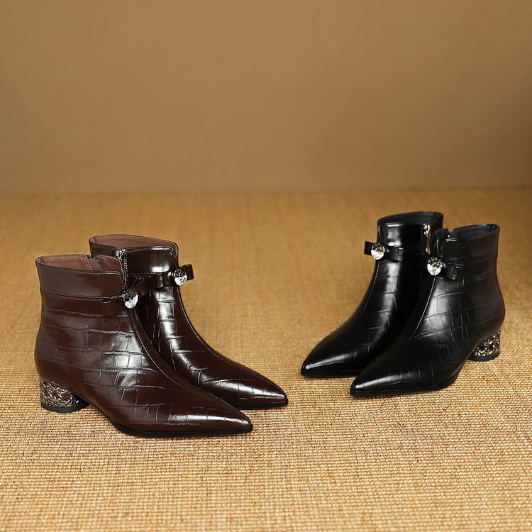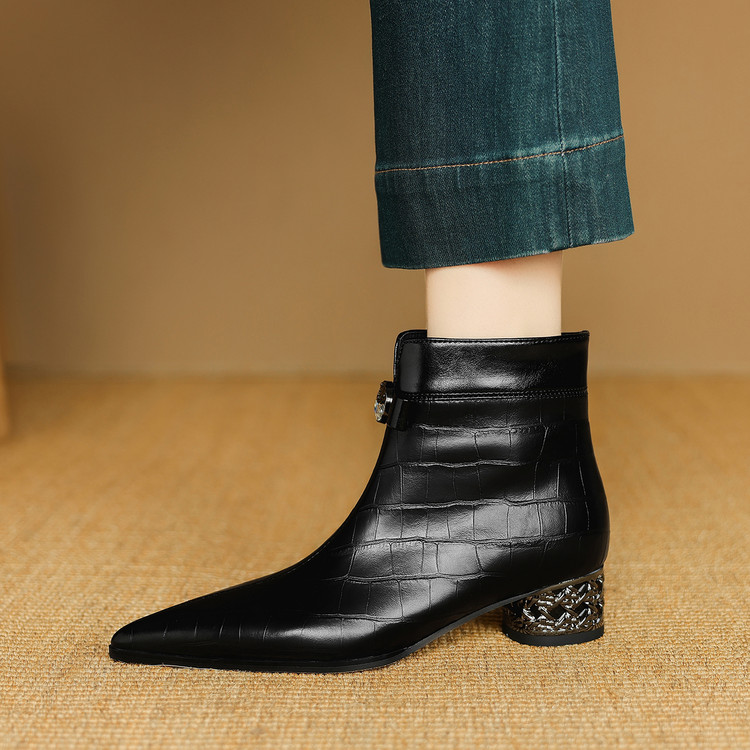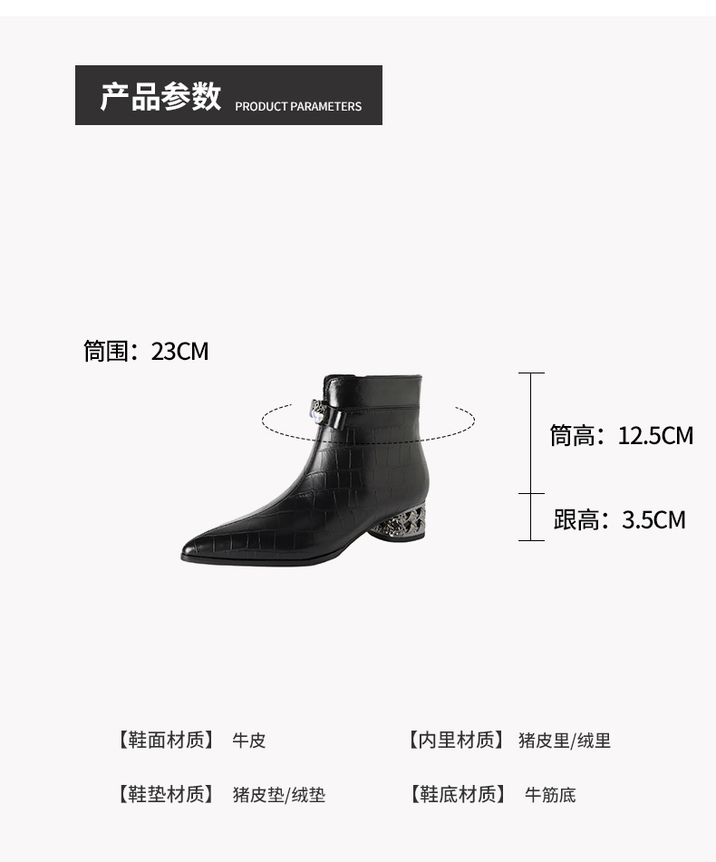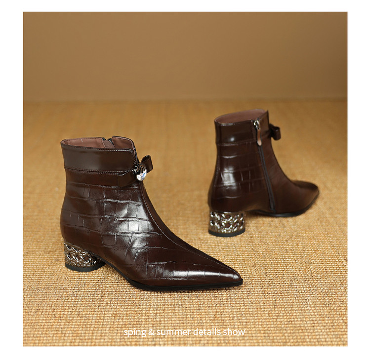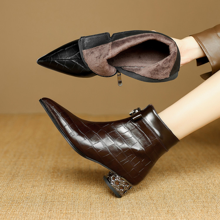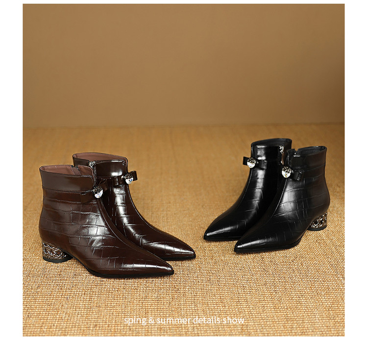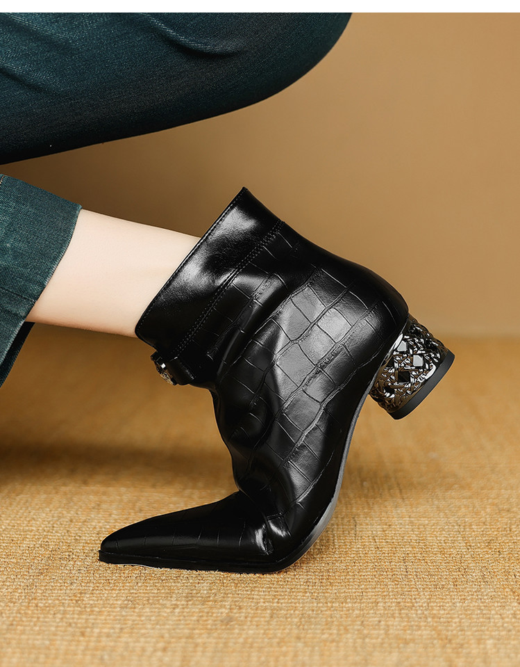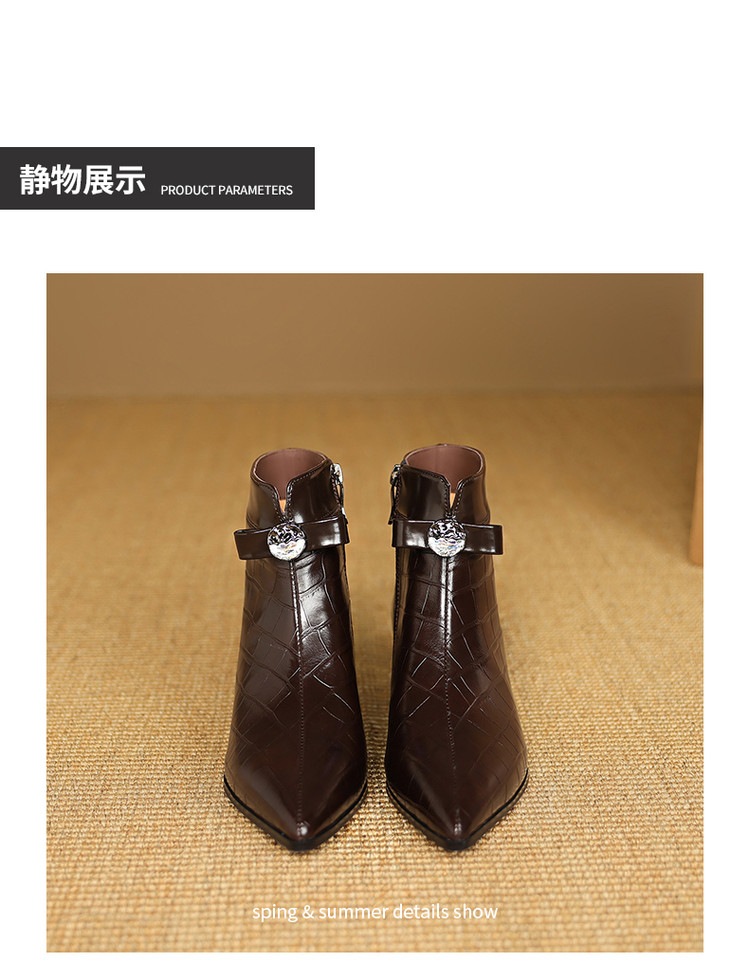 【预售5天】秋冬新款牛皮时尚格纹中粗跟靴子气质通勤时装靴女加绒尖头短靴DB&M6607