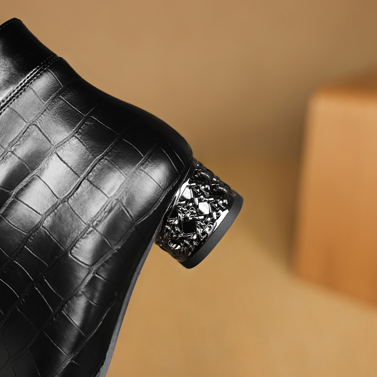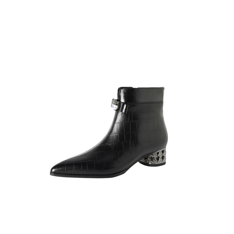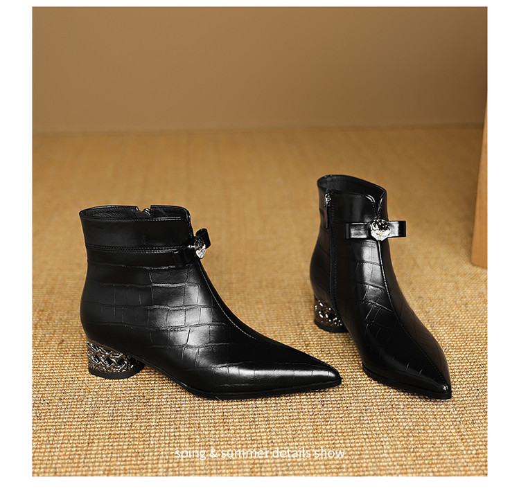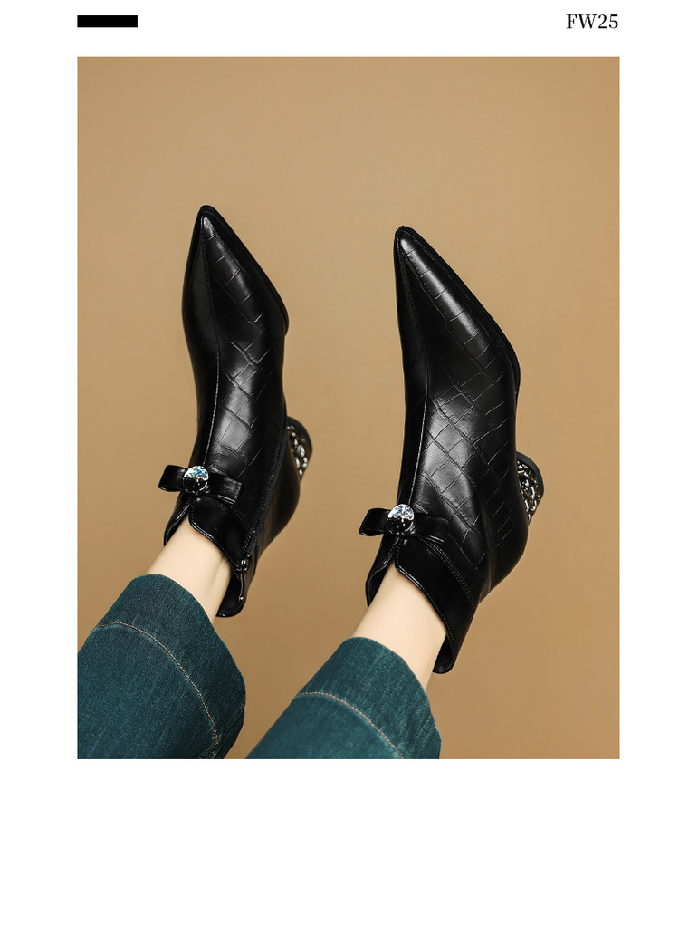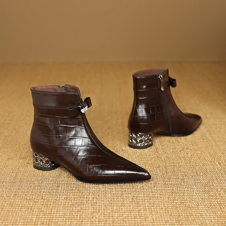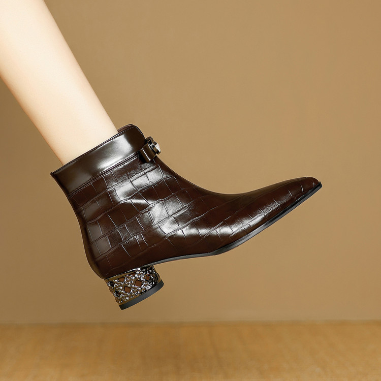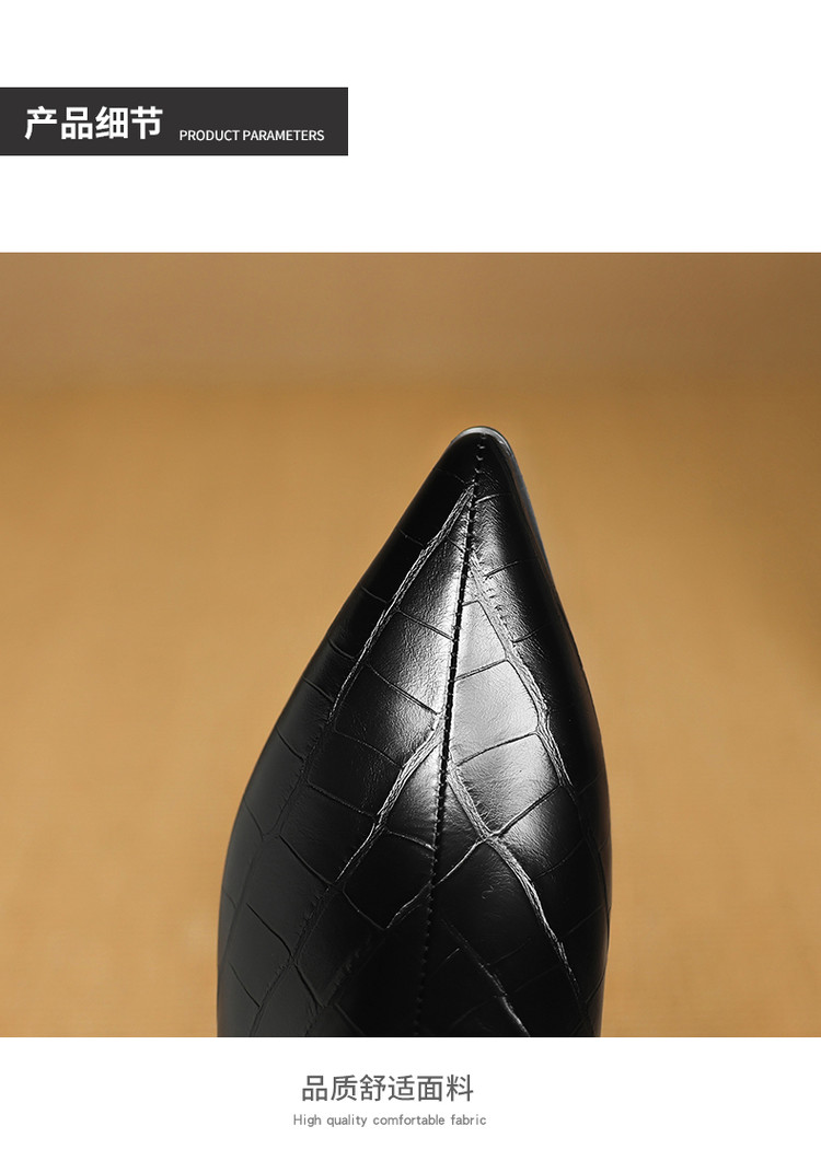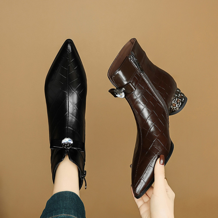 【预售5天】秋冬新款牛皮时尚格纹中粗跟靴子气质通勤时装靴女加绒尖头短靴DB&M6607