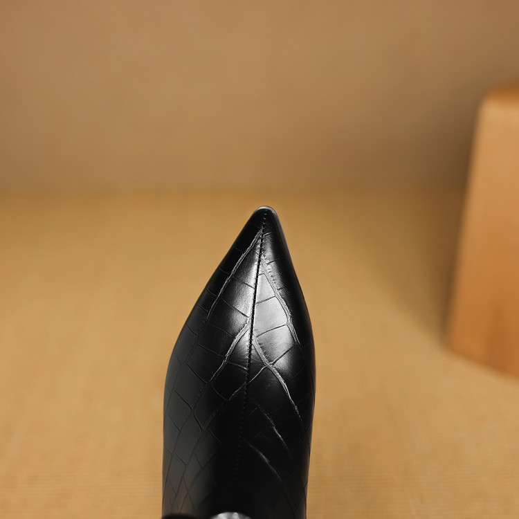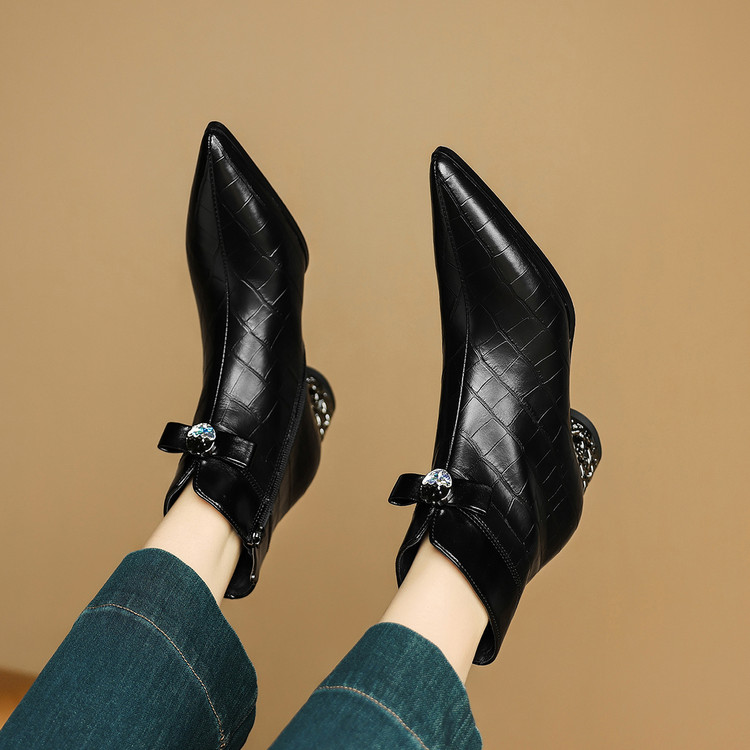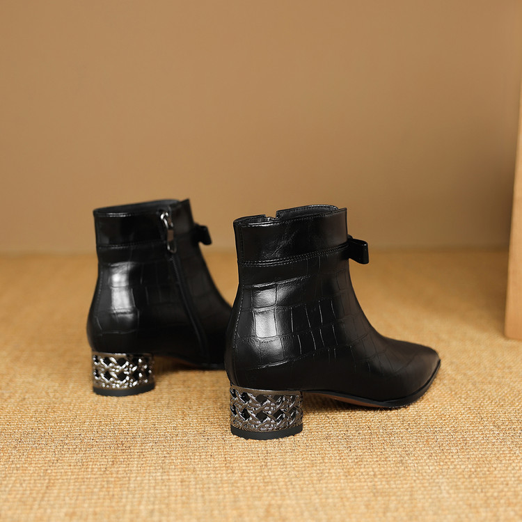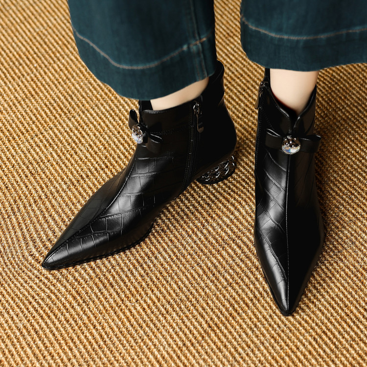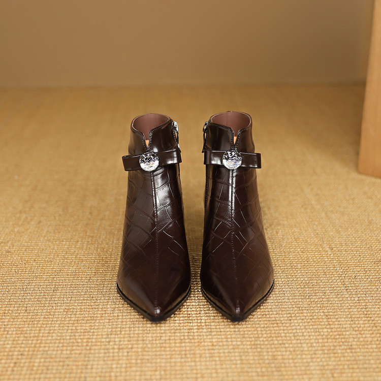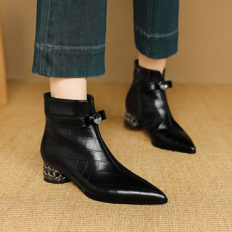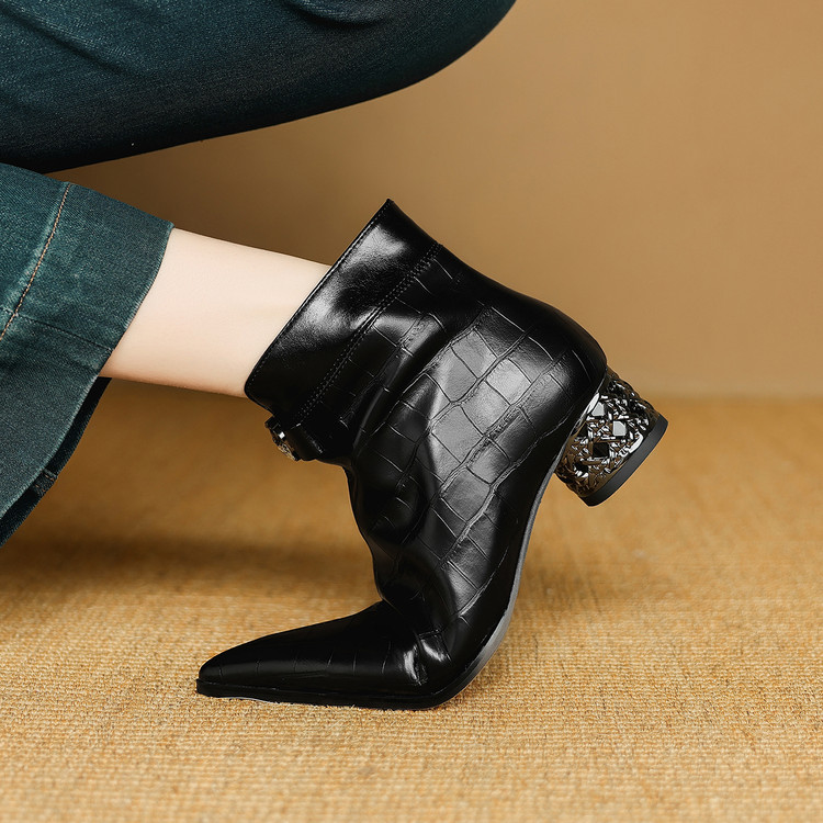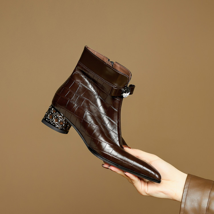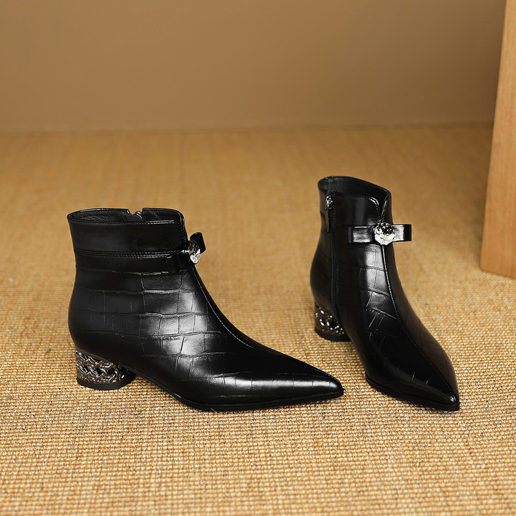 【预售5天】秋冬新款牛皮时尚格纹中粗跟靴子气质通勤时装靴女加绒尖头短靴DB&M6607