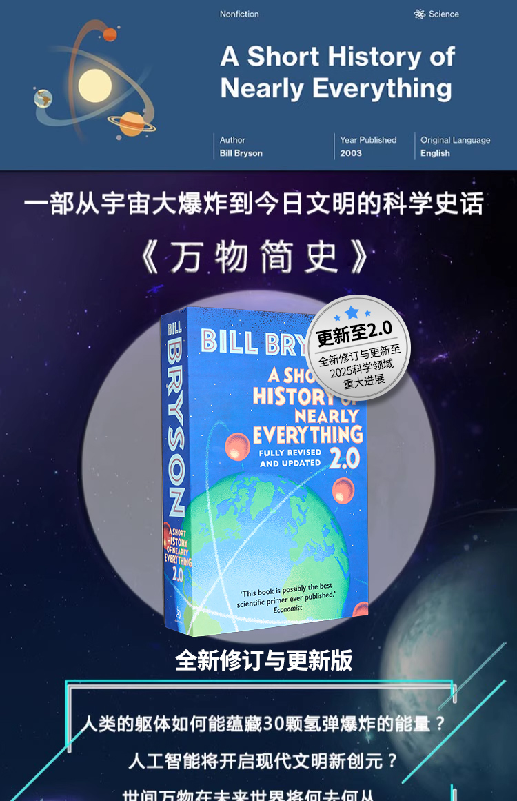 《A Short History of Nearly Everything 2.0》是比尔·布莱森(Bill Bryson)于2003年出版的全球畅销科普读物《A Short History of Nearly Everything》的全新修订与更新版,于2025年10月21日正式发行。此次2.0版本的推出,旨在反映自原书出版后过去二十多年间(约2003年至2025年)科学领域取得的重大进展。