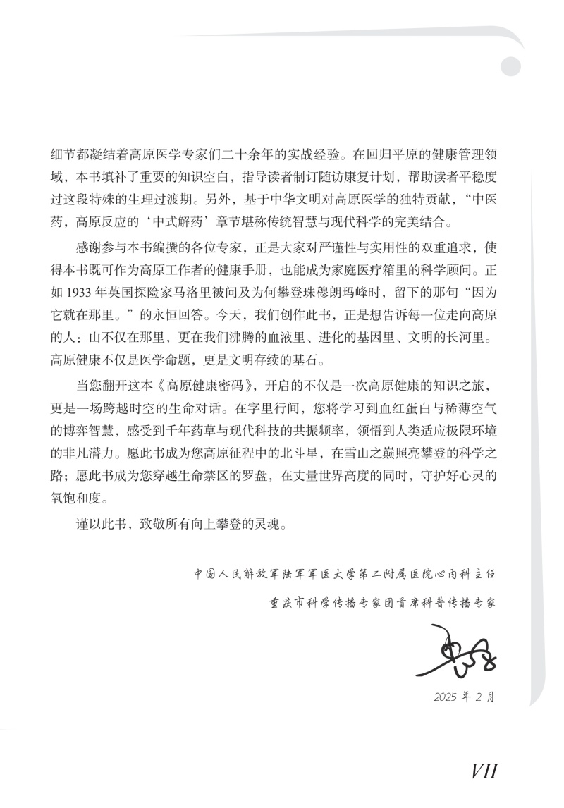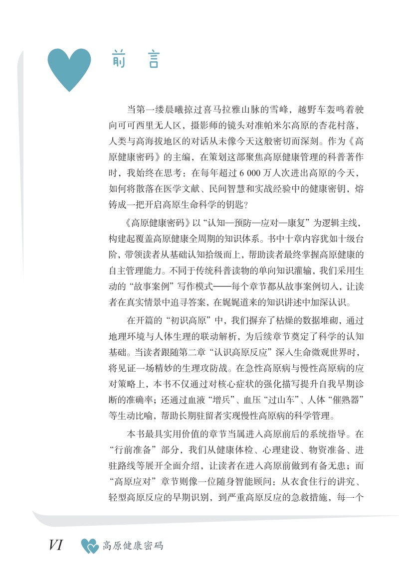 本书以案例引导,围绕高原自然特征,机体在高原习服中各系统的变化,进入高原后因缺氧而发生的身体机能障碍和疾病,健康人群及常见慢性病患者急进高原医学指导,以及促进机体习服适应的急进高原措施,重点介绍针对高原病广泛和基础的干预手段,系统详尽地介绍新的高原医学研究进展和实用指南。并为急进高原人群介绍了以临床医学原则为基础的预防、诊断和治疗手段。初进高原旅行者、短期赴高原执行任务者以及医务工作者,都可以通过本书获得人在高原机能变化、高原病防治的科学知识。