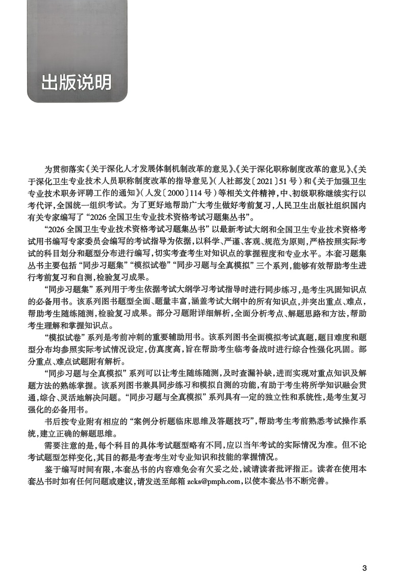 “全国卫生专业技术资格考试习题集丛书”以新考试大纲和全国卫生专业技术资格考试用书编写专家委员会编写的考试指导为依据,编写工作遵循科学、严谨、客观、规范的原则,严格按照实际考试的科目划分和题型分布进行编写,切实考查考生对知识点的掌握程度和专业水平。本系列丛书包括《同步习题与全真模拟》《同步习题集》《模拟试卷》等,能够有效帮助考生考前复习、自测和反馈学习成果。《同步习题与全真模拟》中的同步习题部分按考试指导的章节编写,题型全面,题量丰富,涵盖考试大纲的所有知识点,突出重点、难点;模拟试卷部分试题难度和题型分布参考实际考试情况设定,仿真度高,用于考生考前自测。