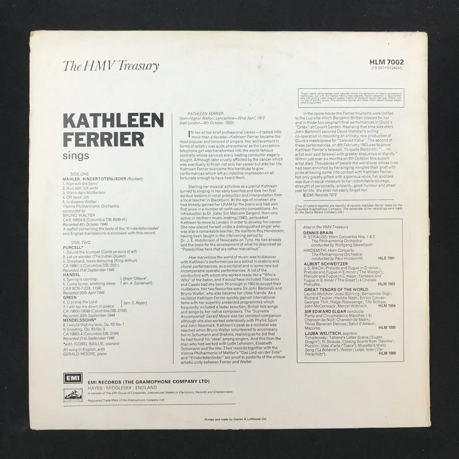 LP黑胶唱片 凯瑟琳·费丽尔演唱作品集 马勒《亡儿悼歌》及亨德尔/门德尔松作品 维也纳爱乐乐团 指挥家:布鲁诺·瓦尔特厂牌:His Master's Voice