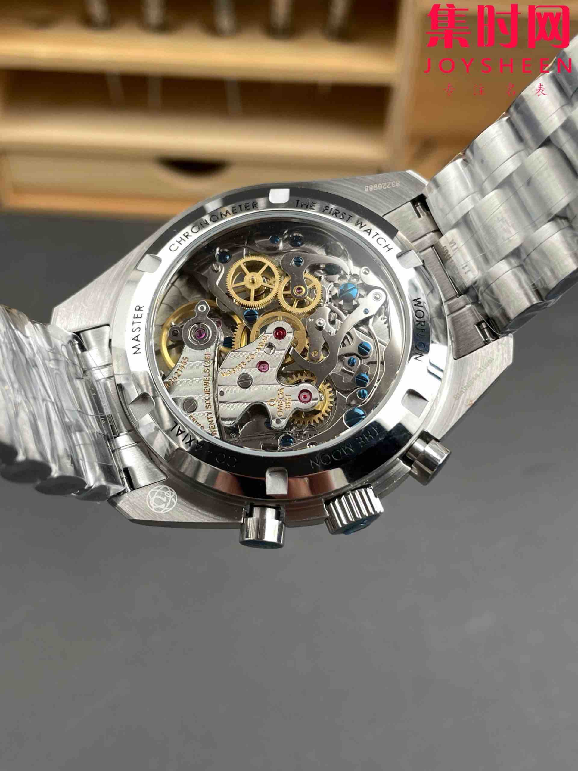 陶瓷表圈上的测速刻度由OMEGA Ceragold 技术制成,并设有早期超霸表款的“Dot Over Ninety” (DON,刻度90的圆点位于数字上方) 标志。经抛光处理,采用双斜面设计风格,镌刻有“THE FIRST WATCH WORN ON THE MOON”和“CO-AXIAL MASTER CHRONOMETER”字样。透过平面蓝宝石玻璃表背,可以欣赏定制Cal.3861手动上链机械机芯的运转美态。
