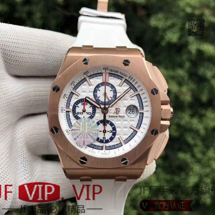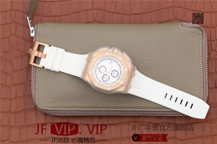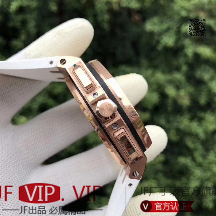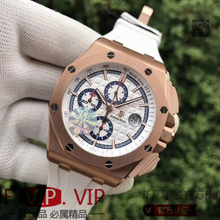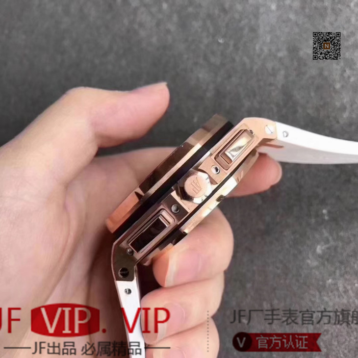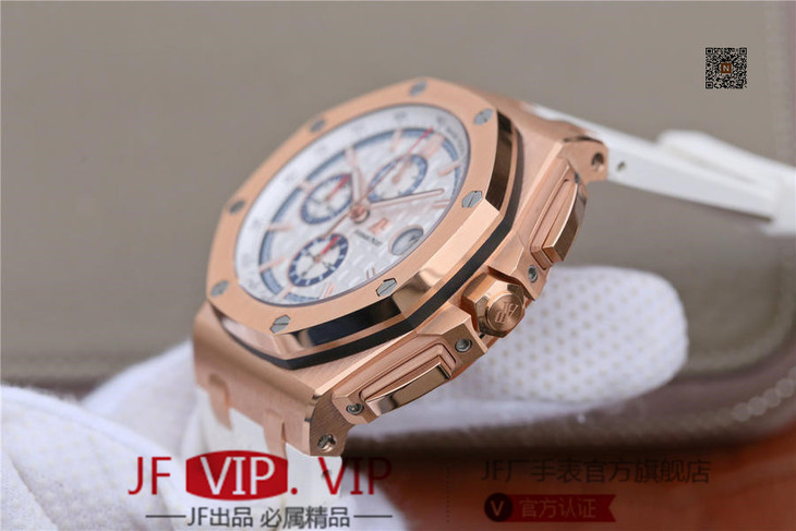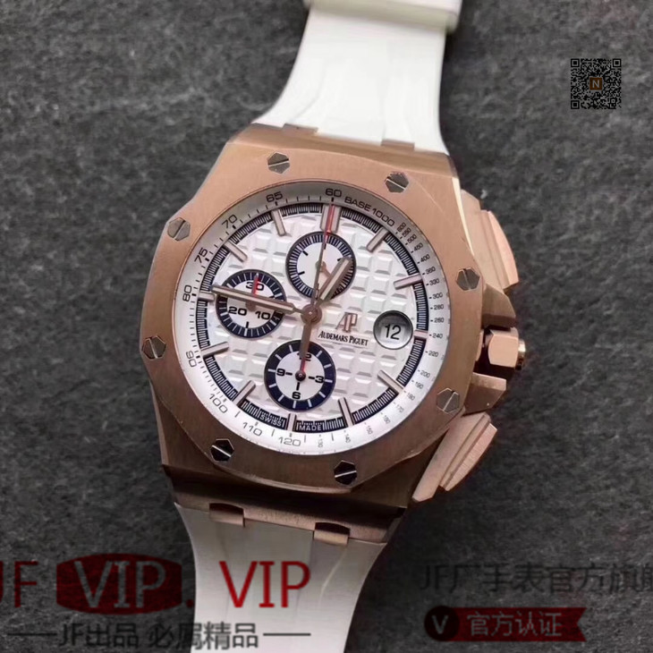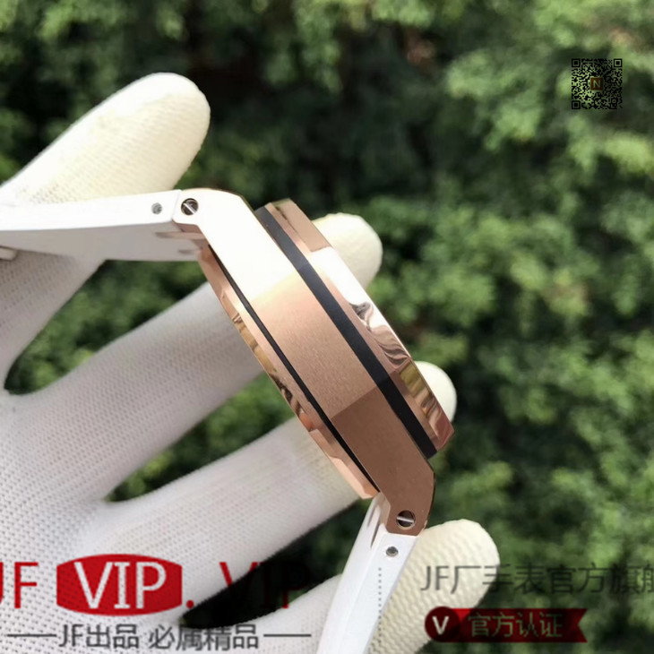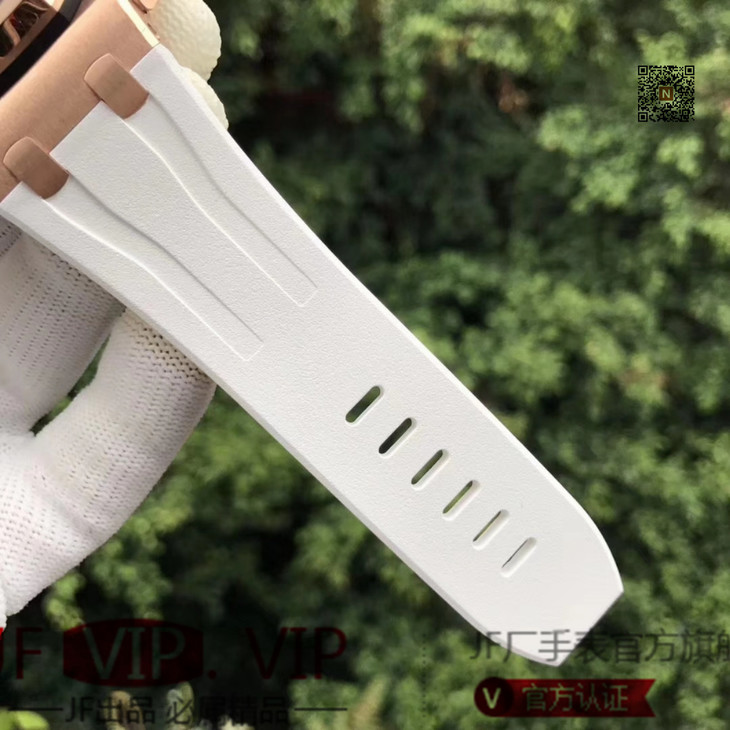 JF爱彼皇家橡树离岸型26408OR.OO.A010CA.01男士腕表。Calibre 3126/3840自动机械机芯(基础机芯上海7750),44毫米直径,镀18k玫瑰金。顶尖做工。橡胶表带,透底