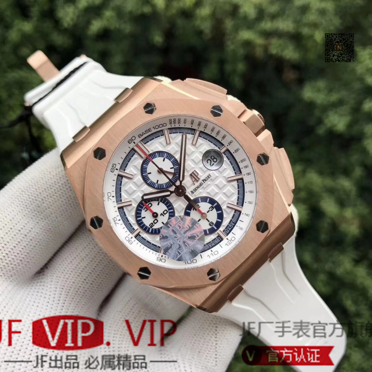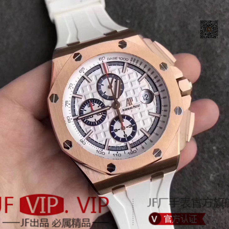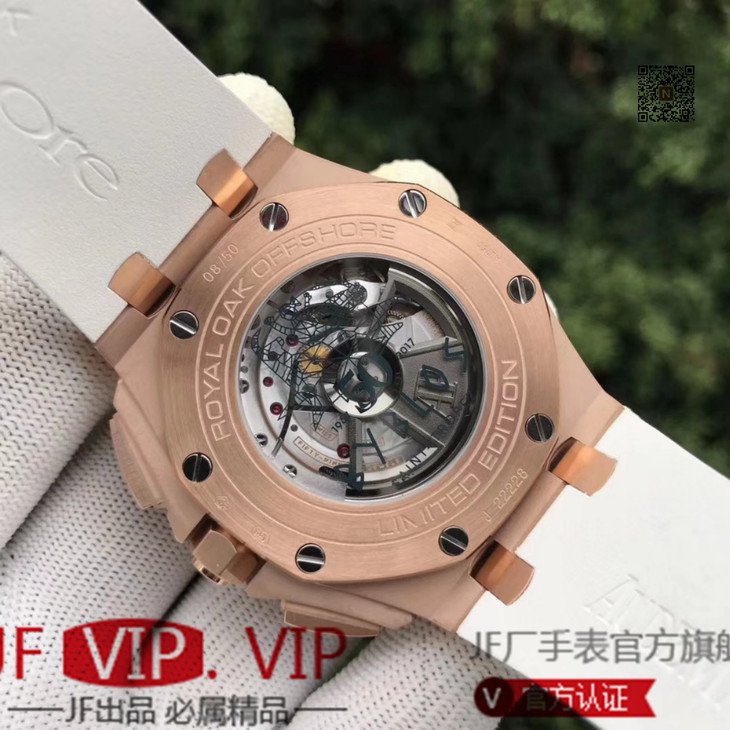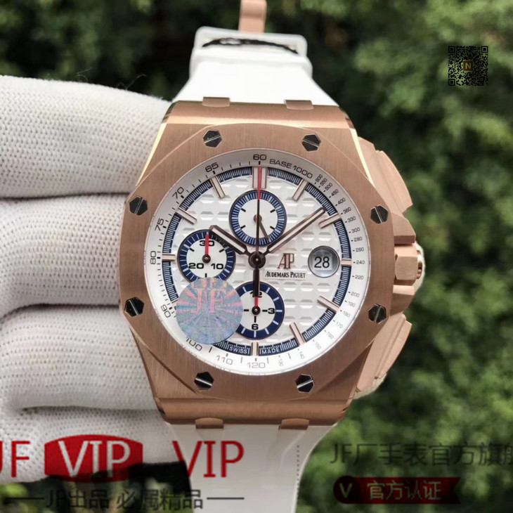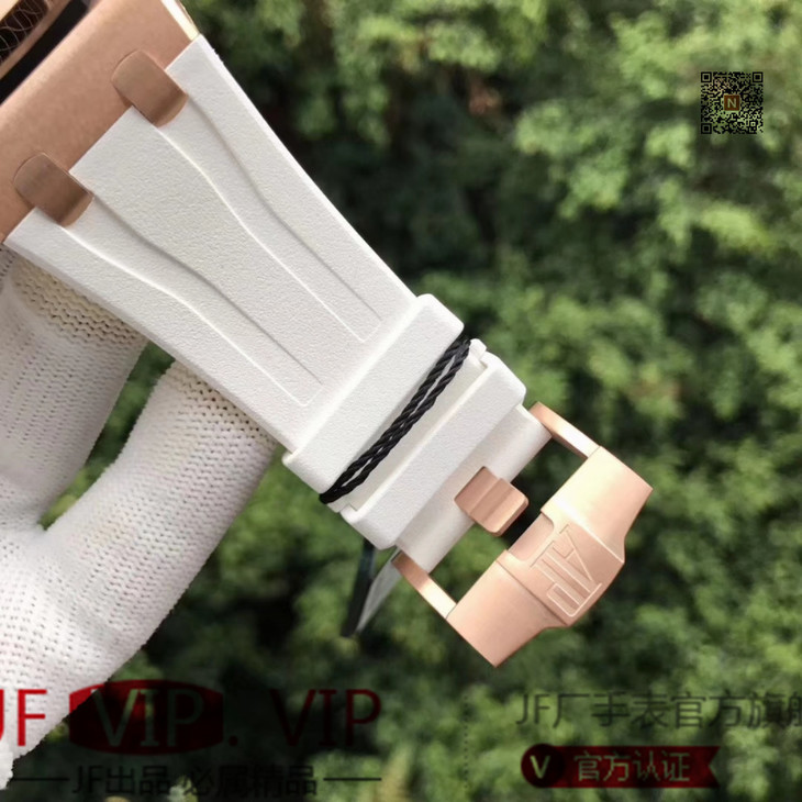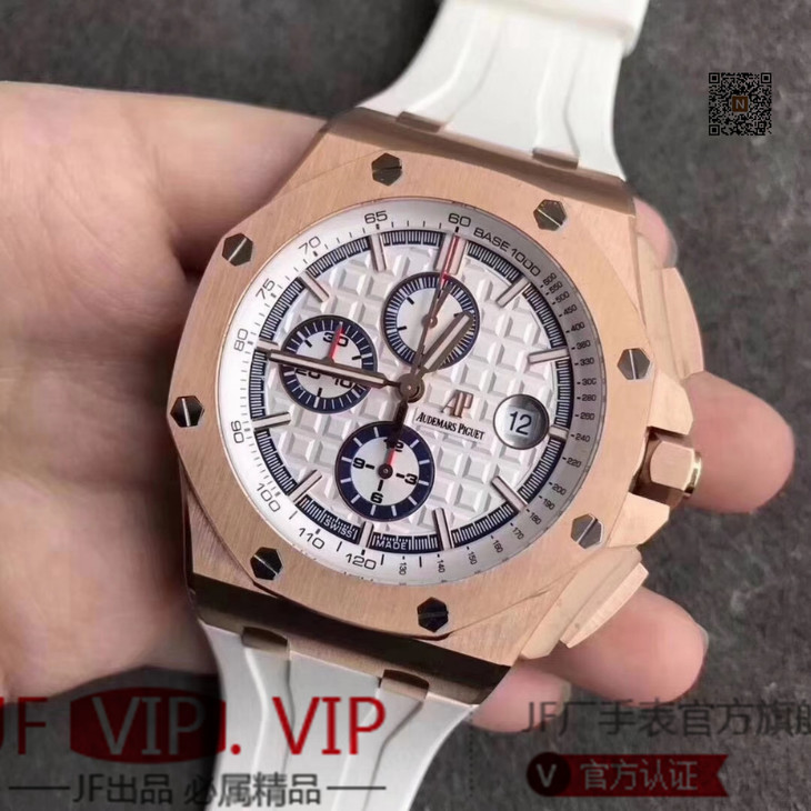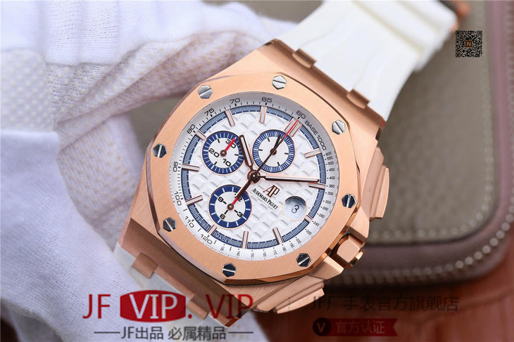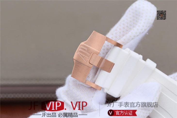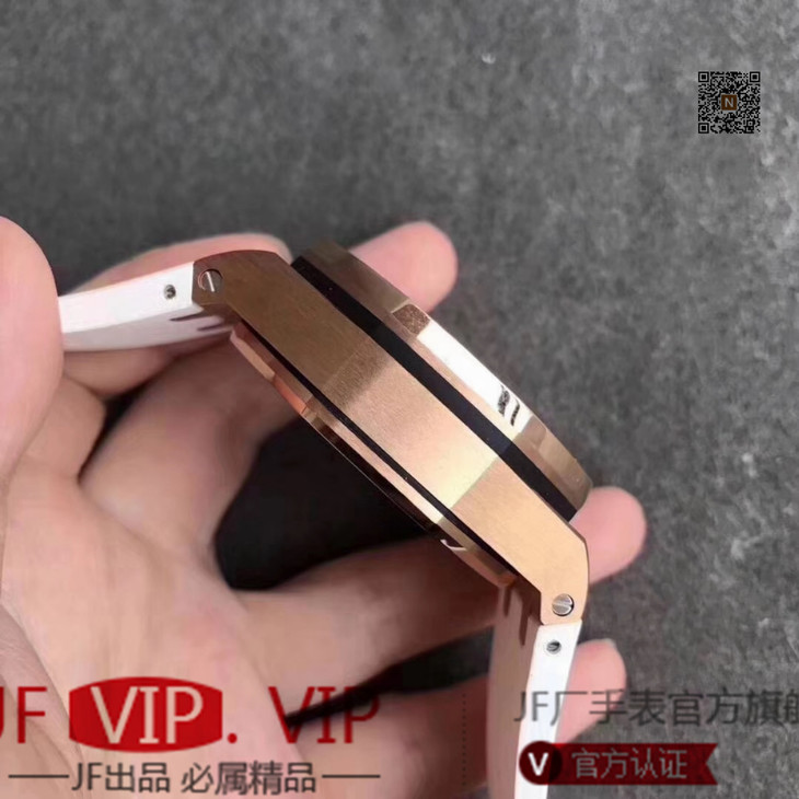 JF爱彼皇家橡树离岸型26408OR.OO.A010CA.01男士腕表。Calibre 3126/3840自动机械机芯(基础机芯上海7750),44毫米直径,镀18k玫瑰金。顶尖做工。橡胶表带,透底