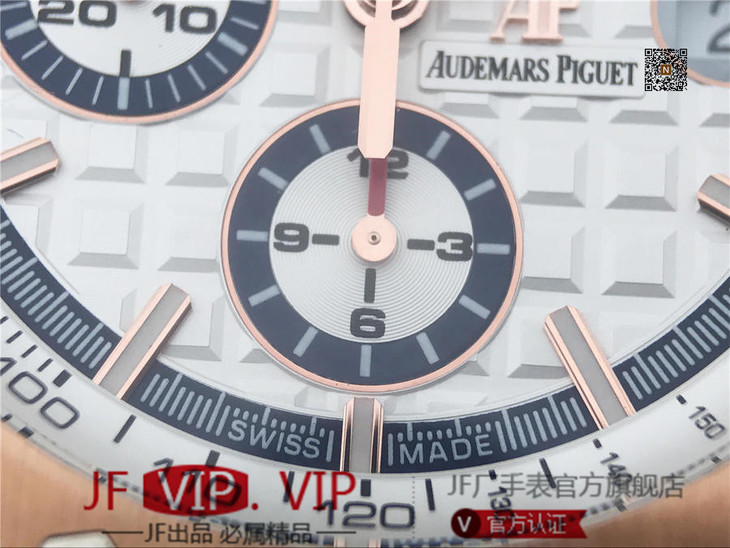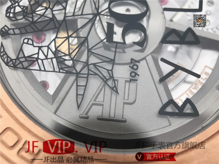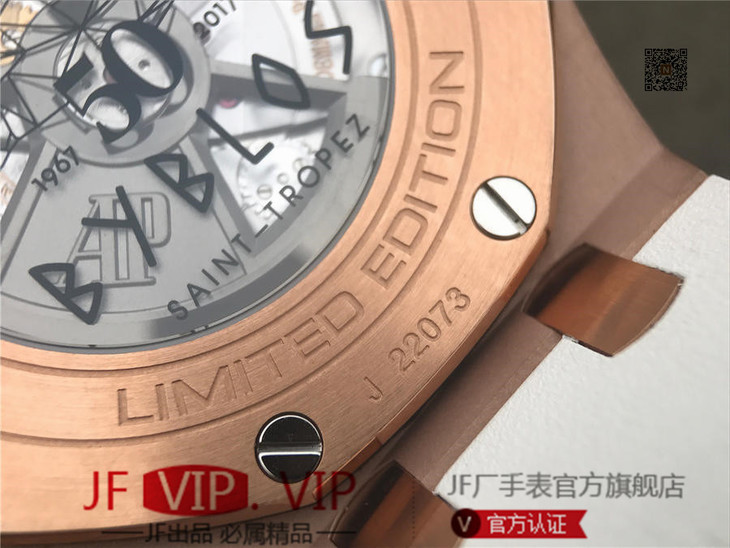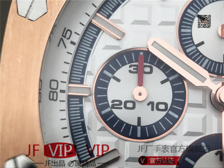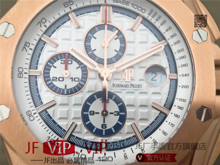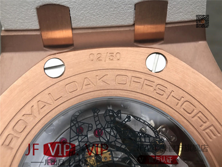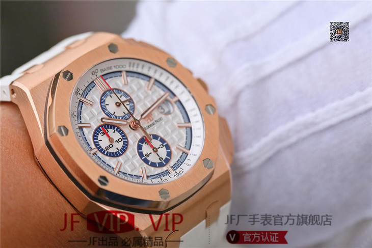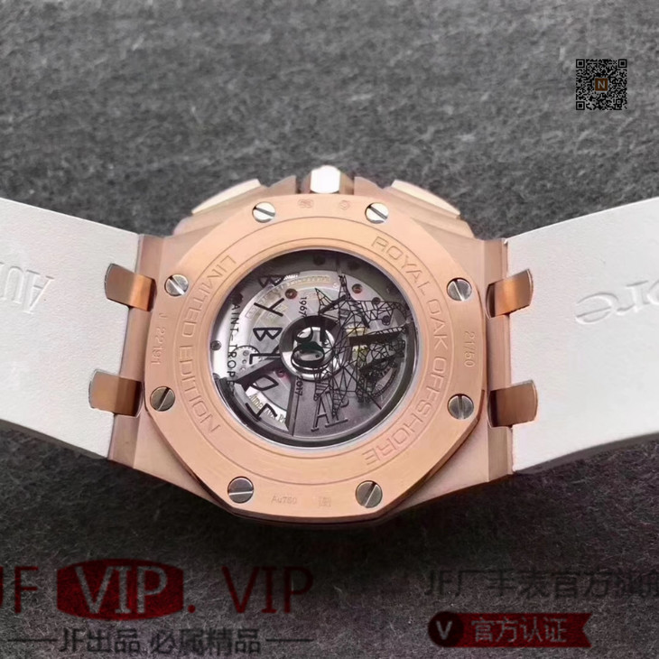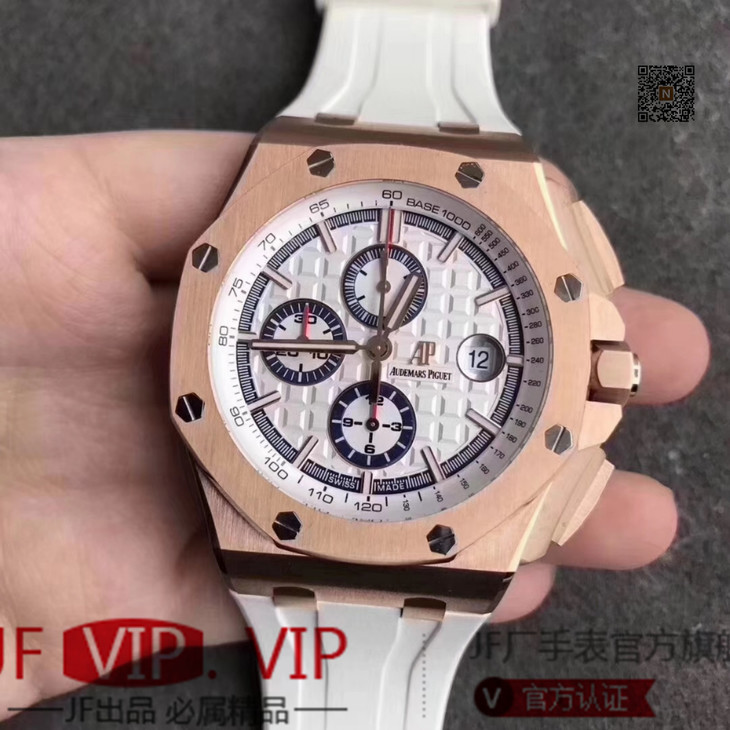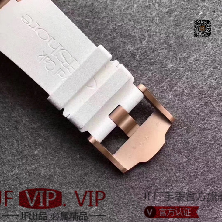 JF爱彼皇家橡树离岸型26408OR.OO.A010CA.01男士腕表。Calibre 3126/3840自动机械机芯(基础机芯上海7750),44毫米直径,镀18k玫瑰金。顶尖做工。橡胶表带,透底