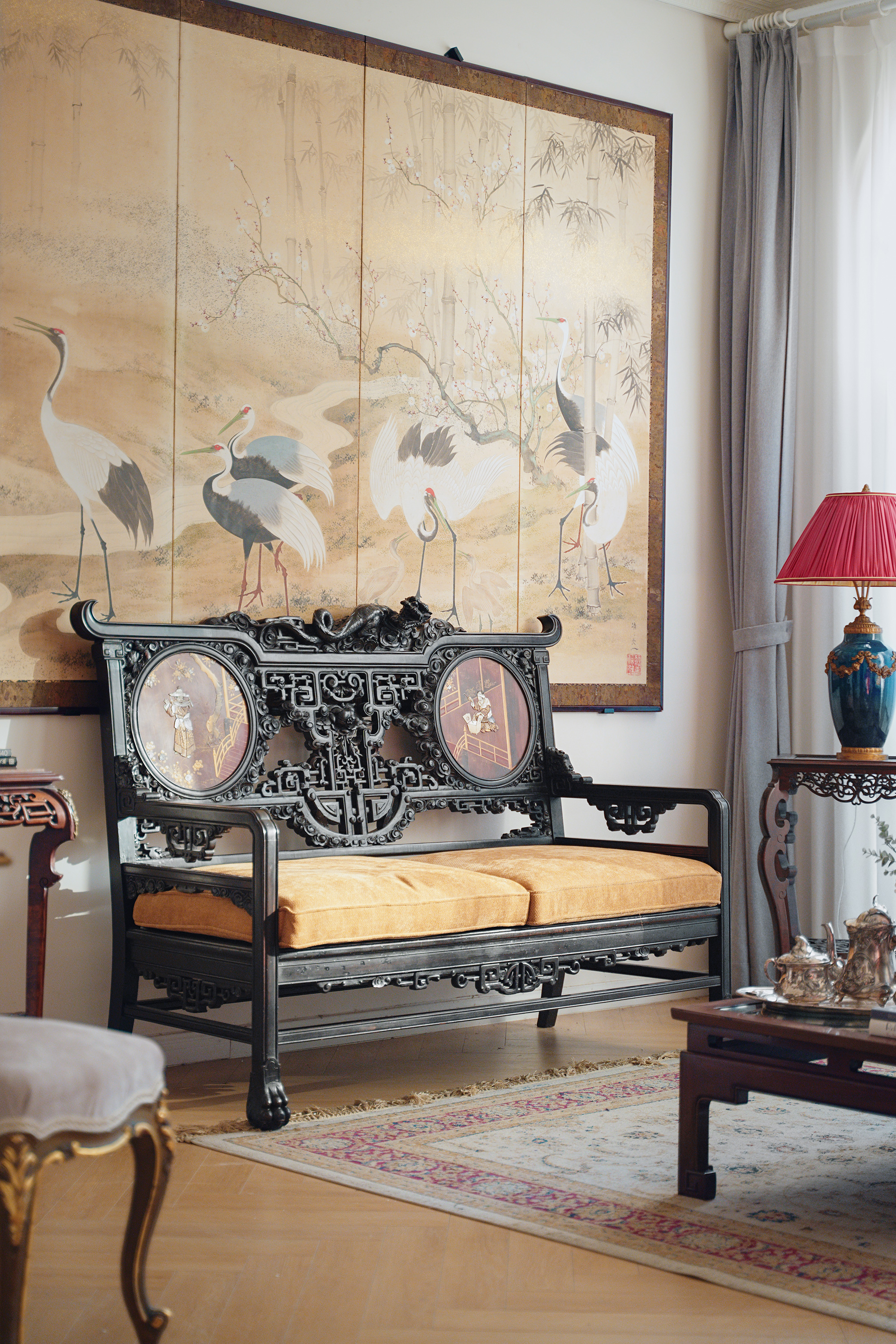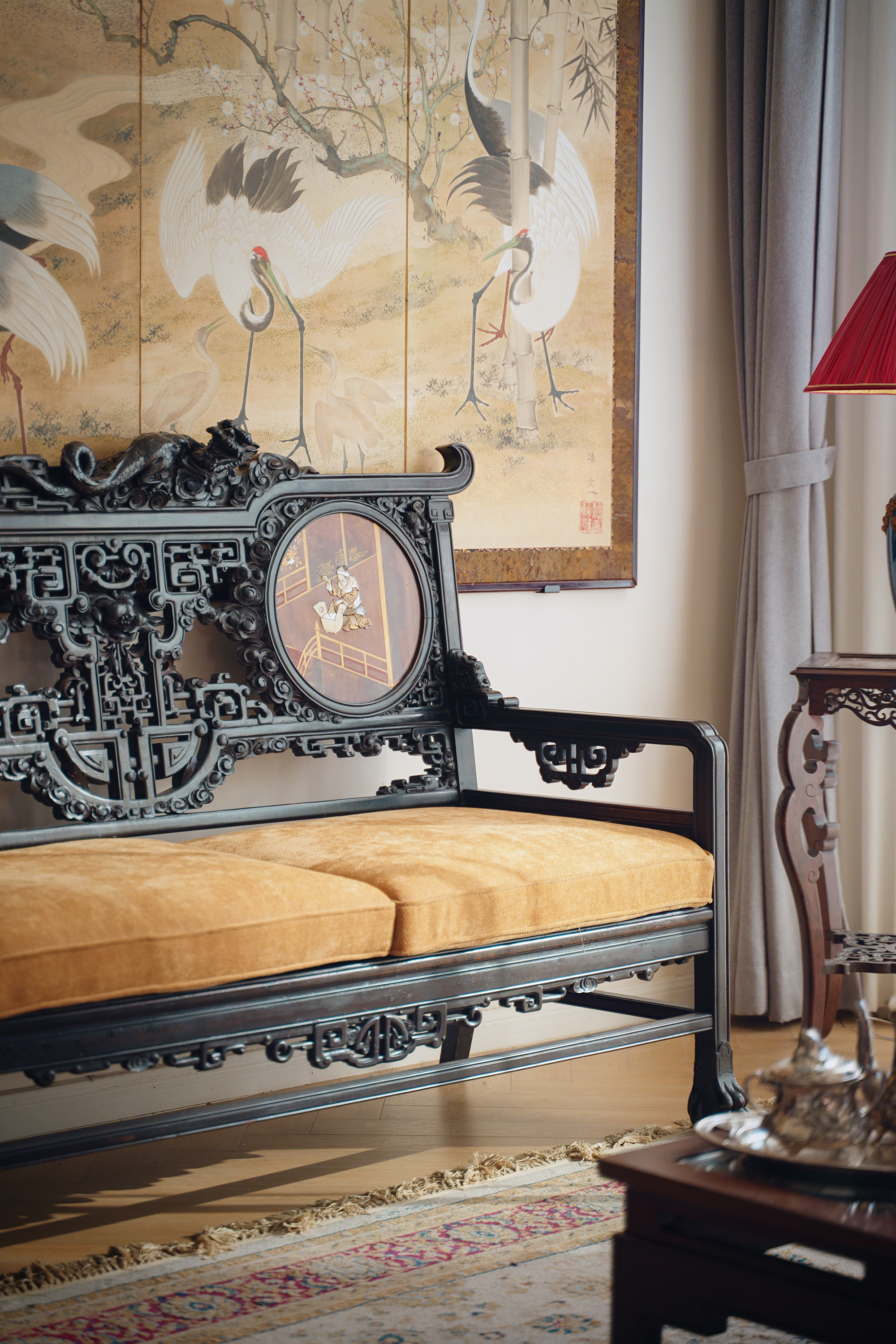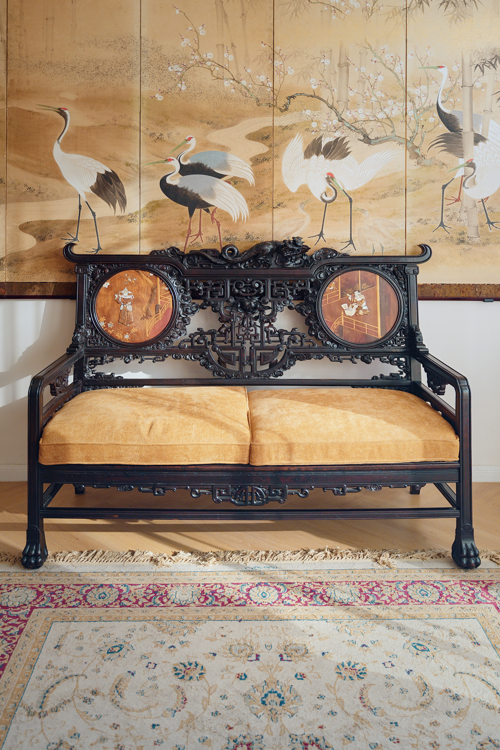 19世纪末法国出品VIARDOT东方风格蟠龙祥云纹硬木精雕装饰传统人物主题绘金漆母贝镶嵌面板双人沙发
