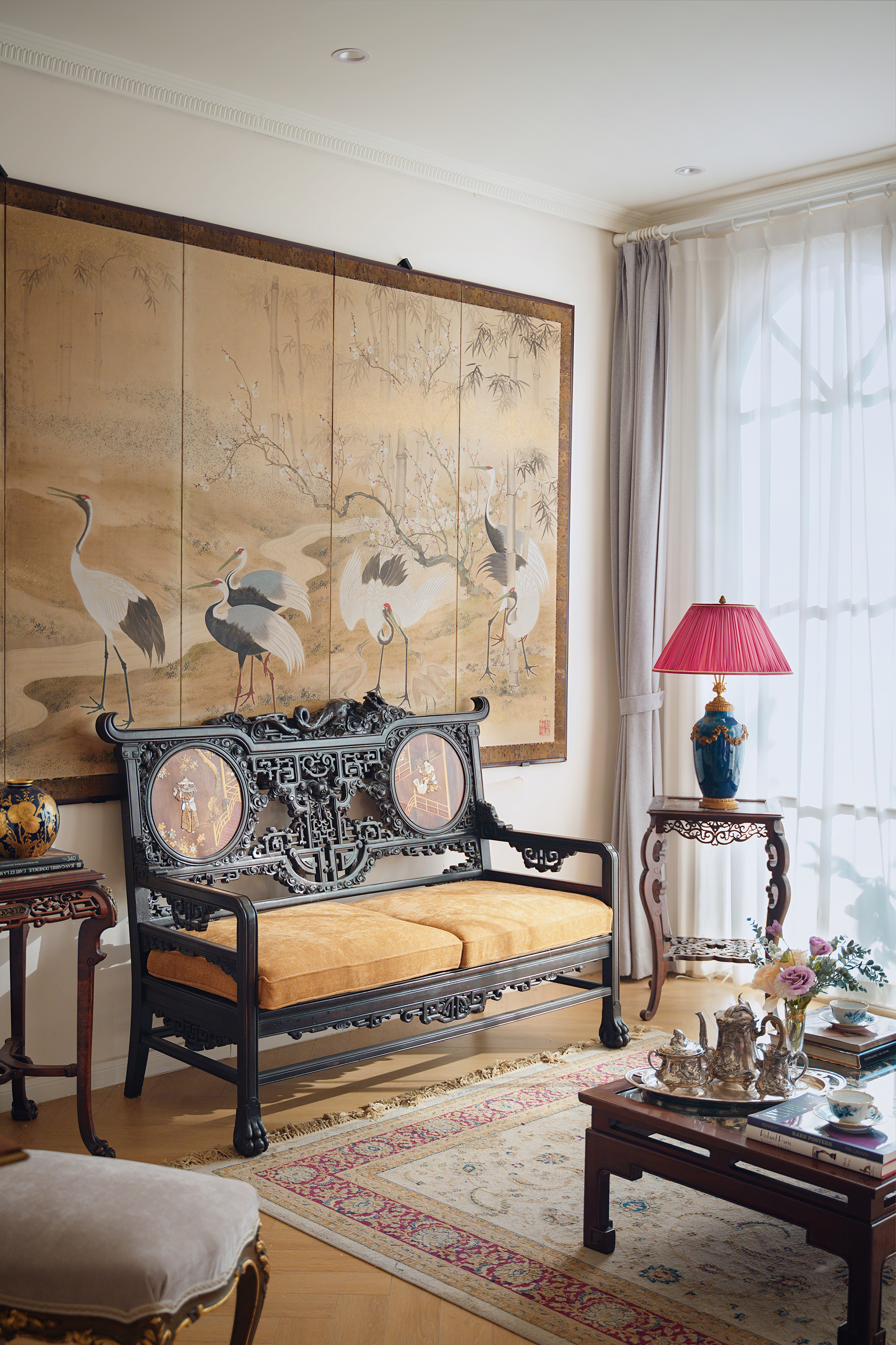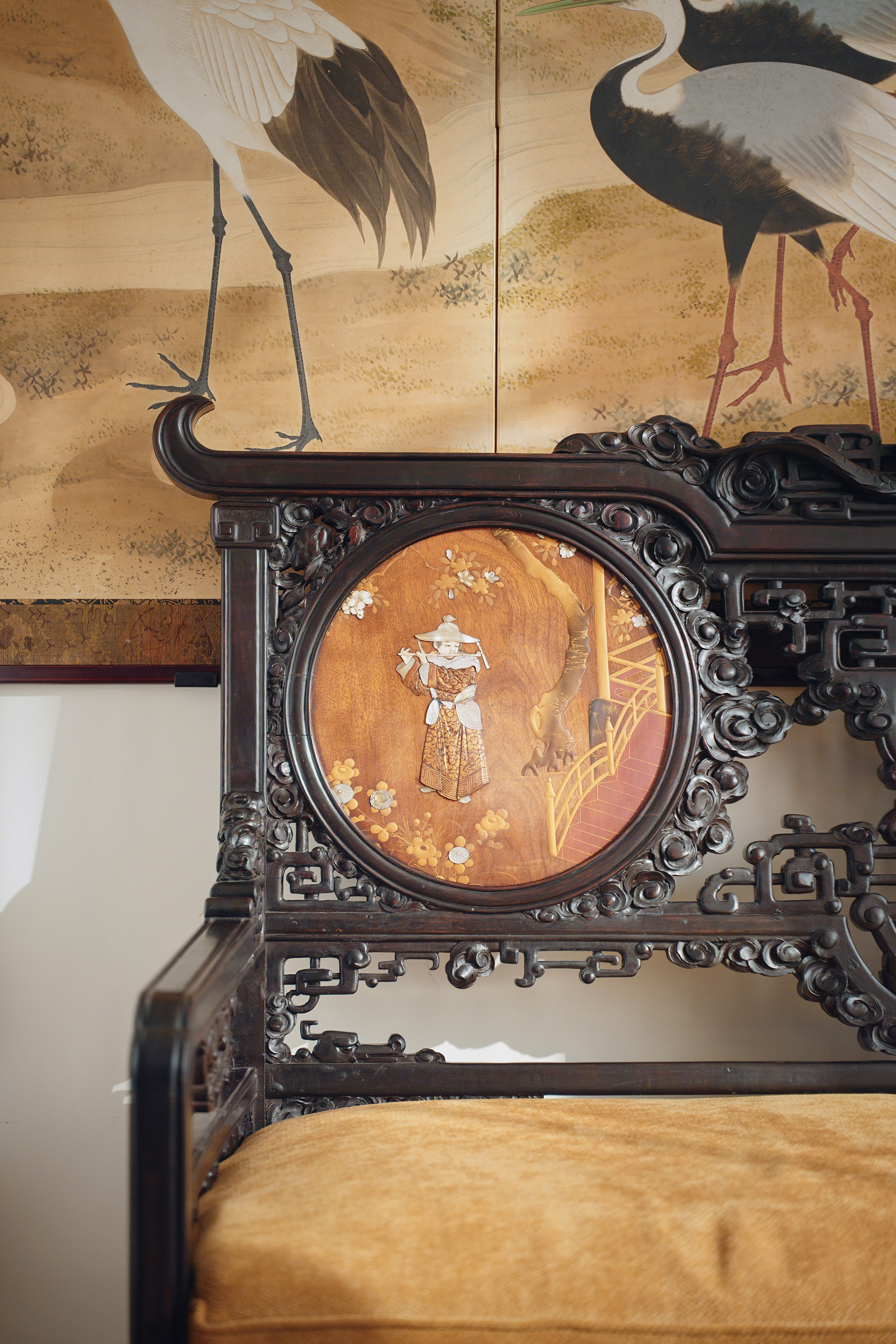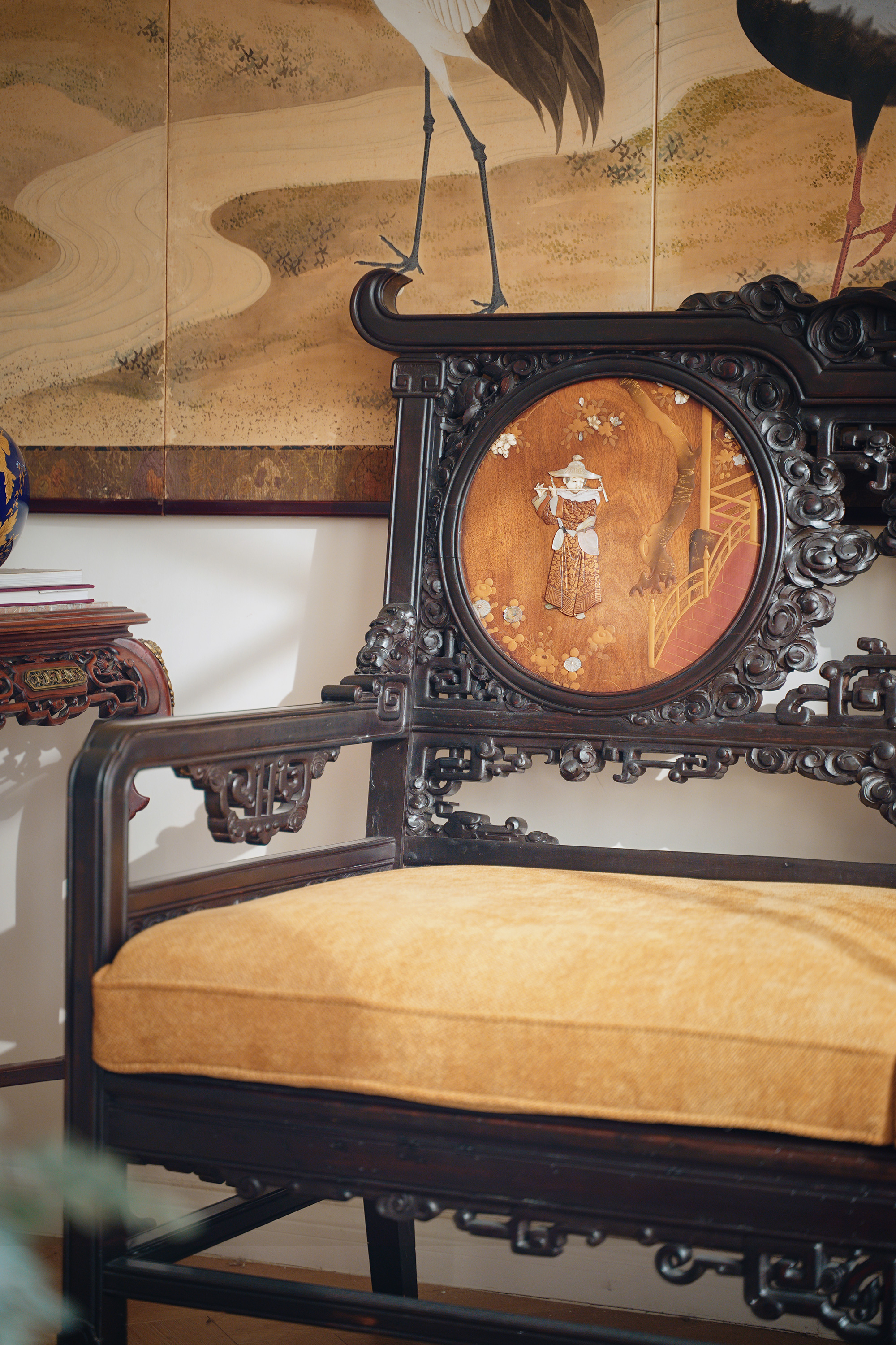 19世纪末法国出品VIARDOT东方风格蟠龙祥云纹硬木精雕装饰传统人物主题绘金漆母贝镶嵌面板双人沙发