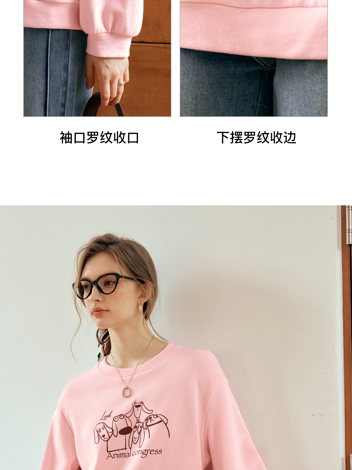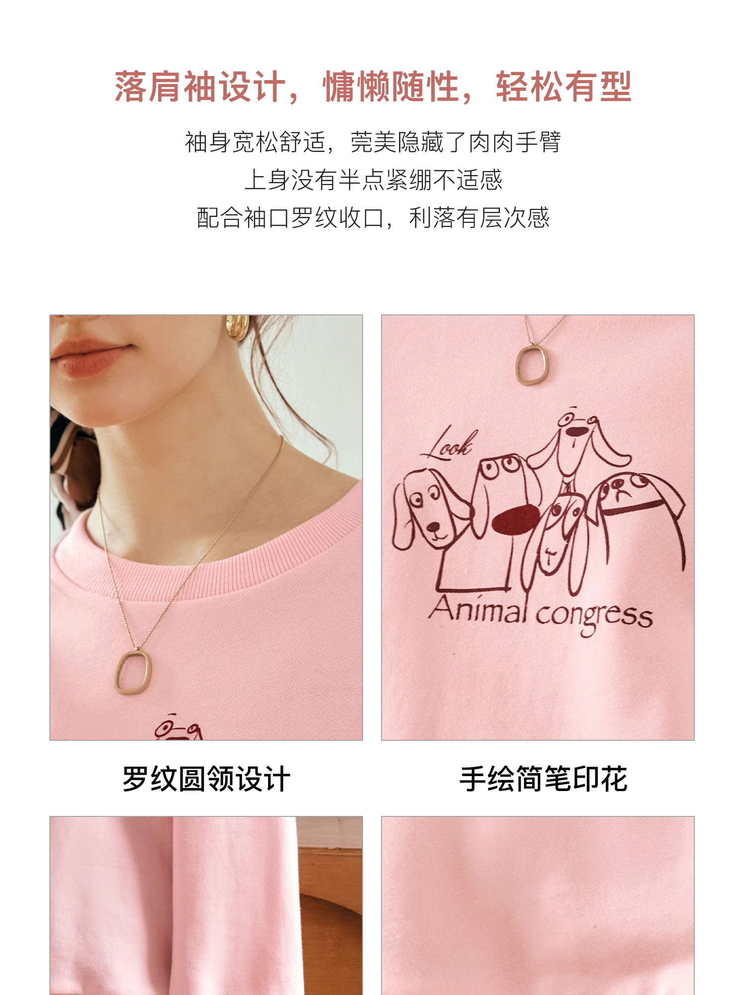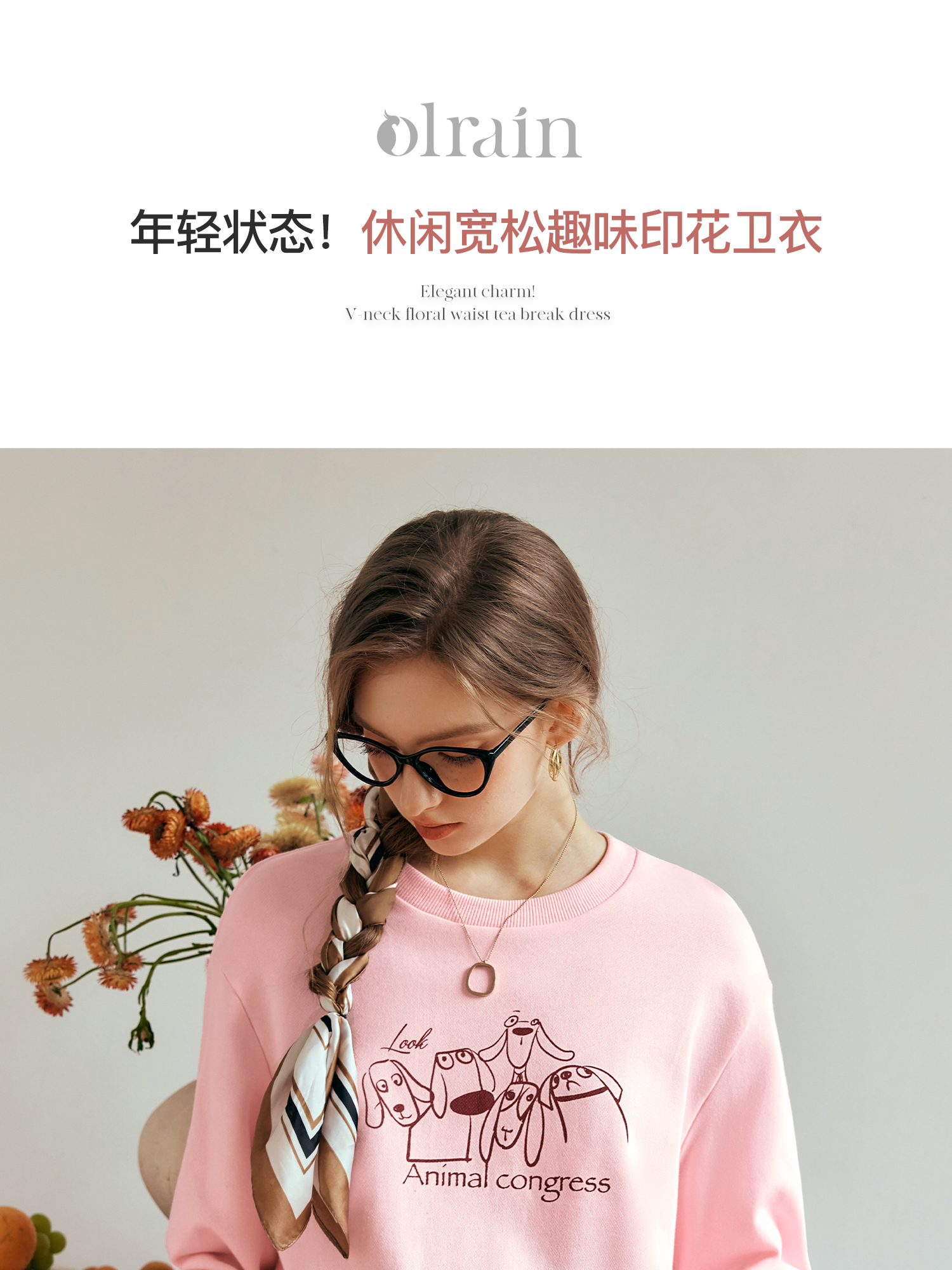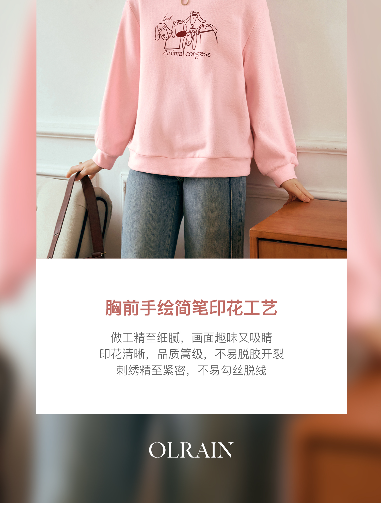 OLrain欧芮儿粉色套头卫衣女秋季2024年新款休闲宽松趣味印花上衣