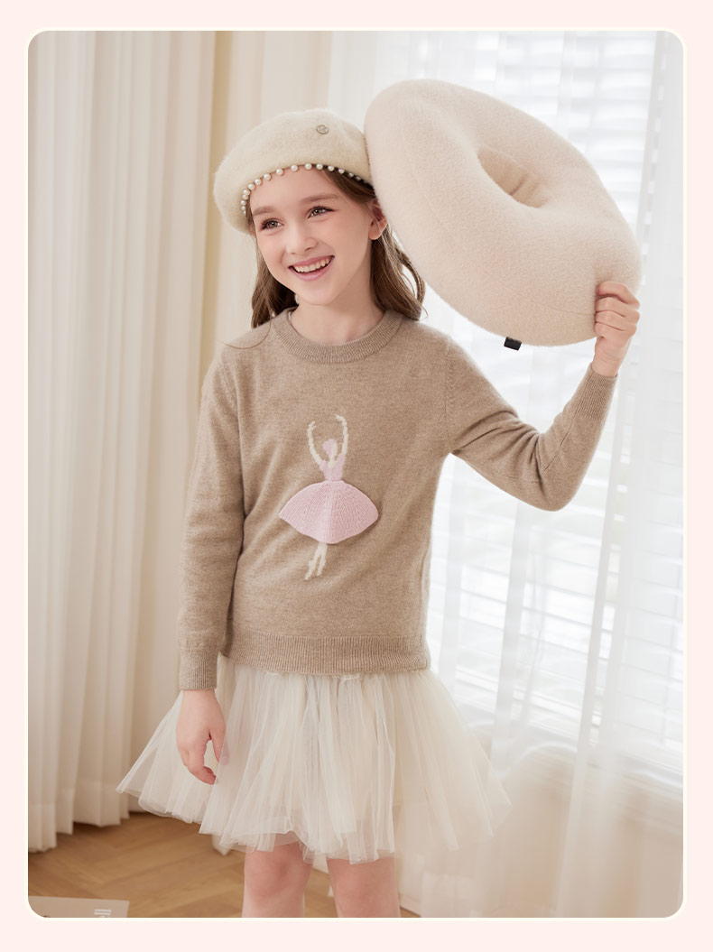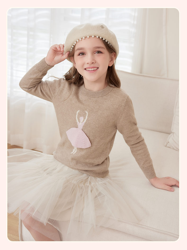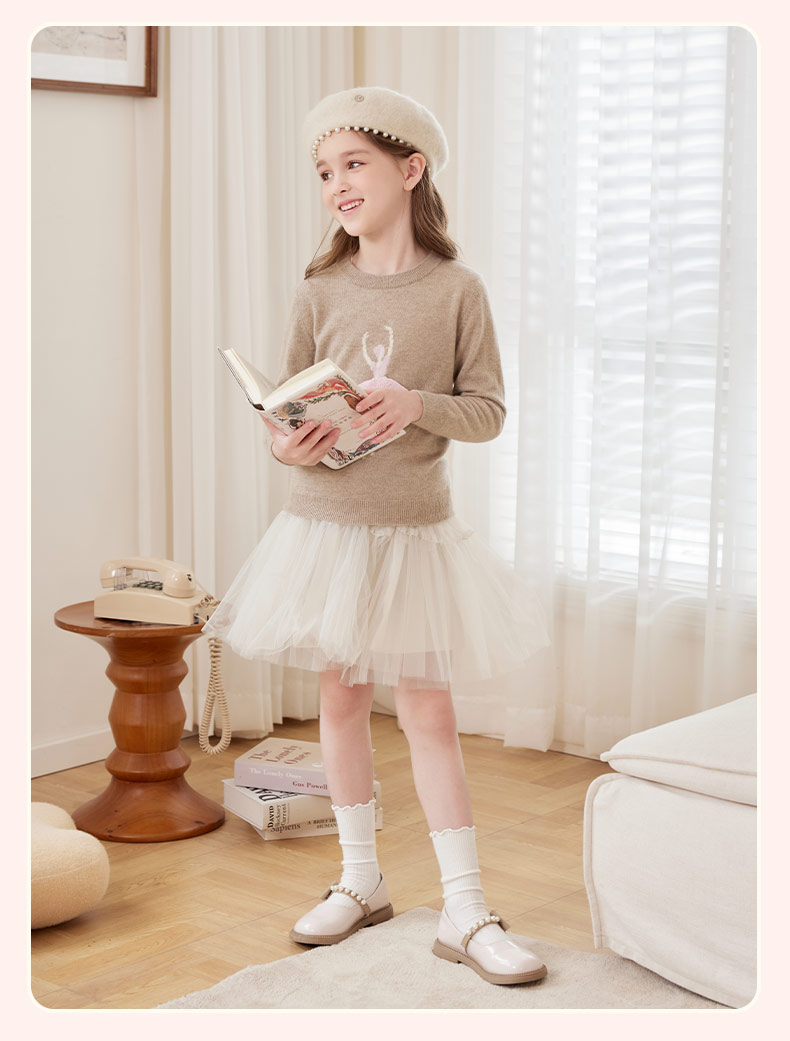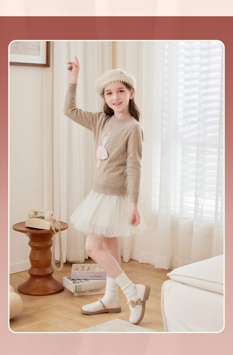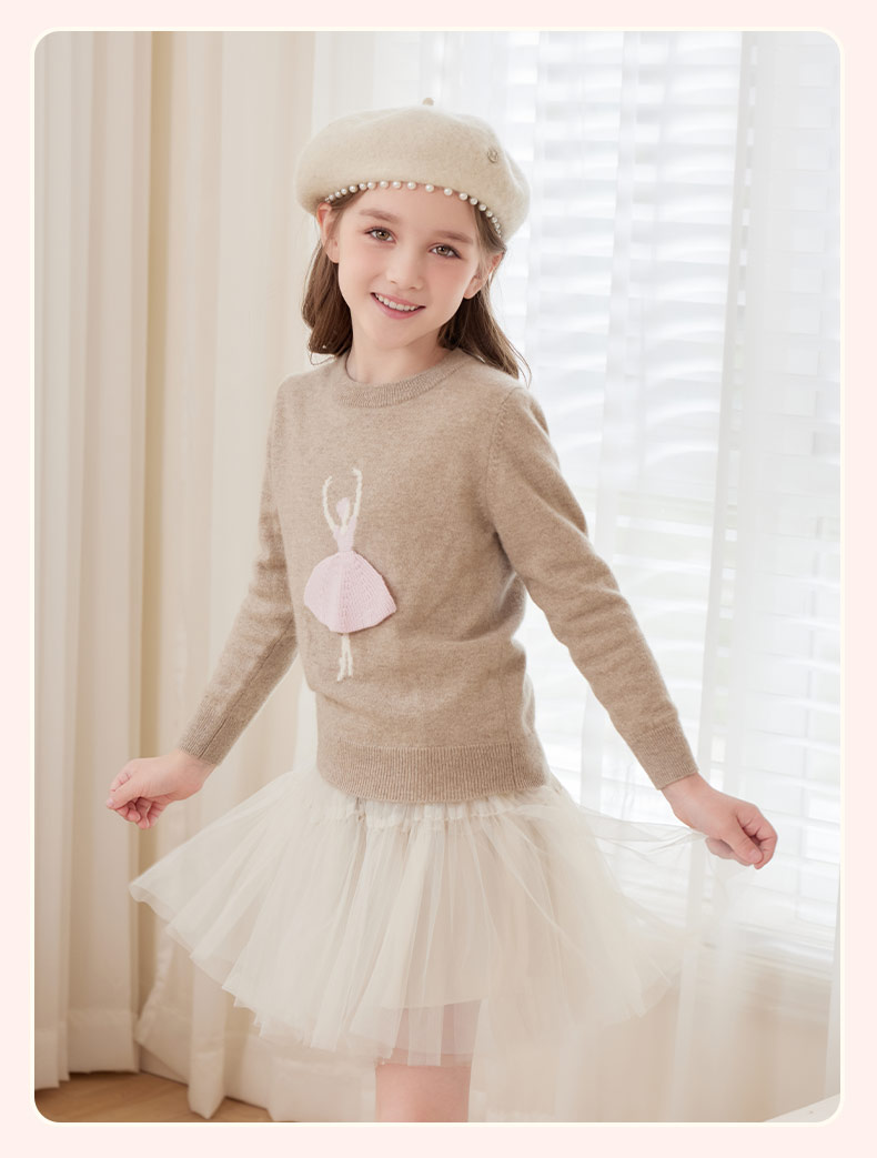 mettekids儿童100%羊绒衫2024秋季新款女童杏色毛衣甜美针织衫
