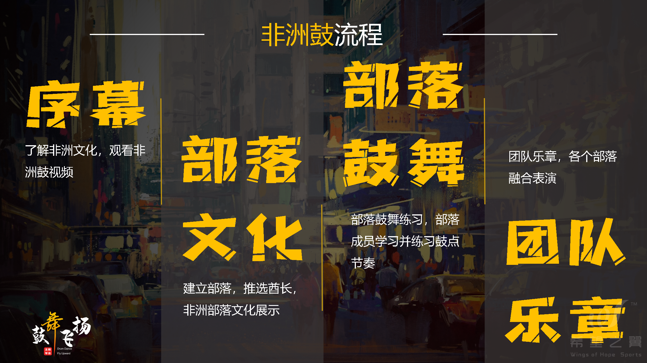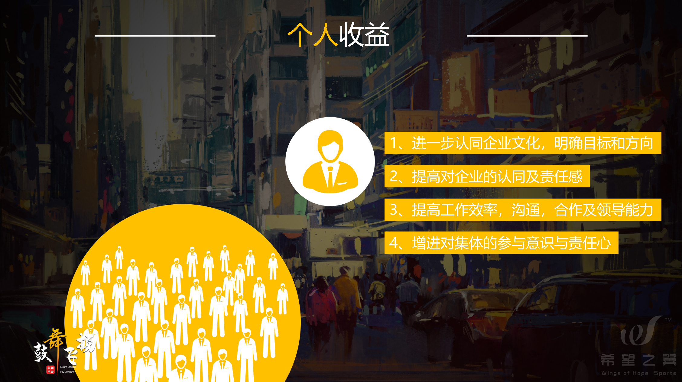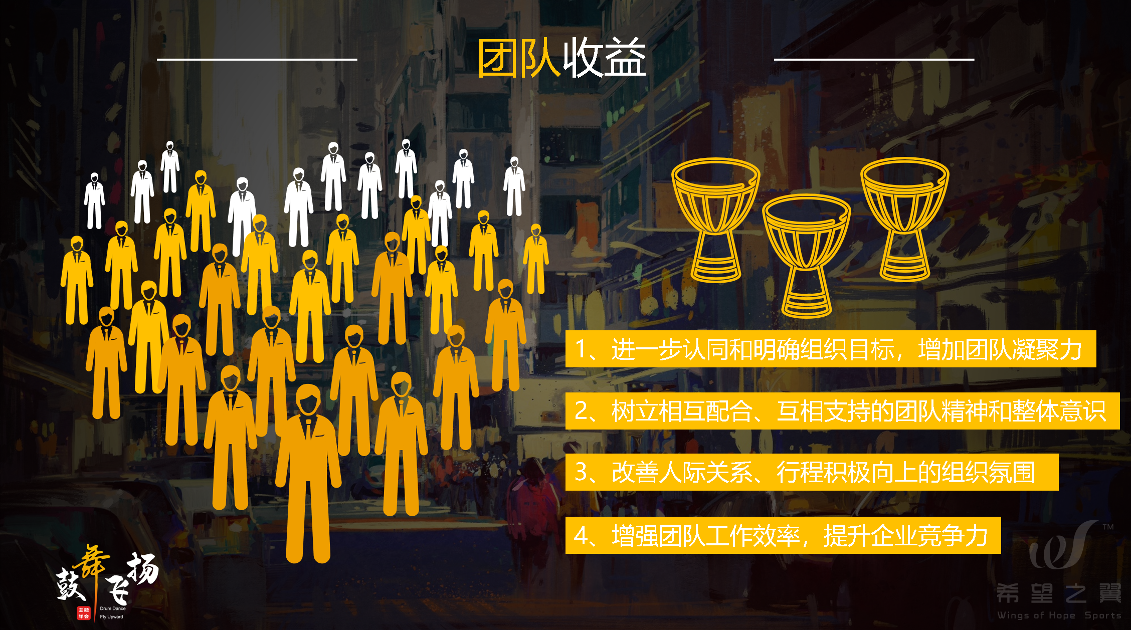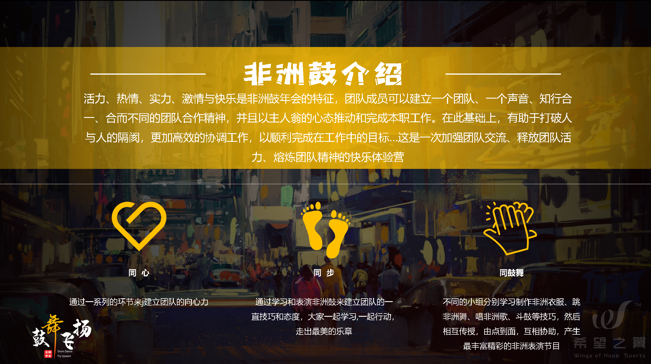 1. 团队建设 使用打击乐、舞蹈、艺术表达等国际元素,鼓舞员工士气,促进相互沟通与理解,从而打造出士气高昂的团队。