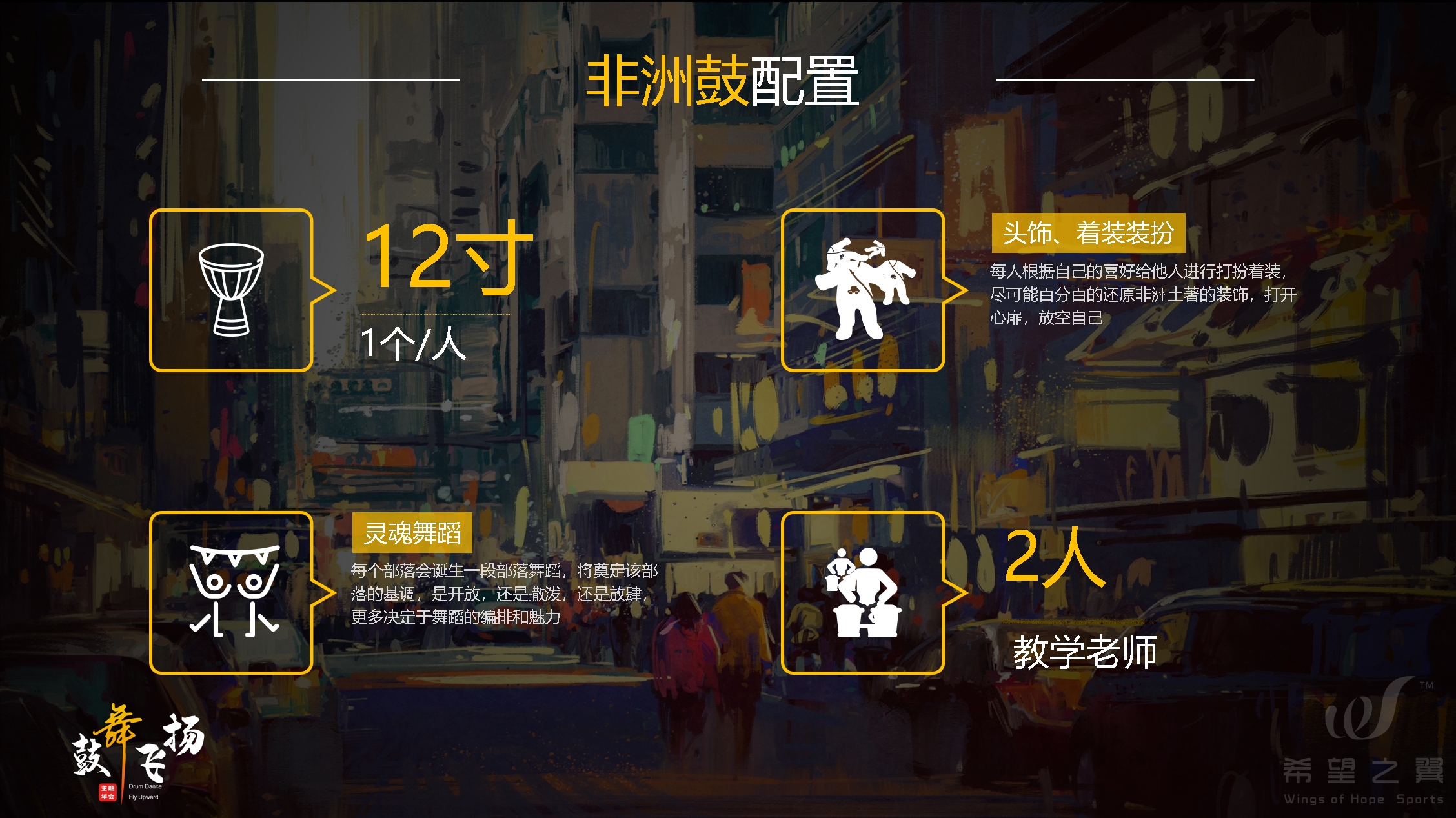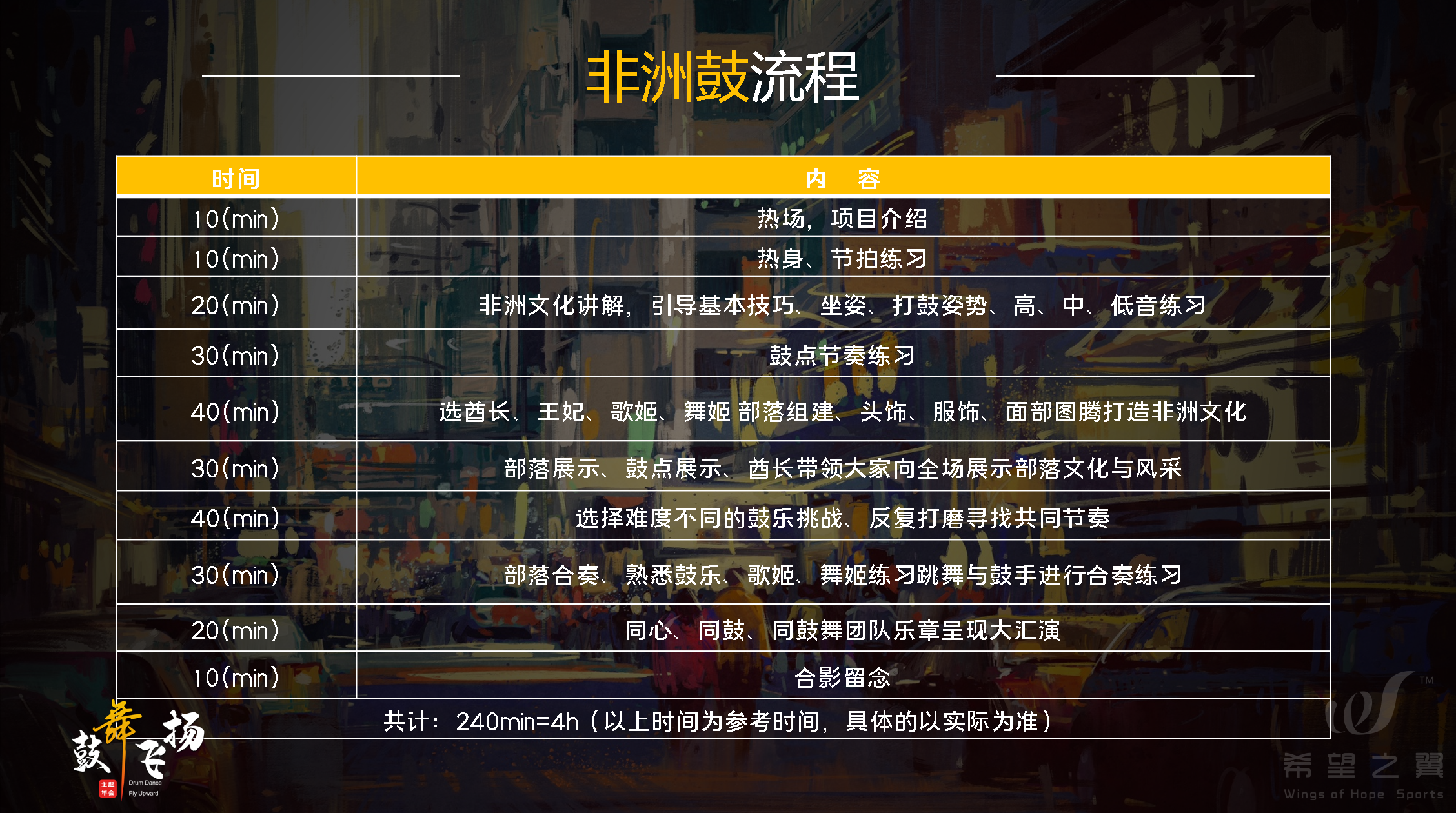 配备专业非洲鼓,练习节奏、间阶、非洲歌曲与舞蹈,从鼓的文化到大草原的热情奔放,再到团队的鼓舞飞扬,开始一场热情奔放的欢乐之旅。