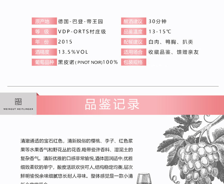 海特林格庄园巴登黑皮诺红葡萄酒 2015 Weingut Heitlinger Pinot Noir 2015 750ml/瓶