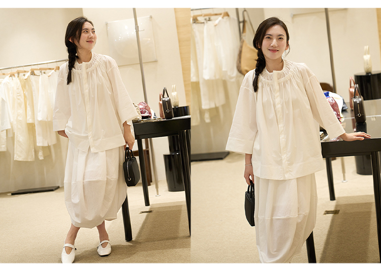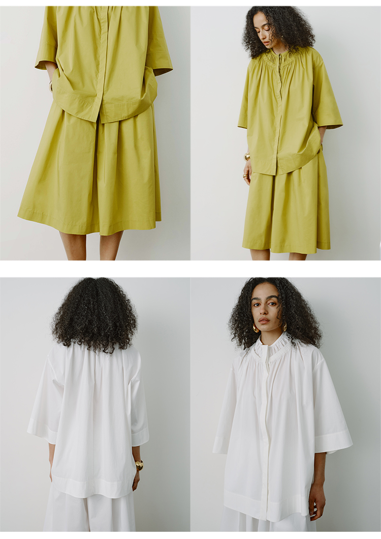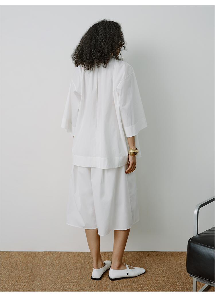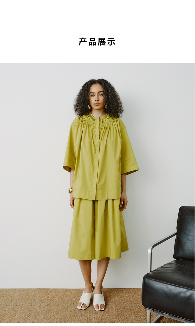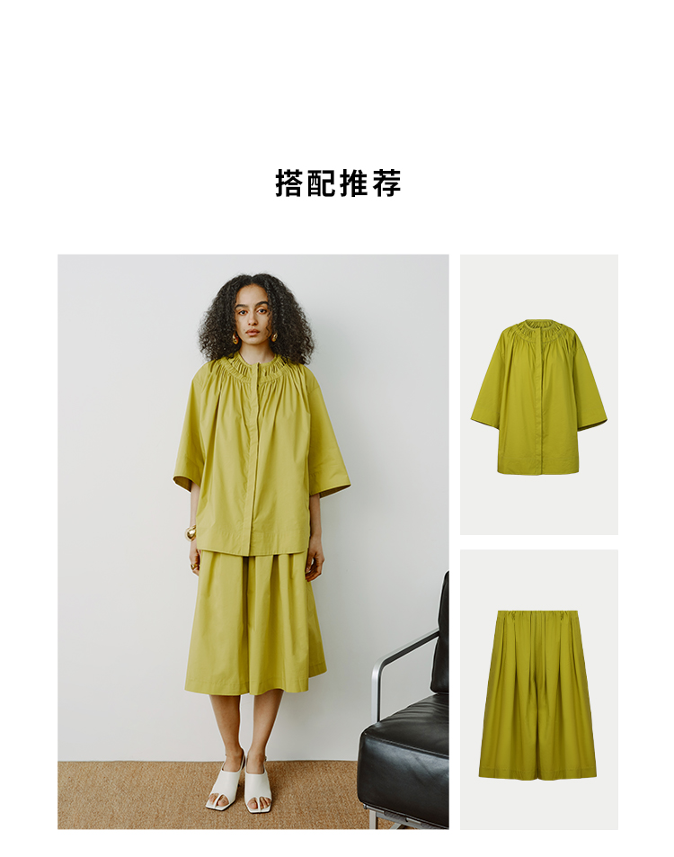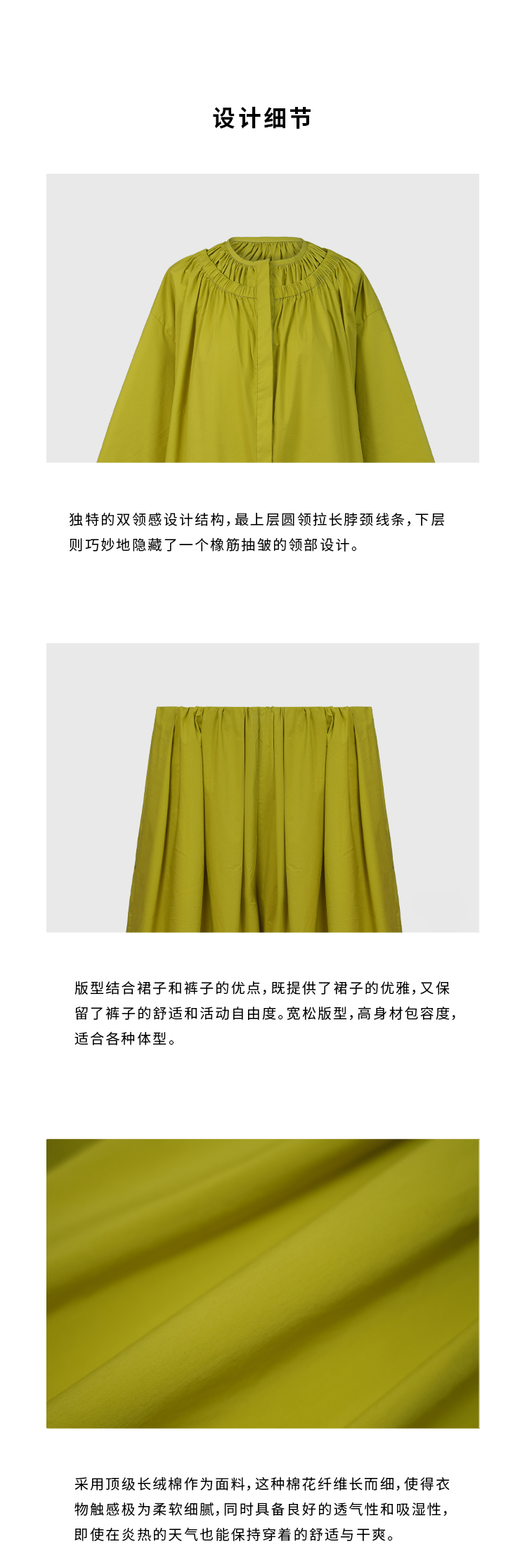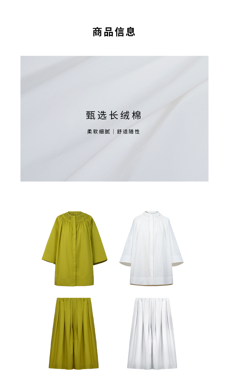 HIDEMI【当当同款】 浅春系甄选长绒棉极简设计感花苞压褶圆领廓形衬衫裙裤套装 白色/有机青柠绿 衬衫/裙裤