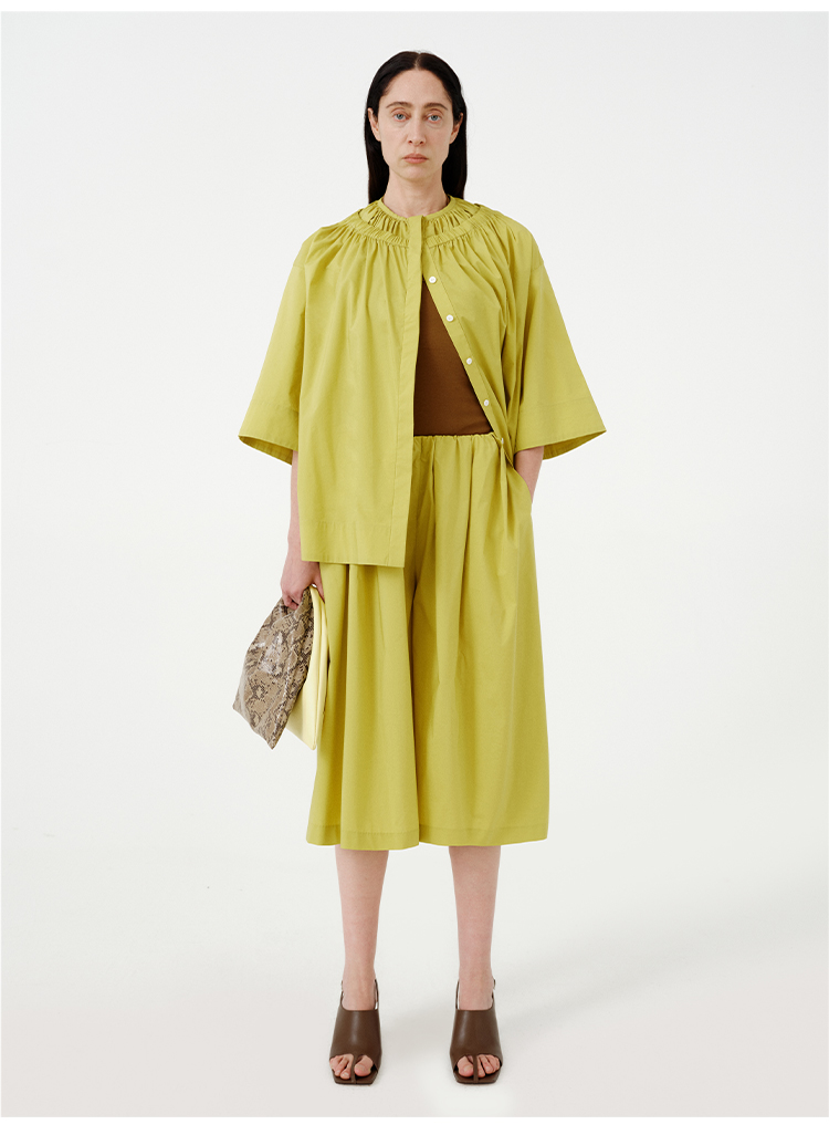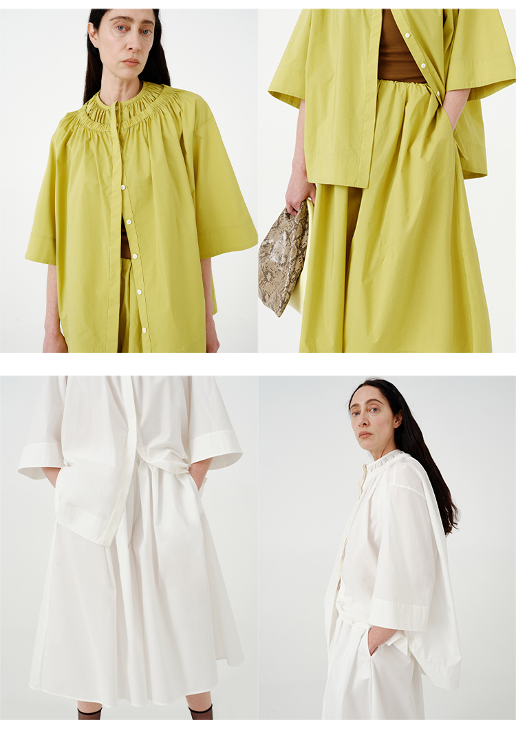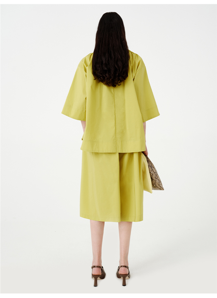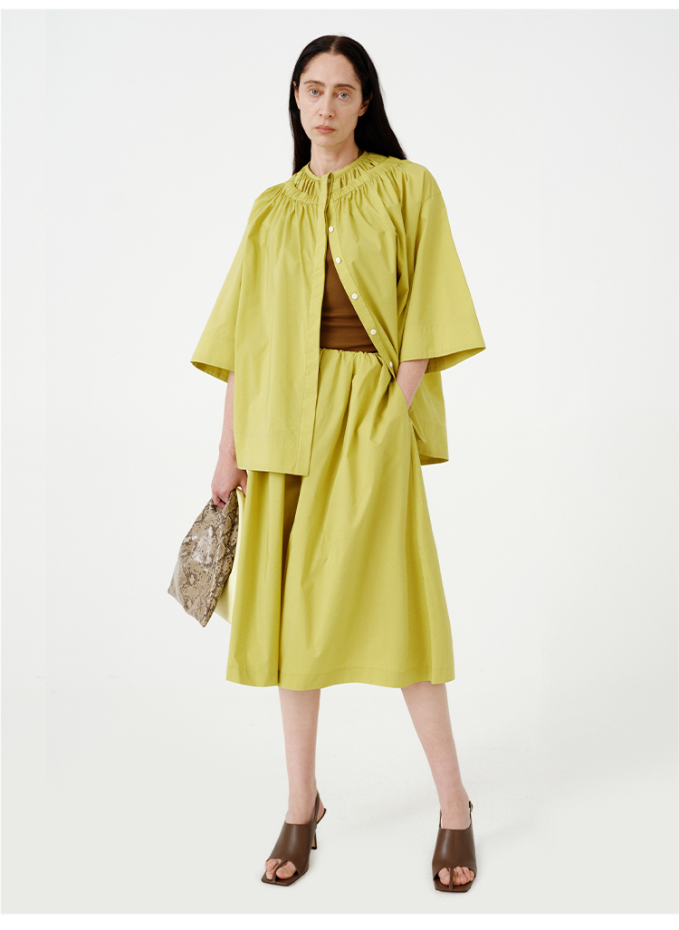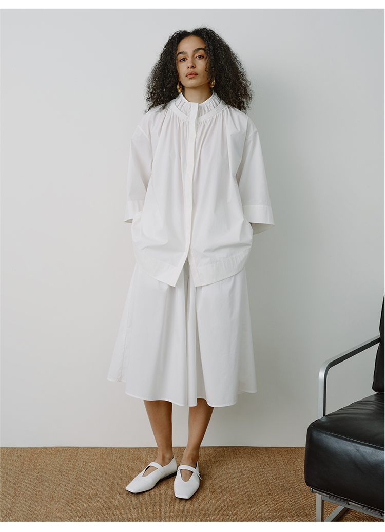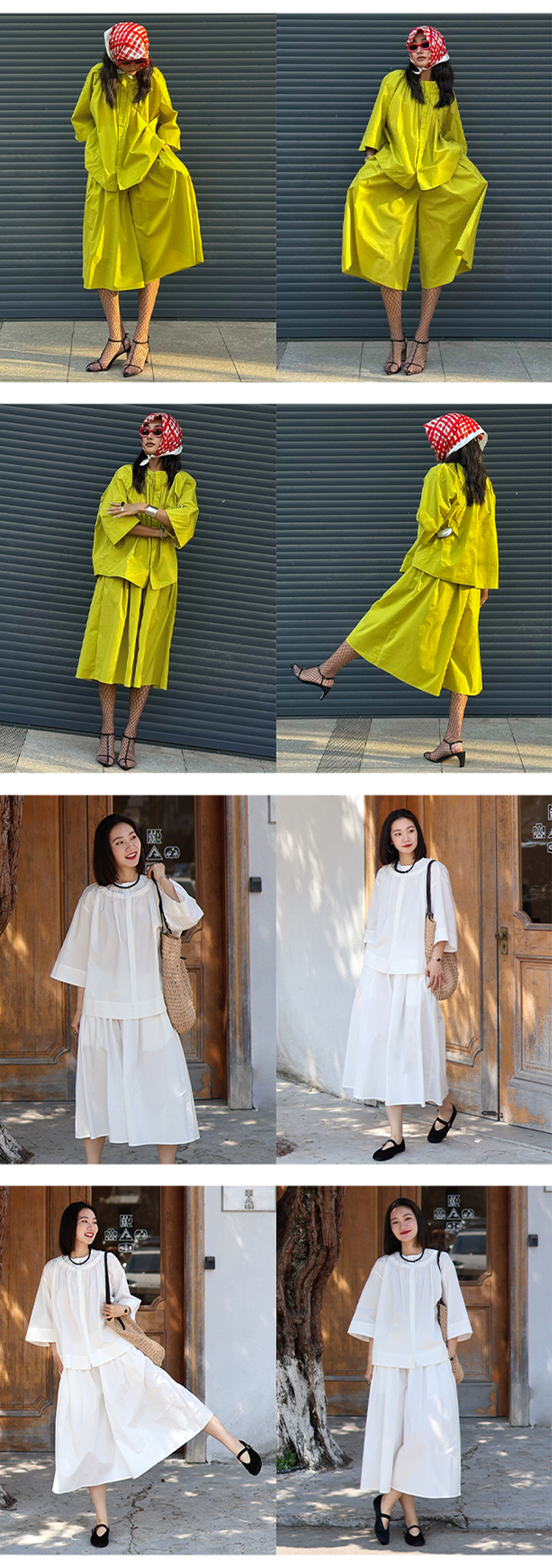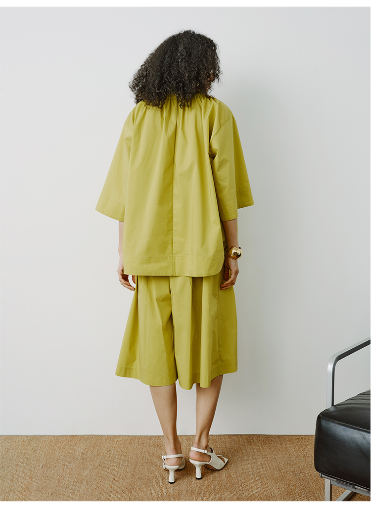HIDEMI【当当同款】 浅春系甄选长绒棉极简设计感花苞压褶圆领廓形衬衫裙裤套装 白色/有机青柠绿 衬衫/裙裤